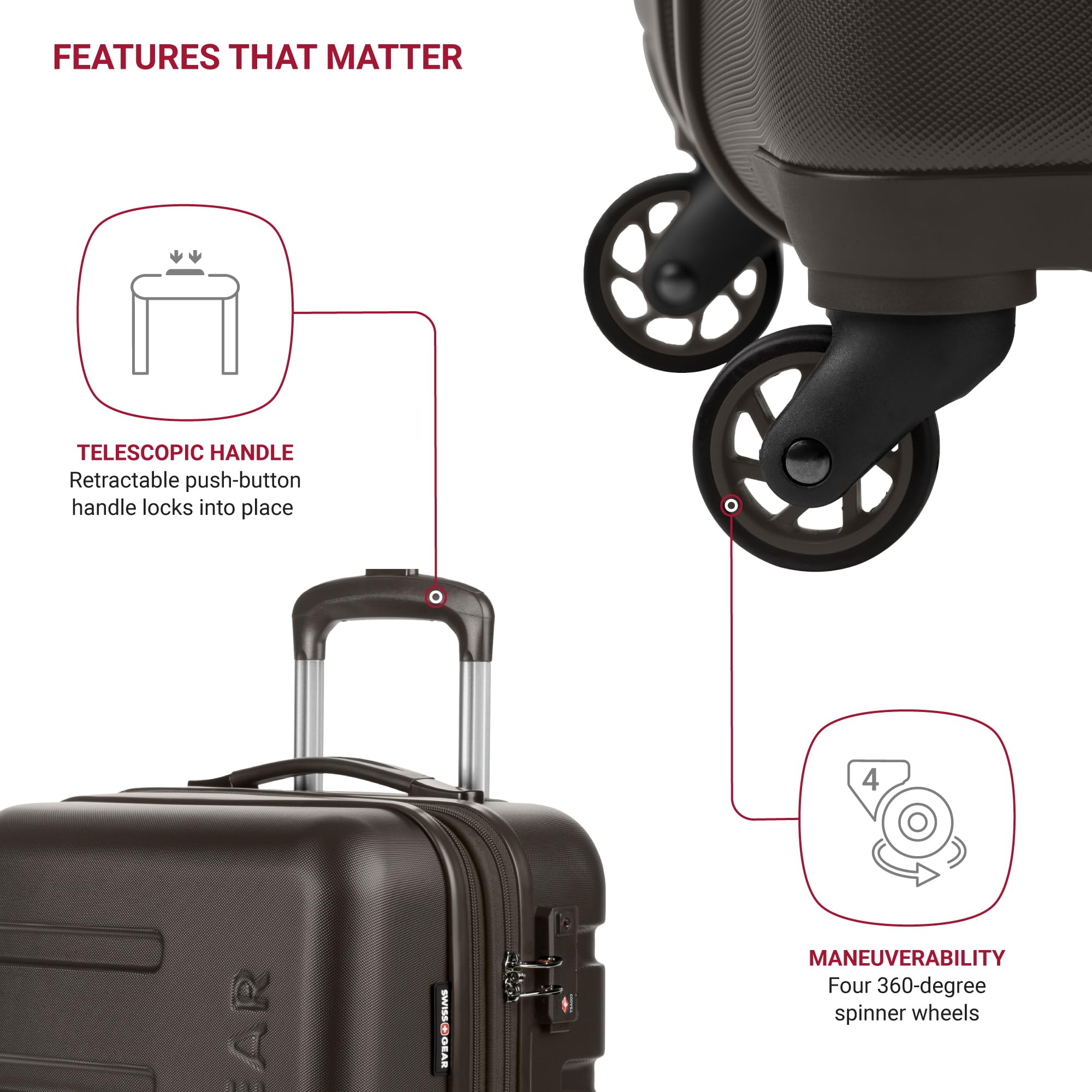 Four 360-Degree Multi-Directional Spinner Wheels: Built with maximum maneuverability in mind so you can navigate busy airports and small spaces with ease