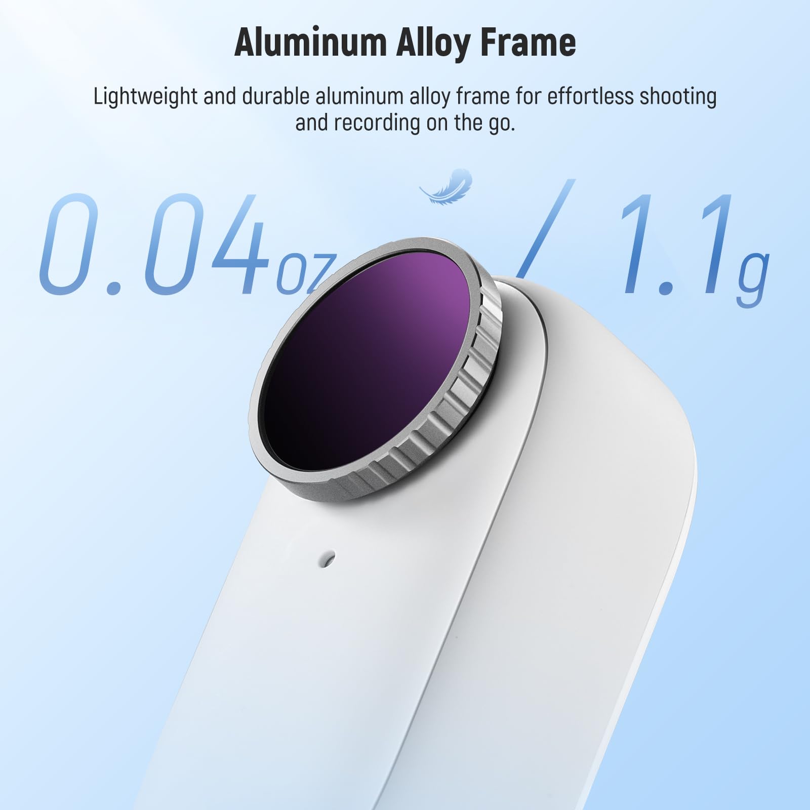 【Quick & Easy Installation】 Remove the original lens protector and twist on for quick installation. The aluminum construction of the filter frame ensures durability, with a lightweight design of just 0.04oz/1.1g. The black anodized threads and patterned knurls allow for effortless setup and precise rotation