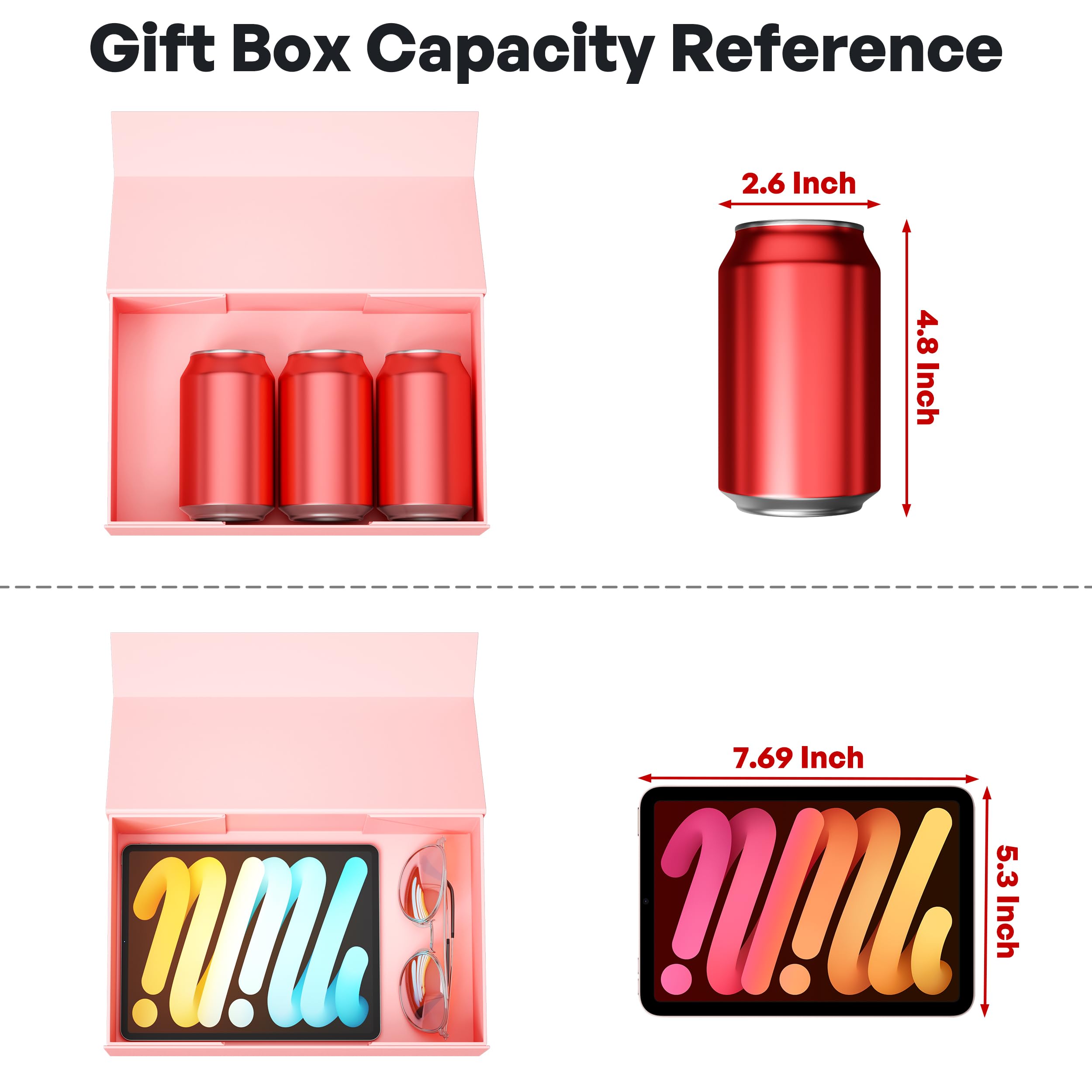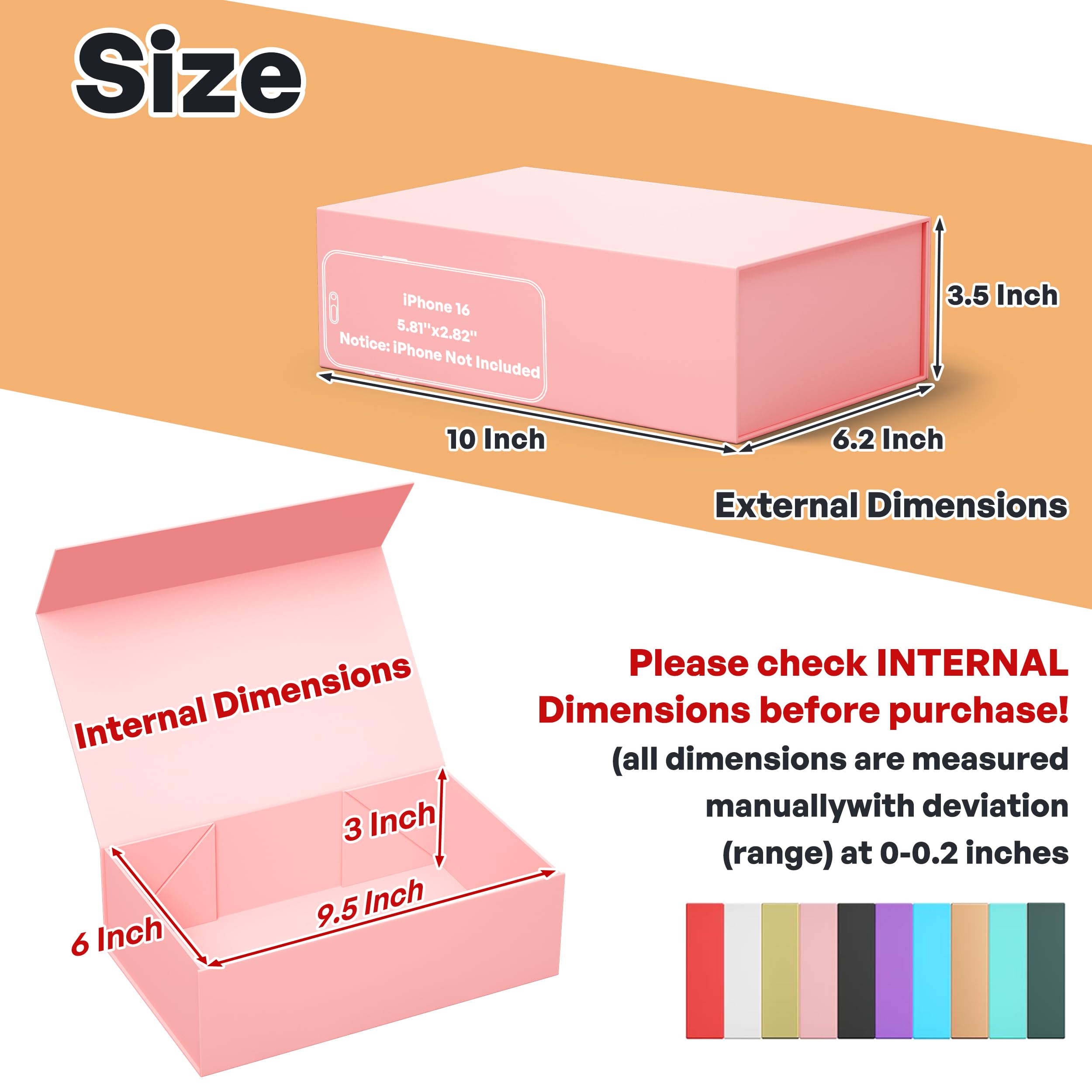 🎁SlZE - Gift boxes for presents External dimensiong 10x6.2x3.5 inches (Internaldimensions are 9.5x6x3 inches),Collapsible gift box can holdchocolates, candies, cosmetics, perfumes, jewelry, candles, cups, souvenirs orsmaller clothing accessories and more.(all dimensions are measured manuallywith deviation (range) at 0-0.2 inches)