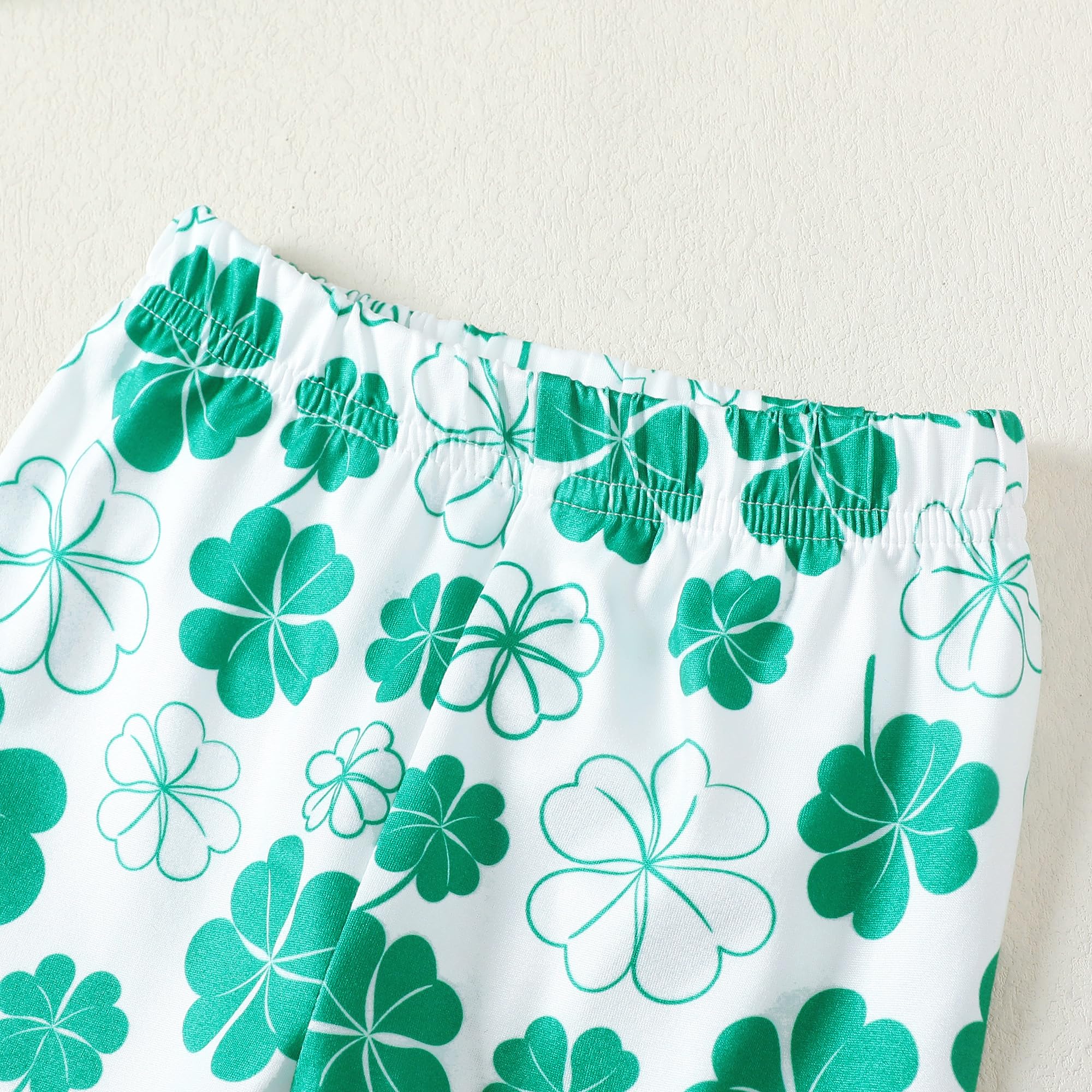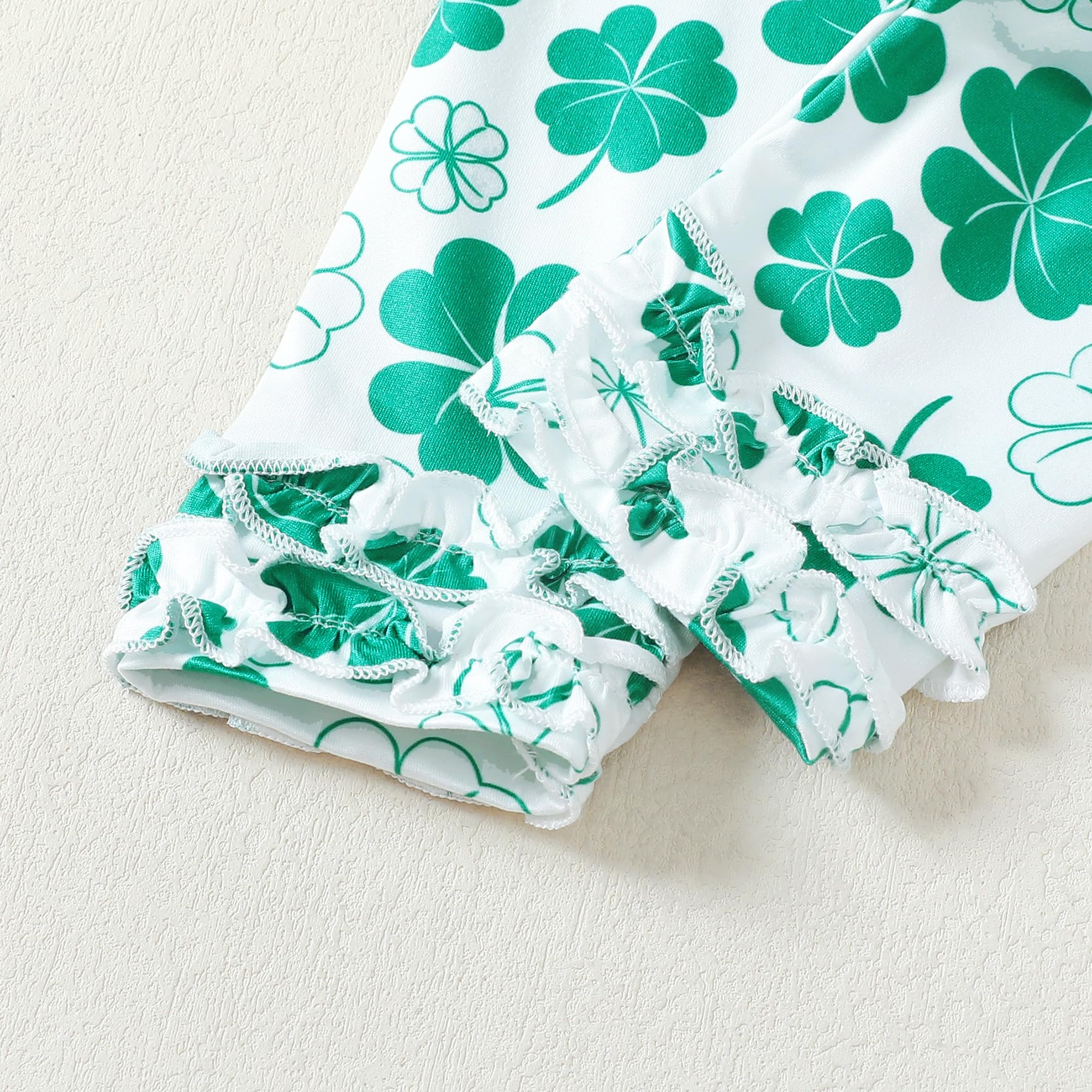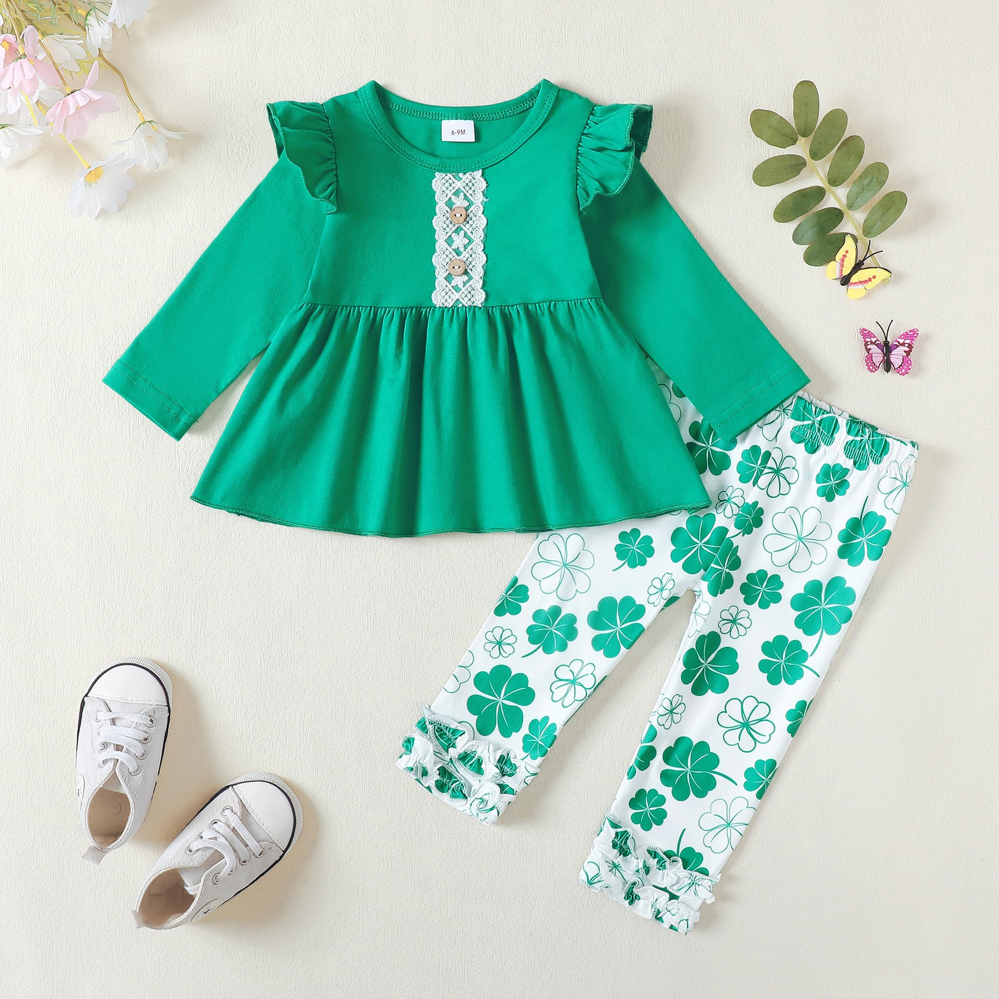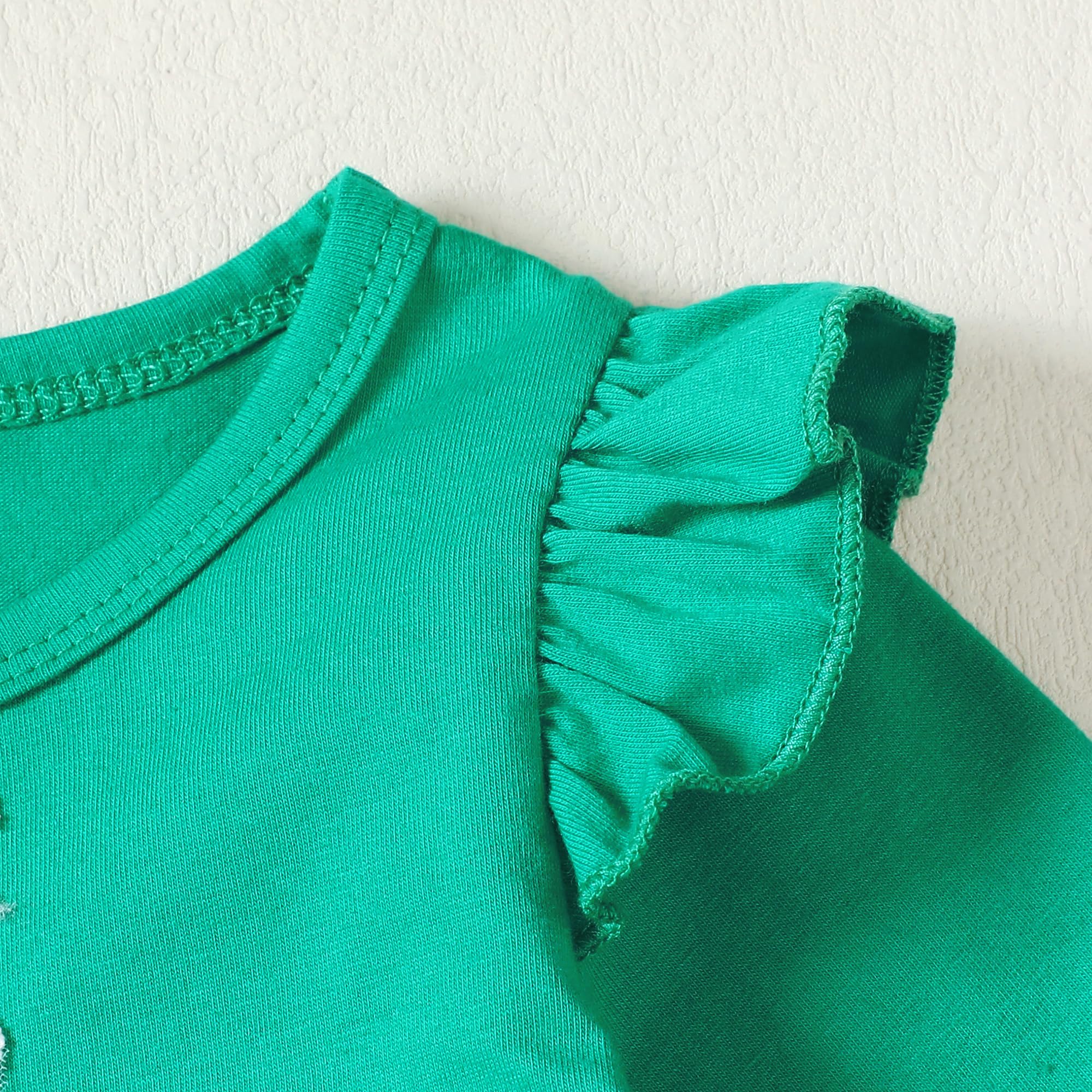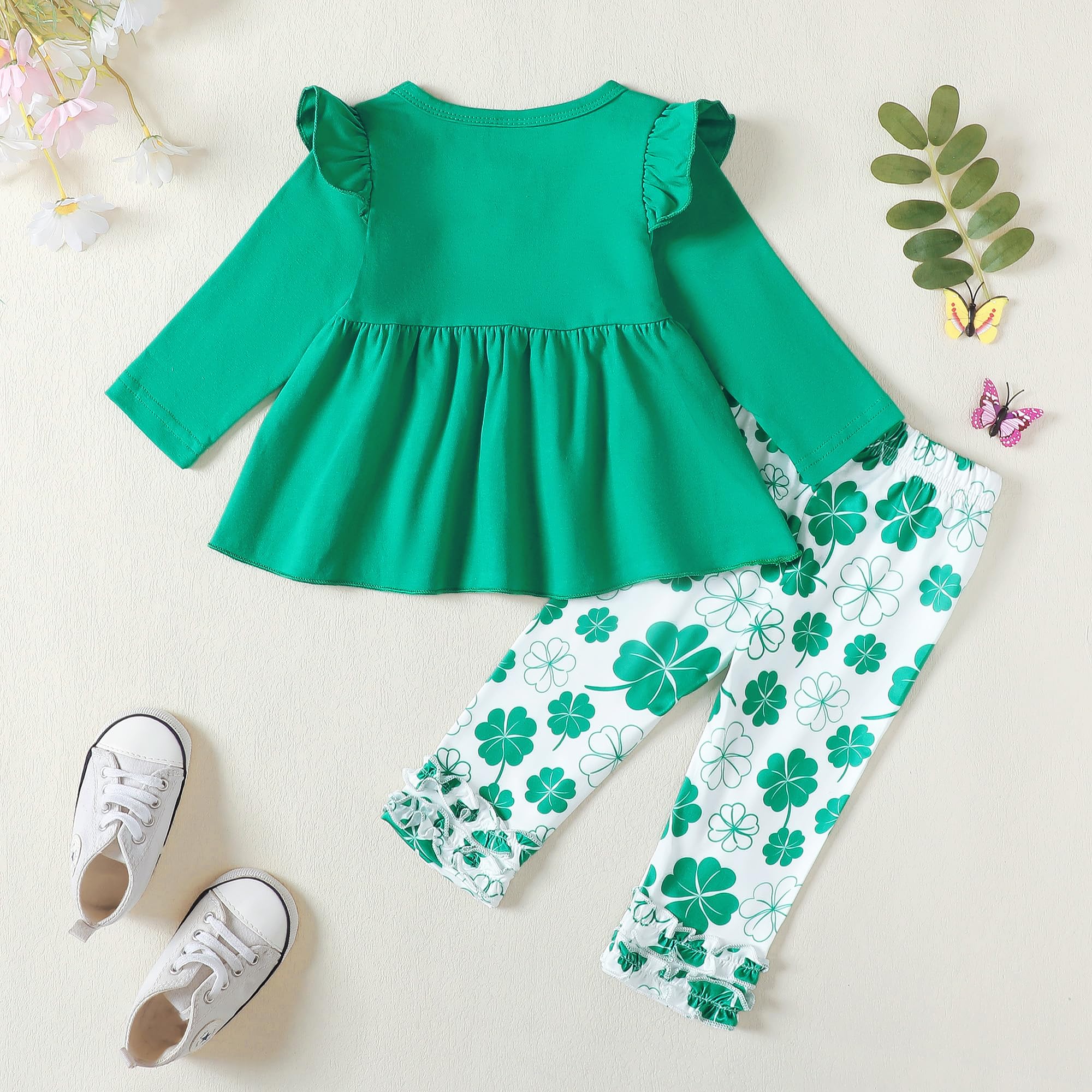 Design: Green/clover printed ruffle long sleeve shirt, match with solid pants, simple yet cute shamrock outfits for baby girl st.patrick's day gifts