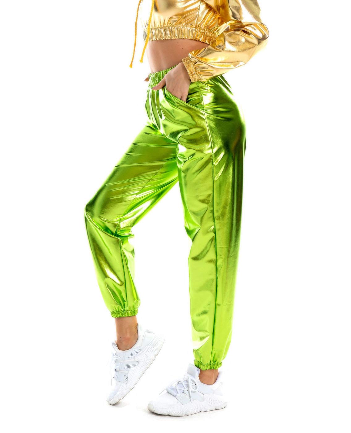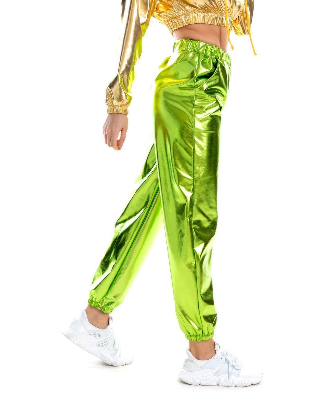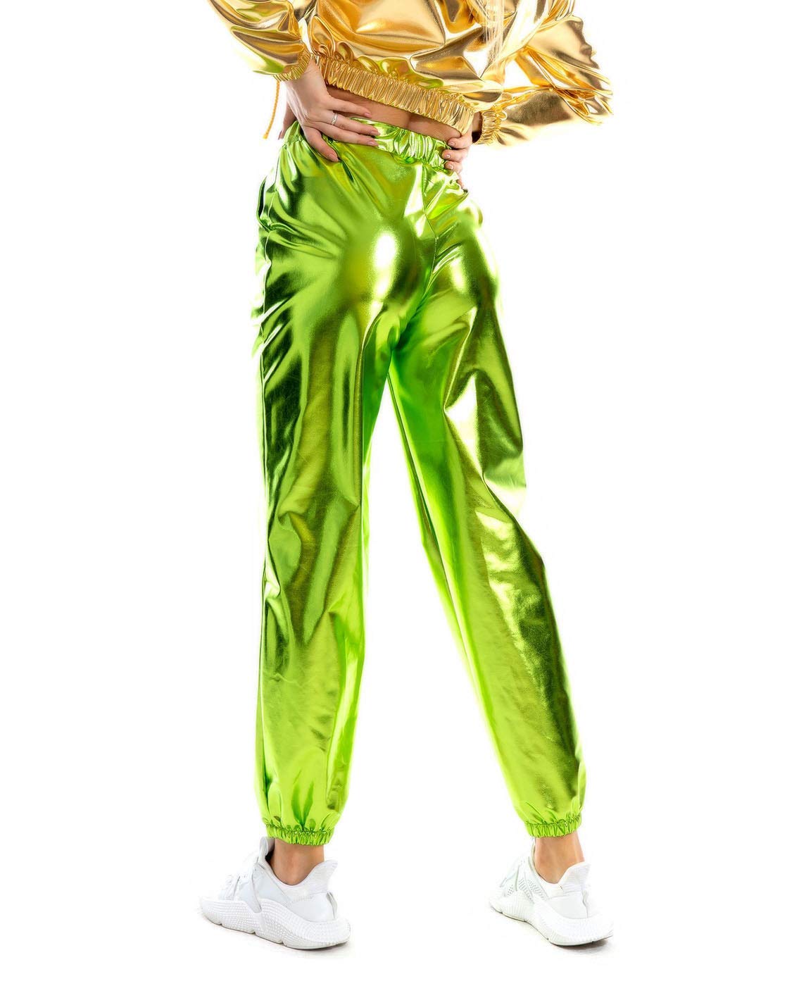 MATERIAL: The joggers pants for women are made polyester+Spandex, comfy to skin. Loose Leg, Lightweight, elastic High waisted, beam foot pants with Pocket.Cute metallic shiny holographic long pants are an important piece of clothing to have in your closet!