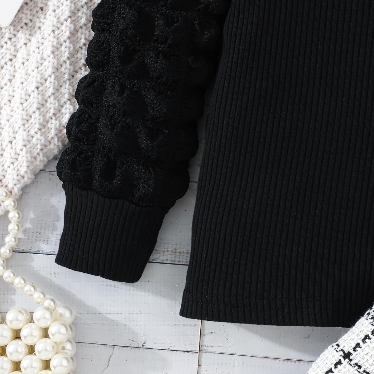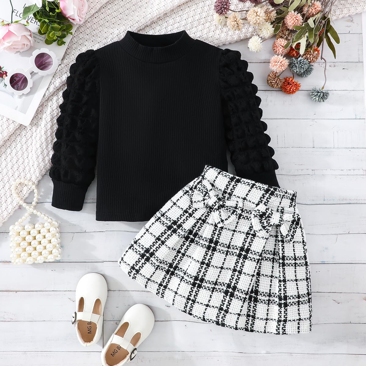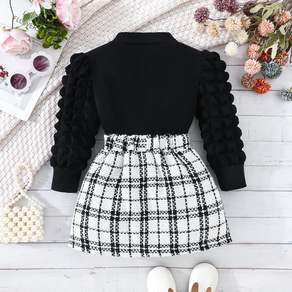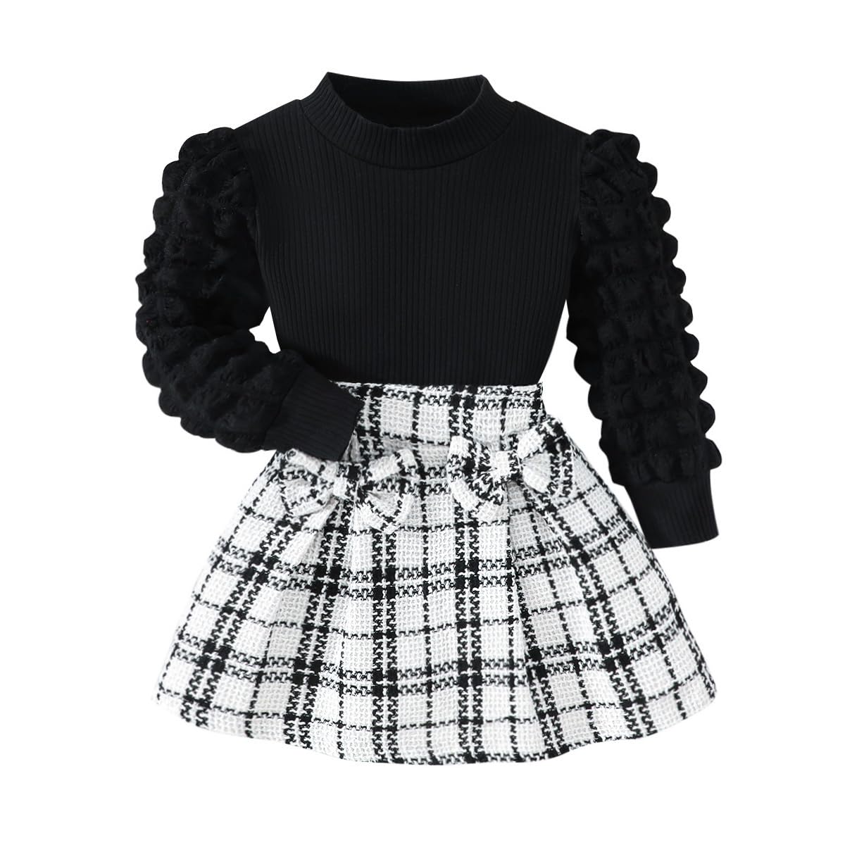 Feature: Fall outfits for girls,cute lantern puff sleeve, classic vintage black plaid Skirt,comfy ribbed shirt and tweed plaid skirt set, girls plaid skirt with delicate bowknot decoration,lovely and stylish, Suitable for your little princess in autumn winter and Christmas wear.