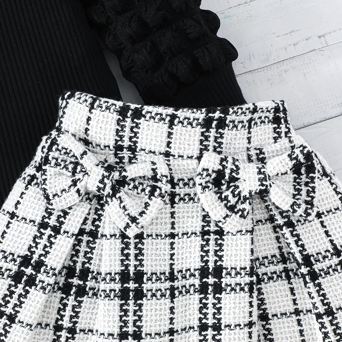 Package included:Toddler girl winter outfit,including 1* top + 1* black plaid skirts.