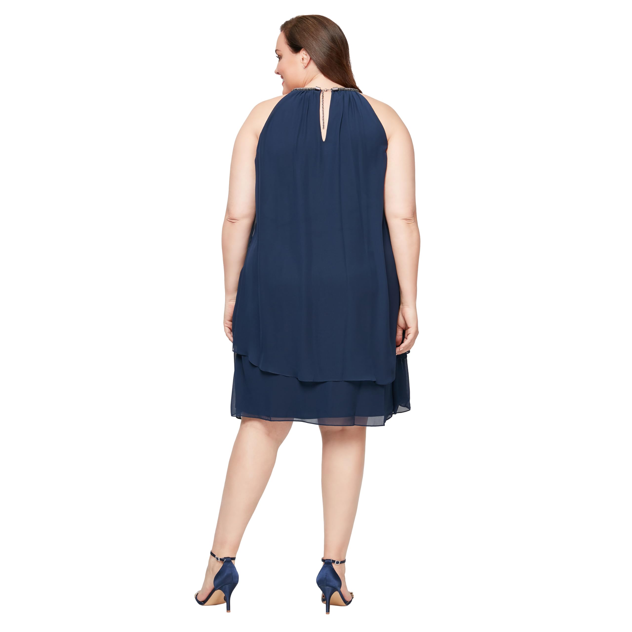 Features Sleeveless Double Layered, Chiffon Dress, Halter Neckline, Solid Color, Full Inner Lining, Round Neck, Flowy Ruffle Front, Short Dress, Lightweight, Sleeveless