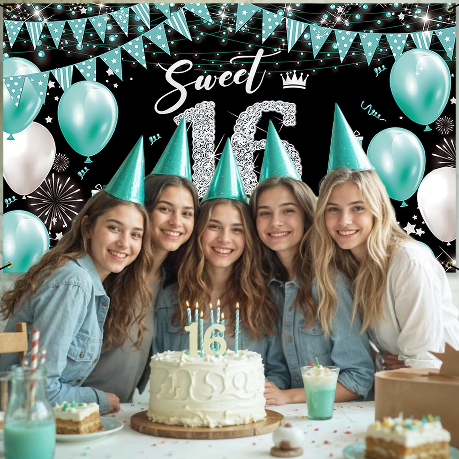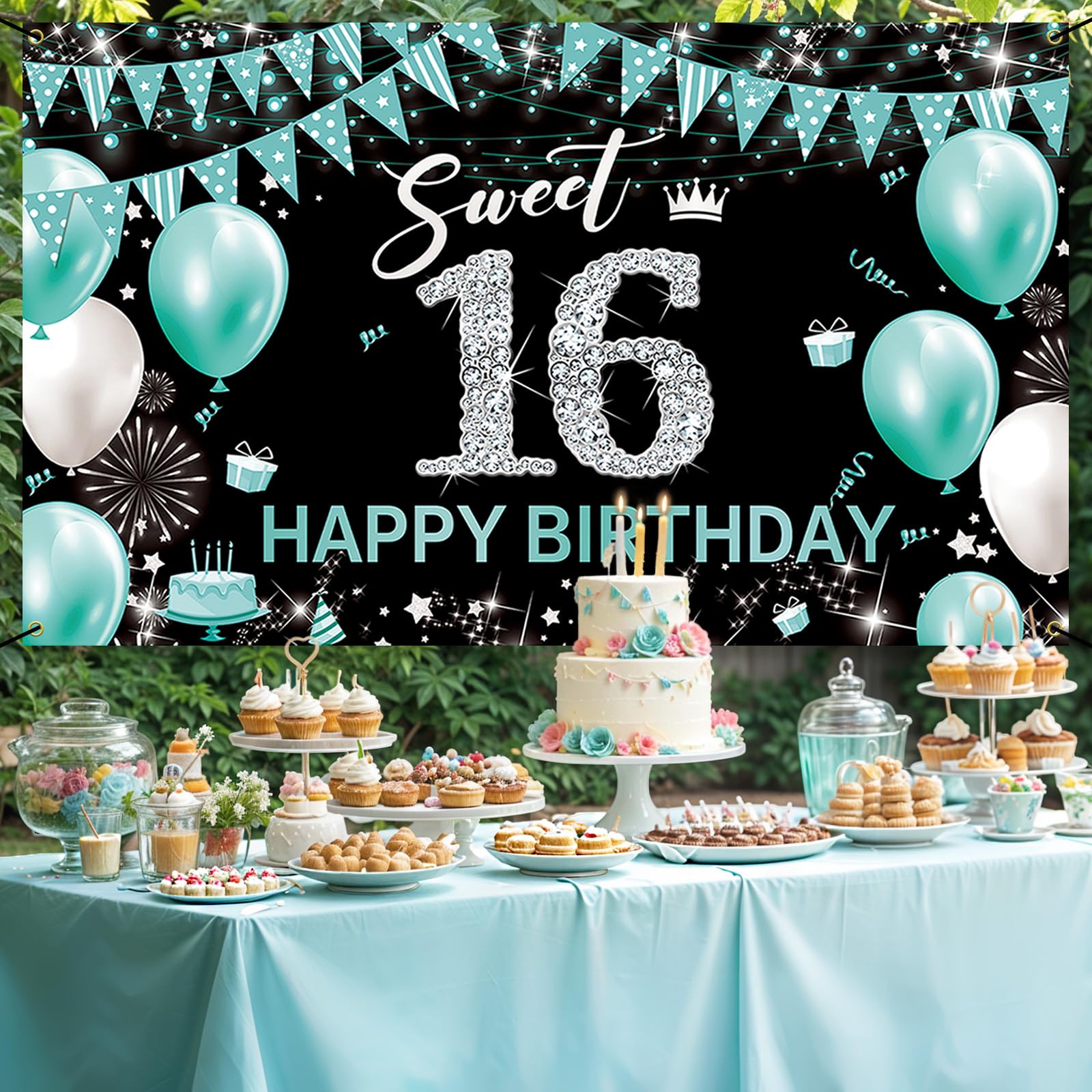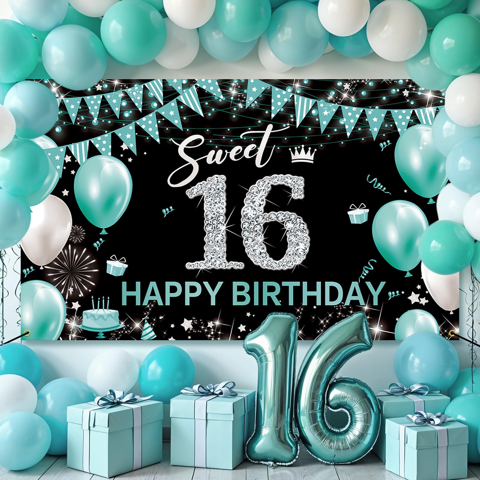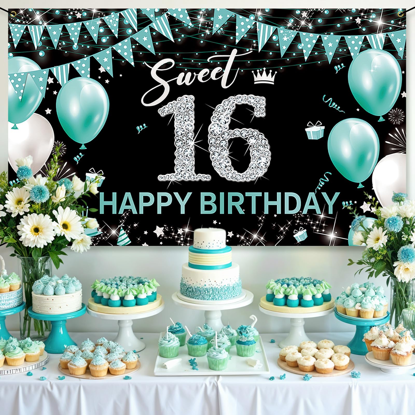 IDEAL FOR A TEAL BLUE 16TH BIRTHDAY - With its vibrant and unique design, this teal blue silver sweet sixteen birthday backdrop banner is perfect as a photo backdrop, photo booth prop, yard sign, party theme enhancer, and welcome sign. It can even be used as a tablecloth.