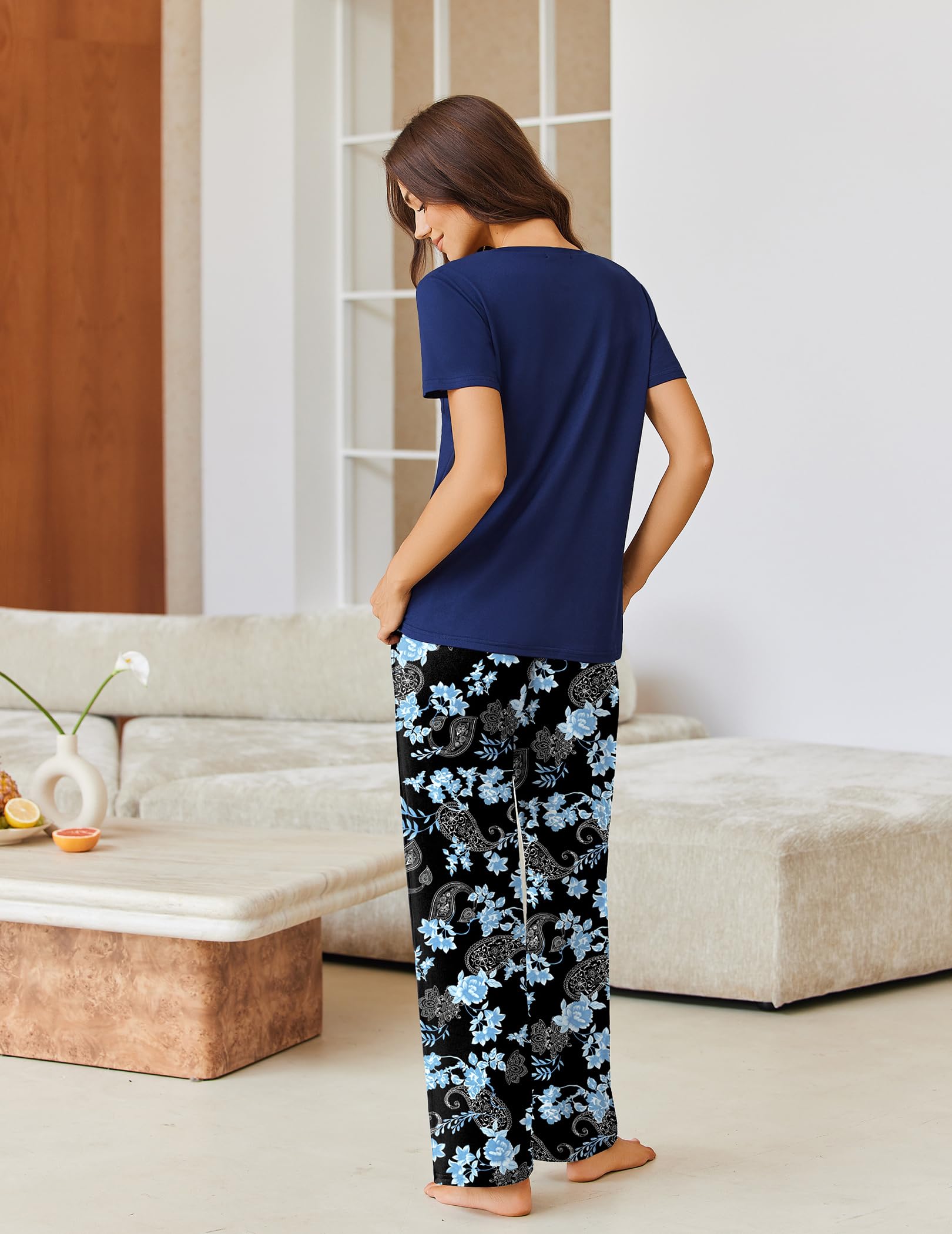 【Short Sleeve Pj Sets】2 piece lounge sets include a V-neck short-sleeve top and a pair of printed pajama pants with an elastic waist. The PJ top features a printed chest pocket, adding a touch of chic whimsy to the ensemble
