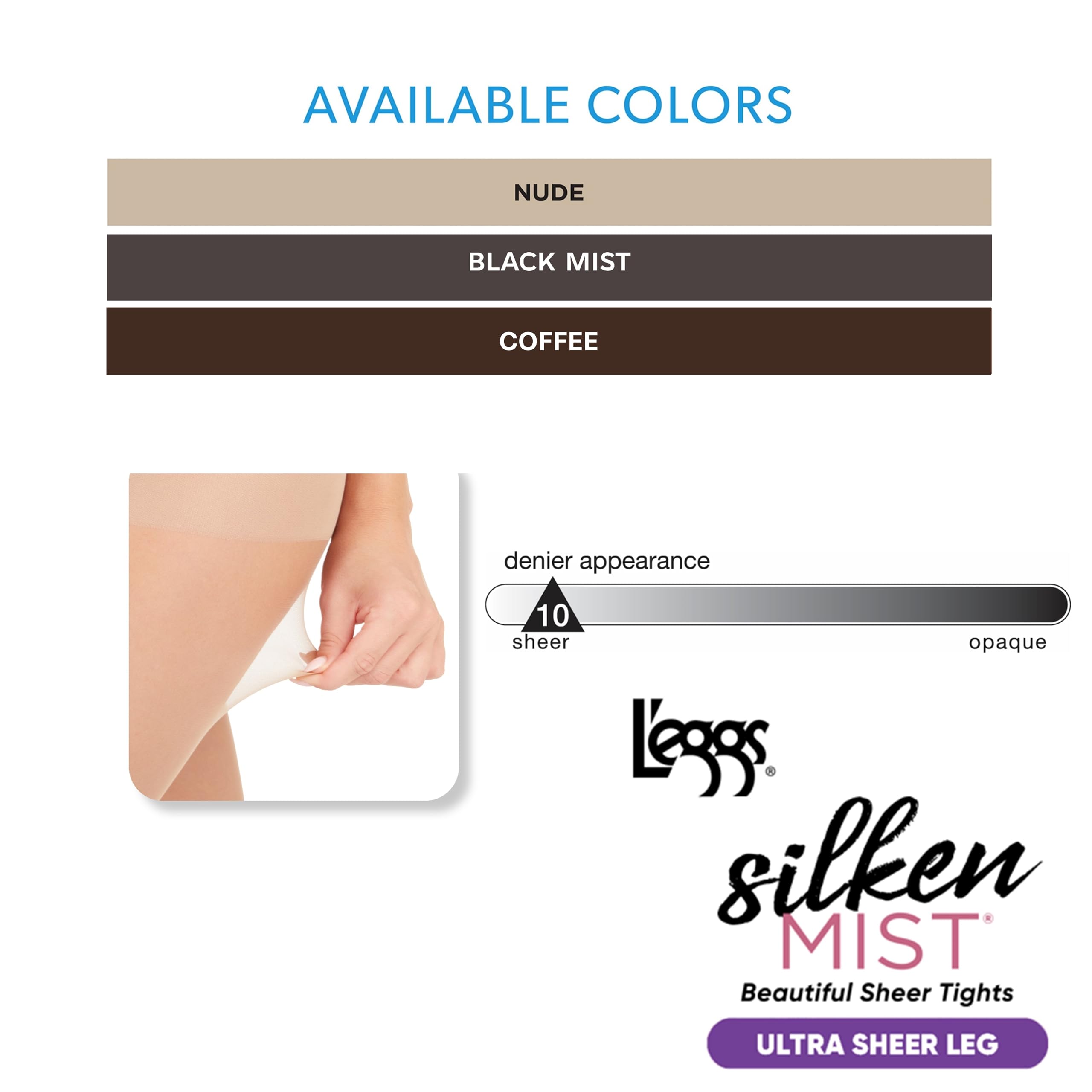EVERYDAY DENIER: L'eggs Silken Mist Tights, feature a delicate 10 denier sheer design that offers light, elegant coverage while enhancing your look by subtly concealing imperfections, creating a smooth and polished foundation for any outfit. Pack of 1