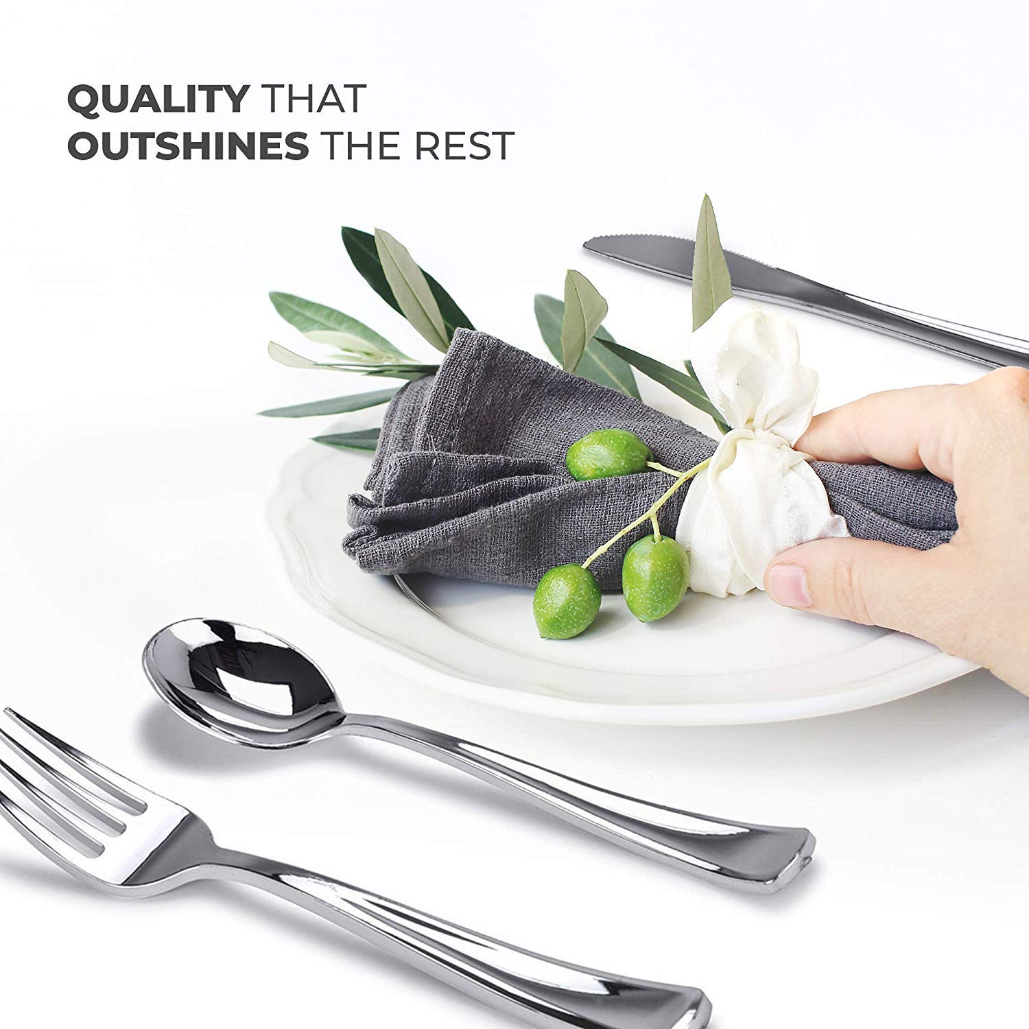 BPA Free Premium Quality: This silver cutlery set includes plastic forks, spoons, and knives made from sturdy heavy duty plastic.