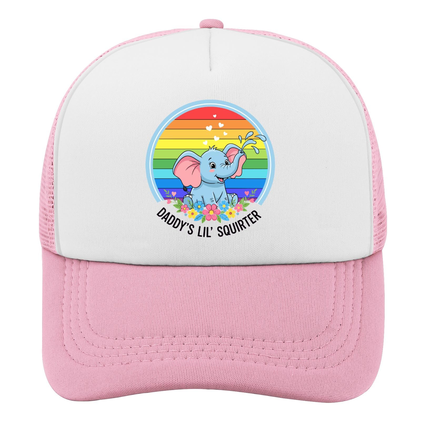 DESIGN FEATURES: Pink and white trucker hat with mesh back panels for ventilation, featuring a cute elephant design with rainbow background and floral accents