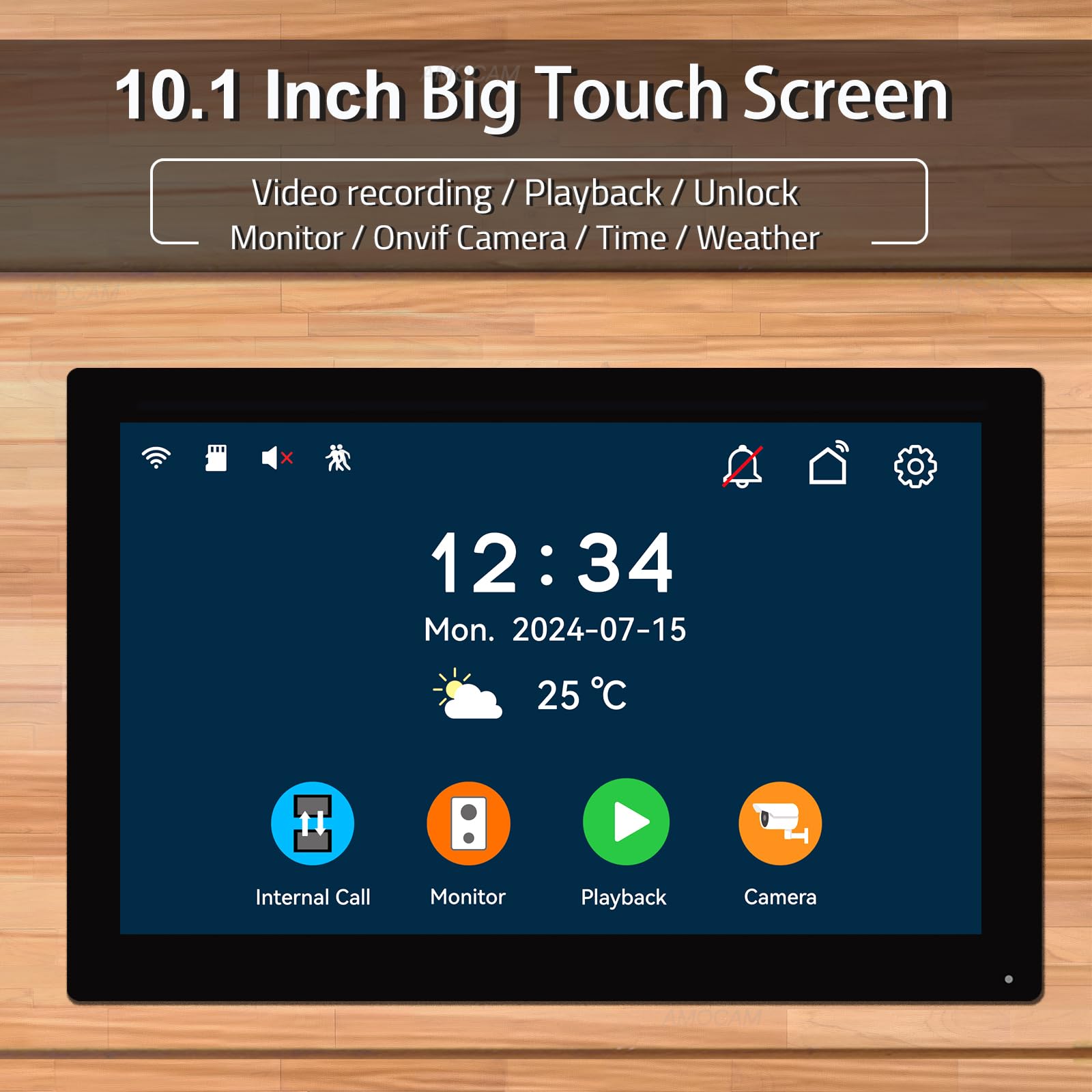 🔔【10.1 Inch Touch Screen and 1080P Doorbell Camera】10.1 Inch IPS monitor with 32G micro SD card, touch key operation, hand-free, support Wifi connect to TUYA APP. 1080P doorbell camera with weaterproof cover and IC card area, built-in infrared sensor, 130º wide angle, night vision, rainproof, dustproof and vandal proof. 2-wire power supply, It can connect all 12V electronic locks.