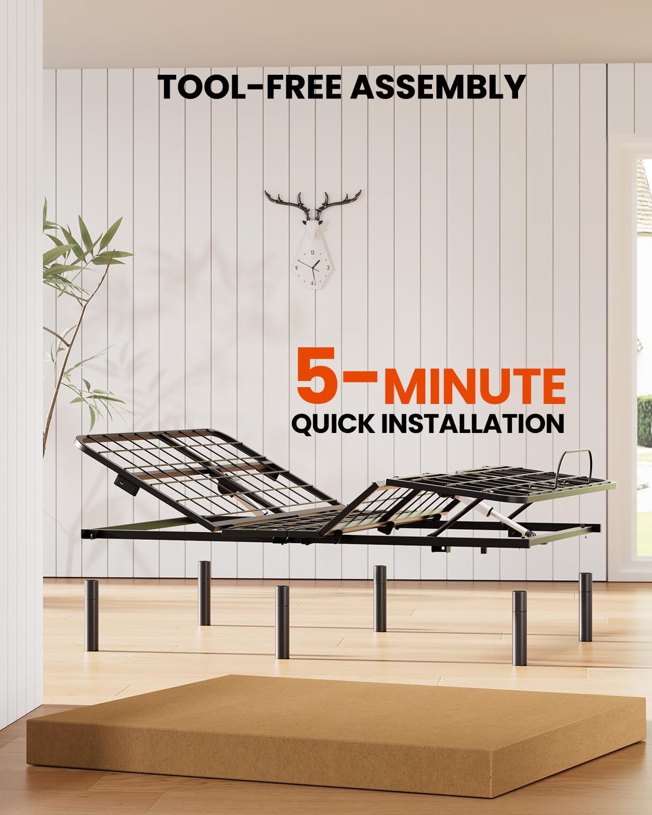 Quick 5-Minute Setup: Setting up your electric bed frame is hassle-free without the need for tools. Simply secure the bed legs, connect the AC power cord and remote control, then insert the mattress retainer bar. Spend less time on assembly and more time enjoying your new adjustable bed foundation.
