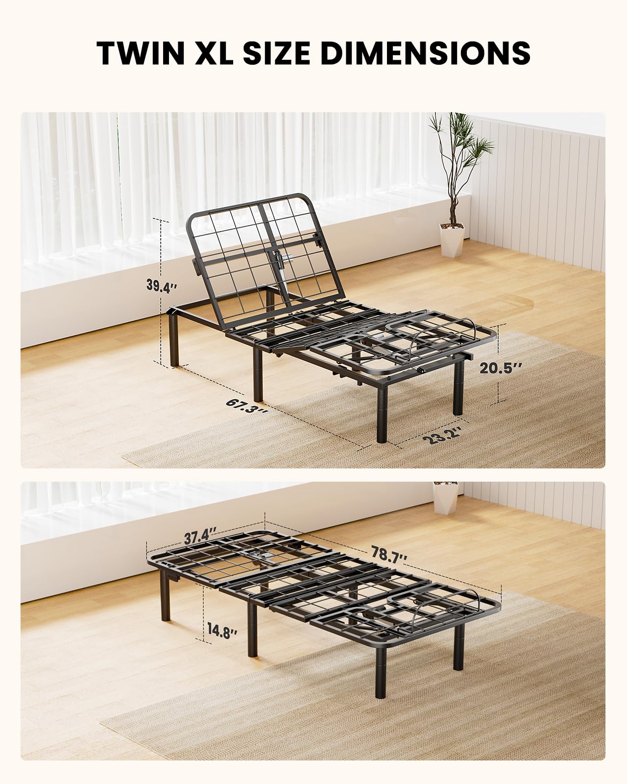 Adjustable Head & Foot Angles: This twin XL adjustable bed base can elevate your head up to 60° and feet up to 40° for customized sleep and relaxation. Whether you're watching TV, reading, reducing snoring, or enjoying the Zero Gravity setting for enhanced circulation and pressure relief, this bed frame adapts effortlessly to your needs.