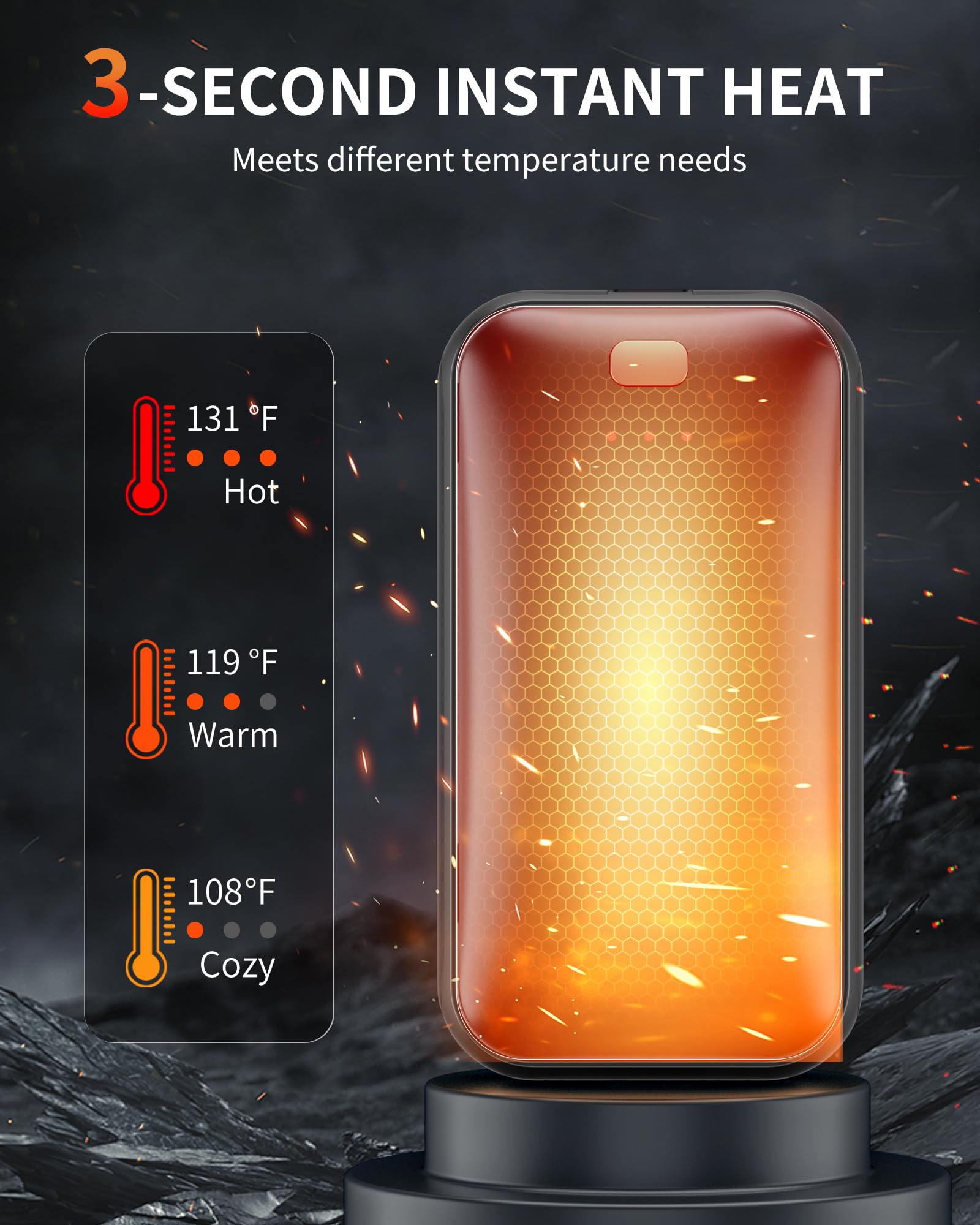 【3 HEAT Settings】 Enjoy rapid heating in just 3 seconds with three adjustable temperature levels: Cozy (95-107.5°F) for indoor use, Warm (104-118.5°F) for daily activities, and Hot (118.5-131°F) for outdoor warmth.