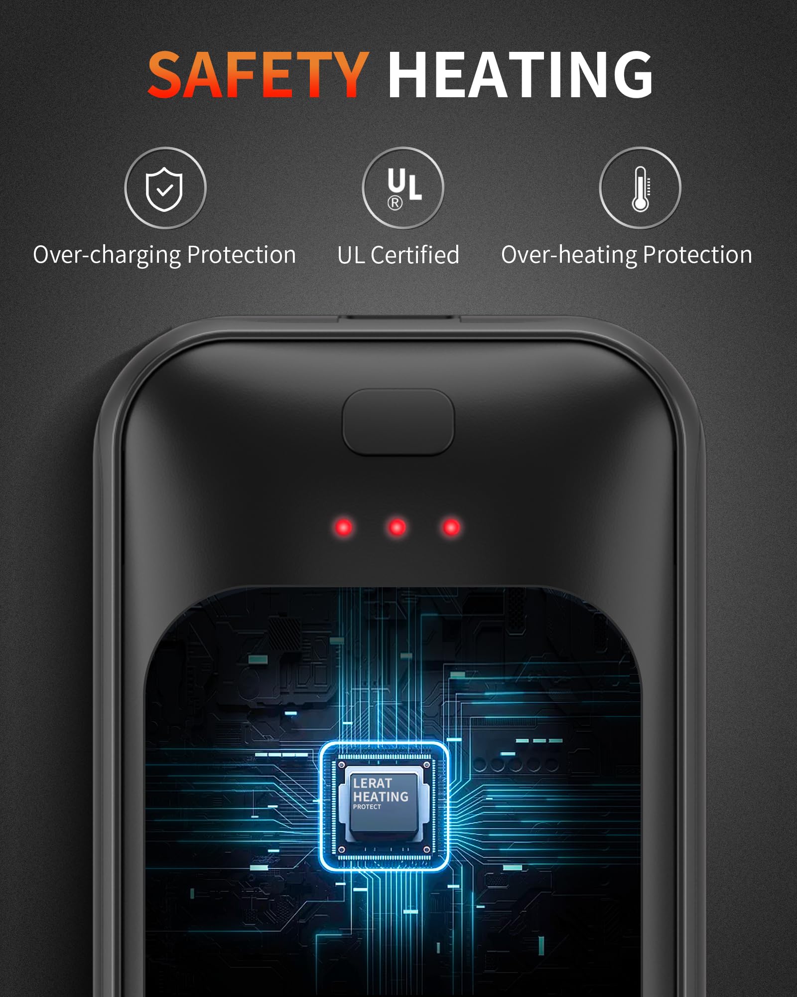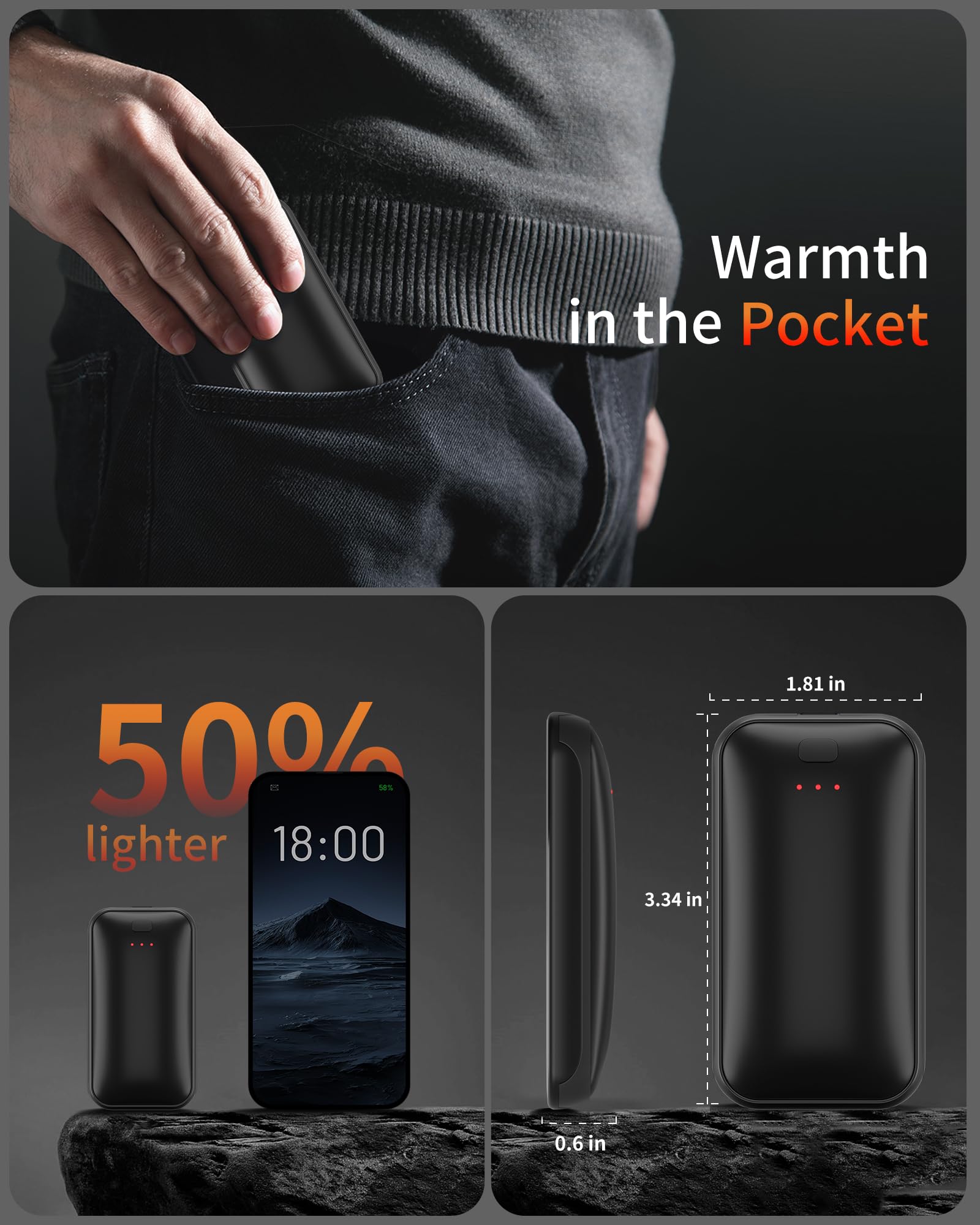 【SAFE & RELIABLE】 Made with advanced lithium batteries, aluminum, and ABS materials, our hand warmers meet rigorous UL, CE, and FCC safety standards. With multiple protection features and precise temperature control, you can use them confidently.