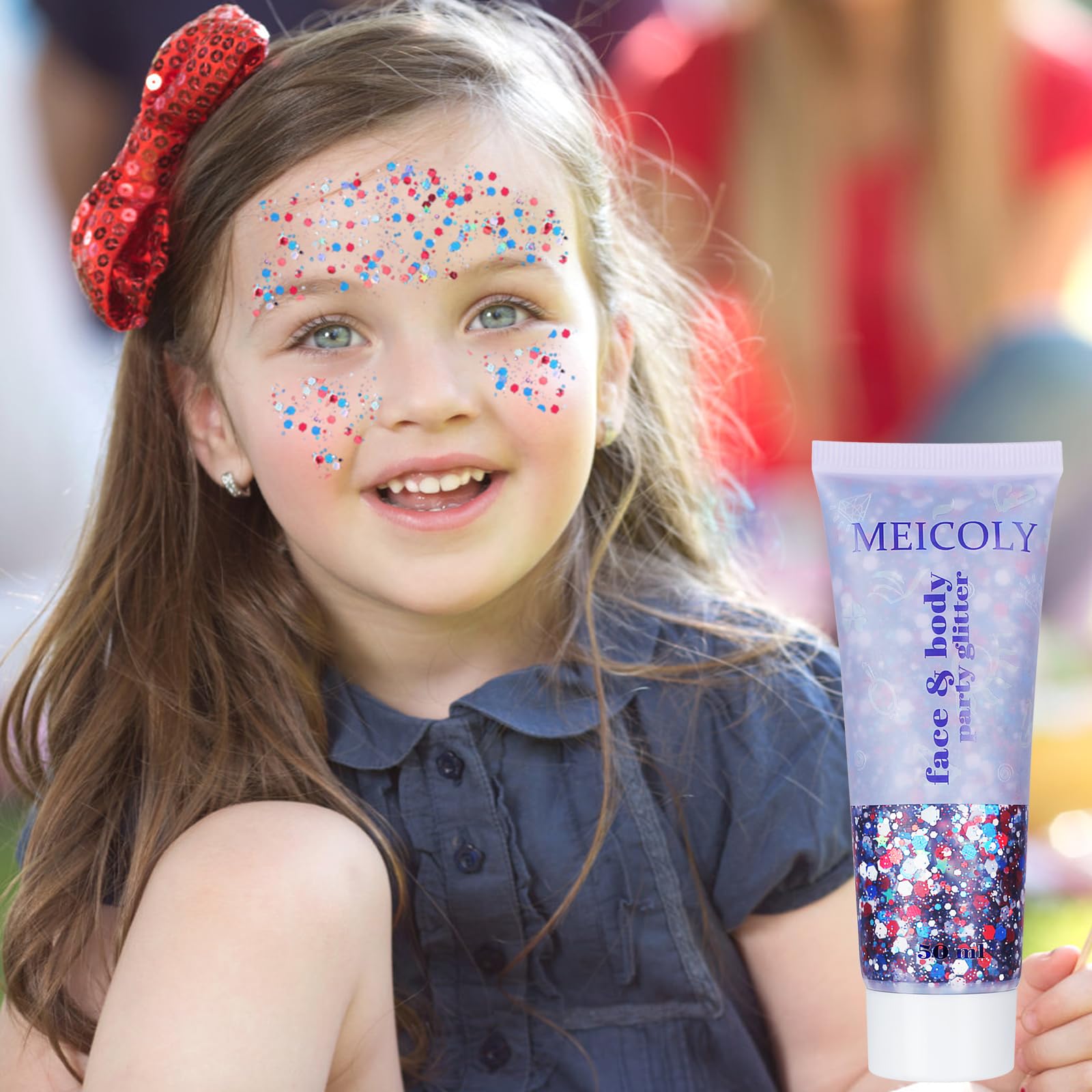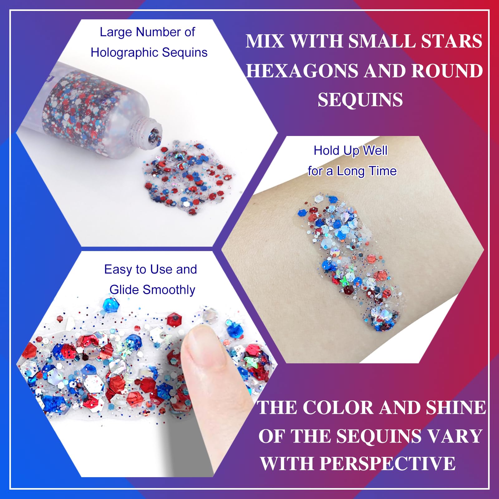 ⭐Red White and Blue Body Glitter: MEICOLY pride body glitter contains red blue and white sequins in the glitter gel,used on face body or hair to express the spirit of patriotism for your country.Features large number of glitter sequins,the color and shine of the laser sequins vary with the perspective.Great USA body glitter for Independence Day,America's Patriotic Events 4th of July,National Day,Presidents' Day,School Patriotic Activities,International Competition,Parade,Veterans Day,Memorial Day