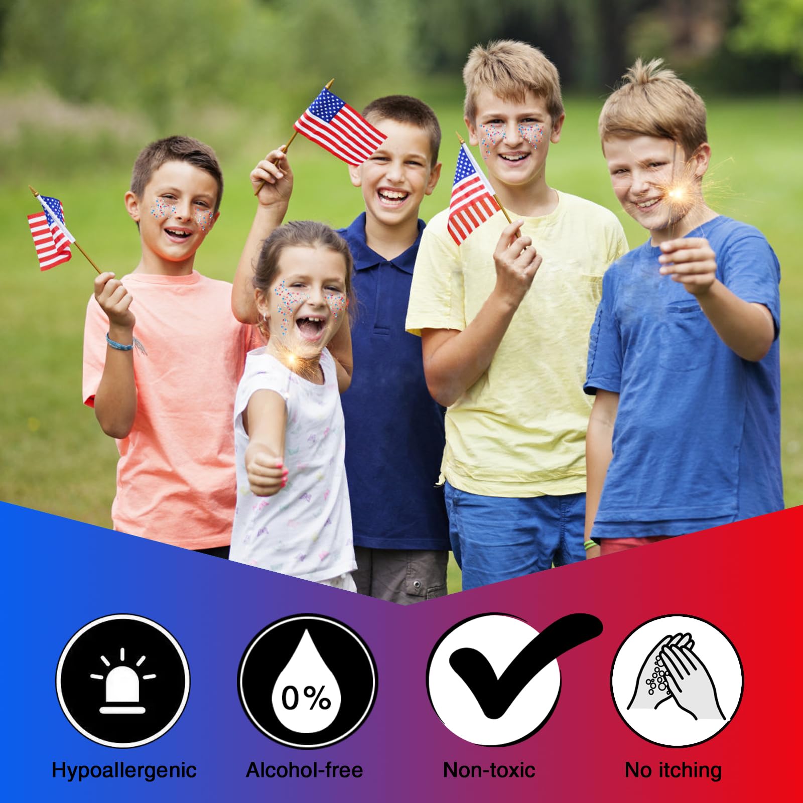 ⭐Natural Ingredients --- Our Fourth of July body glitter comes with safe formula, hypoallergenic,alcohol-free,non-toxic,the glitter gel is safe and non-irritating,you do not have to worry about glue irritating your skin,gel of the glitter can protect your skin from sequin,4th of july outfits for girls,4th of july accessories for kids