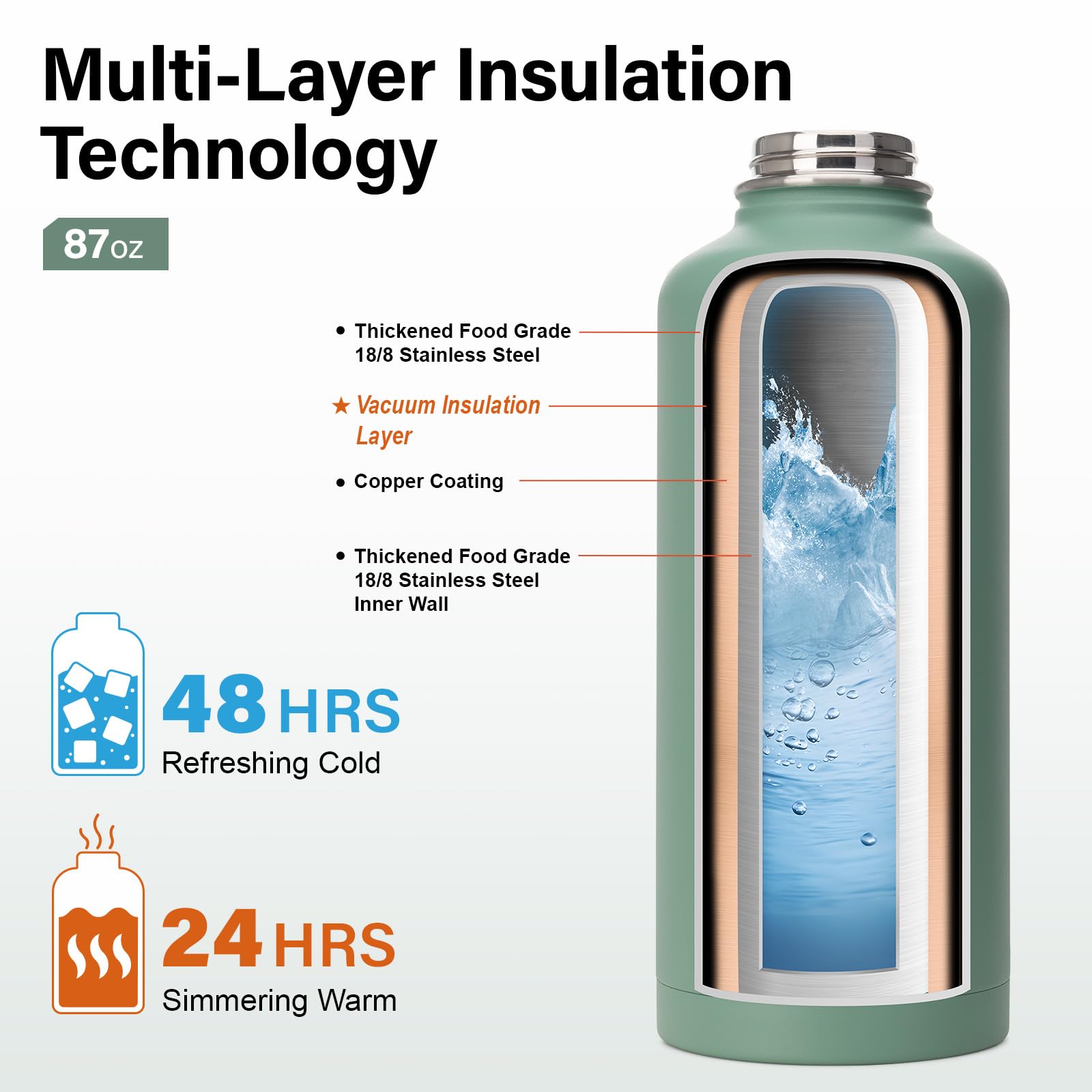 THE MULTI-LAYER INSULATION TECHNOLOGY FEATURES: the first layer is a thick food-grade 18/8 stainless steel inner wall; the second layer has a copper plating that reduces heat transfer; the third layer is a vacuum layer that prevents heat loss. As a result, you can enjoy an insulated water bottle that keeps beverages cold for up to 48 hours and hot for up to 24 hours, making it perfect for any adventure, whether it's a long hike or a busy workday.