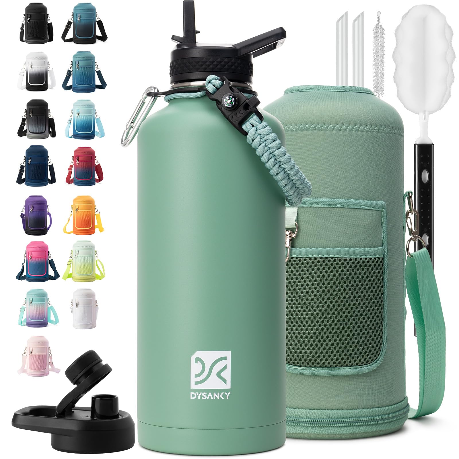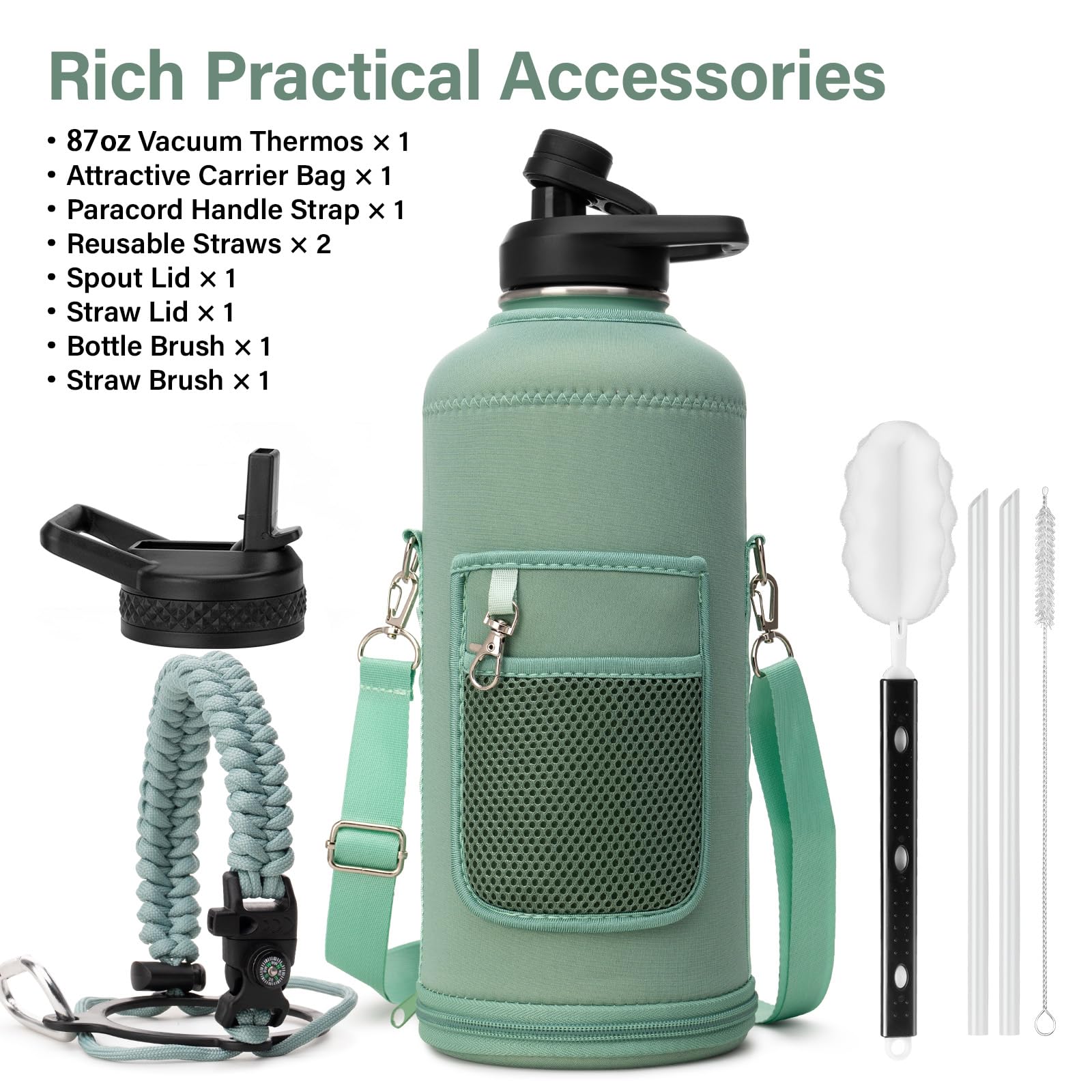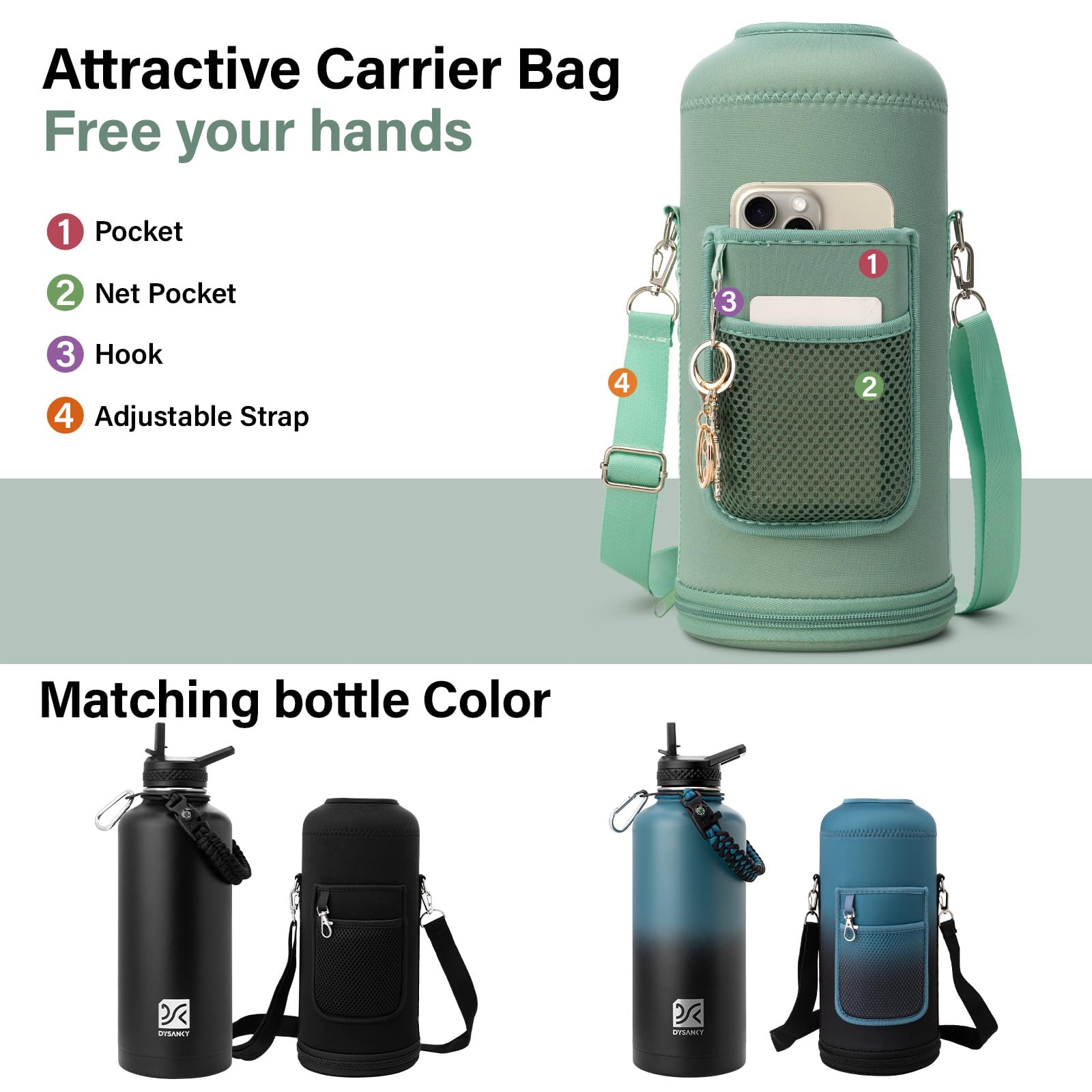 VERSATILE AND STYLISH CARRIER BAG:The colorful water bottle carrier bag is designed to match the bottle's body, adding a touch of flair while providing practical functionality. The shoulder strap and carabiner make it easy to carry and hang, whether you're out on a hike or running errands. Plus, the small storage bag for your phone and a hook for keys make this bottle even more versatile.