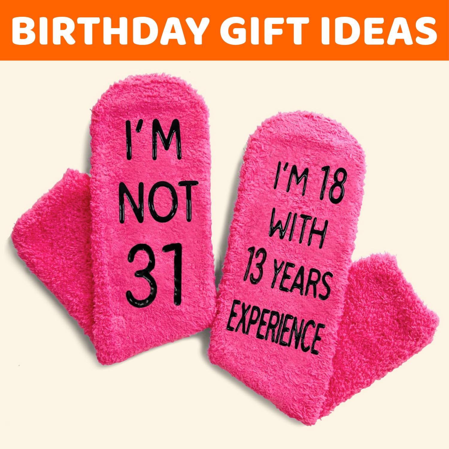 31ST BIRTHDAY GIFT IDEAS: Celebrate with our "I'M NOT 31, I'M 18 WITH 13 YEARS EXPERIENCE" socks, good for any occasion. They are ideal for Birthday presents, Christmas surprises, or playful White Elephant gifts.