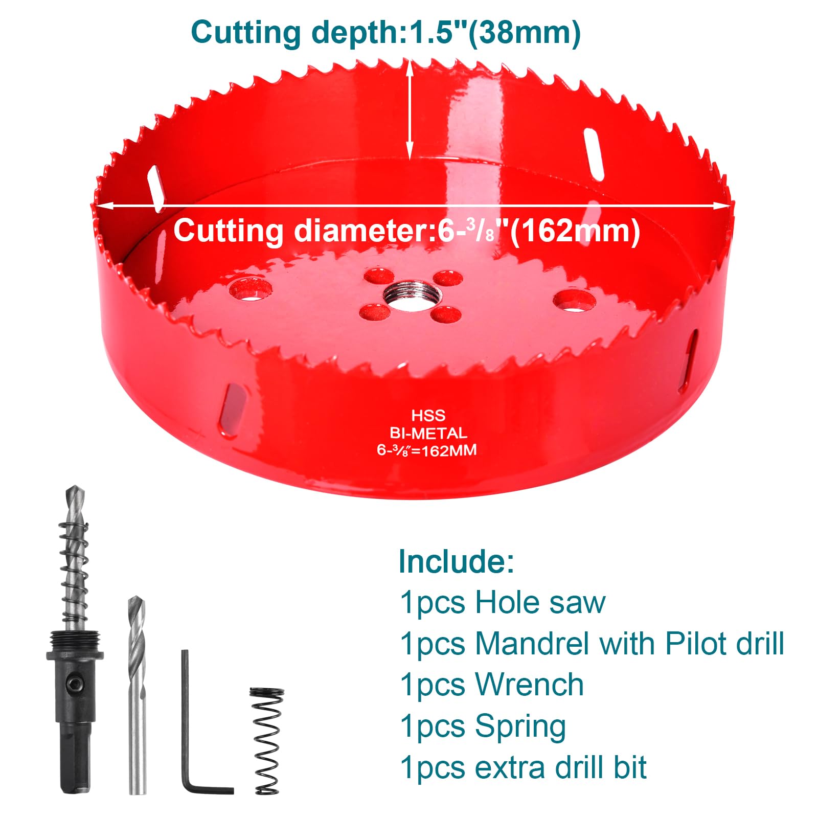 HOLE SAW: Our high-speed steel sharp cutting teeth effectively drill through metal, wood, cornhole boards, PVC board, plastic, drywall, and more. The hole saw set includes 1* 6-3/8'' hole saw, 1*arbor(with 1 drill bit), 1*drill bit for replacement, and 1*hex key. The cutting diameter is 6-3/8" / 162mm, and the opening depth is 1.5" / 38mm.