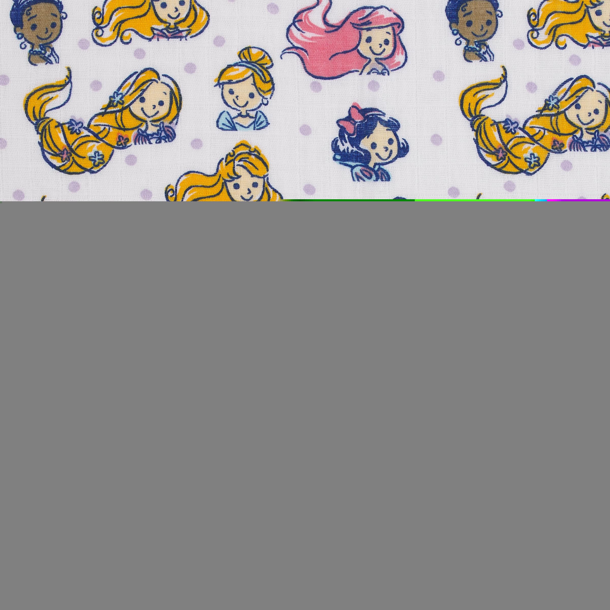 Wrap your little one in love, with the super soft Disney Princesses 3 Piece Muslin Swaddle Set! This lovely set of swaddle baby blankets measures 44" x 44" each. Features 3 prints of enchanting princesses in fun poses . . . Cinderella, Tiana, Belle, Aroura, Rapunzel, and Ariel and Snow White. One pattern is princesses smiling faces, another is the princesses in their gorgeous ball gowns and one pattern is a whimsical allover print of castles and flowers, all designed in shades of pink. aqua, green, yellow, and white. This blanket is made of 100% cotton muslin and is the perfect size for swaddling. Makes a wonderful gift for your little bundle of joy!