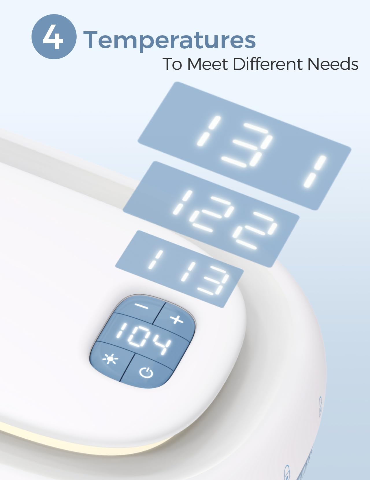 FOUR-LEVEL TEMPERATURE ADJUSTMENT: The baby wipes warmer is designed with 4 temperature options (104℉,113℉,122℉,131℉) for different usages and requirements; Choosing the most suitable temperature, allows the baby to feel comfortable during the wiping