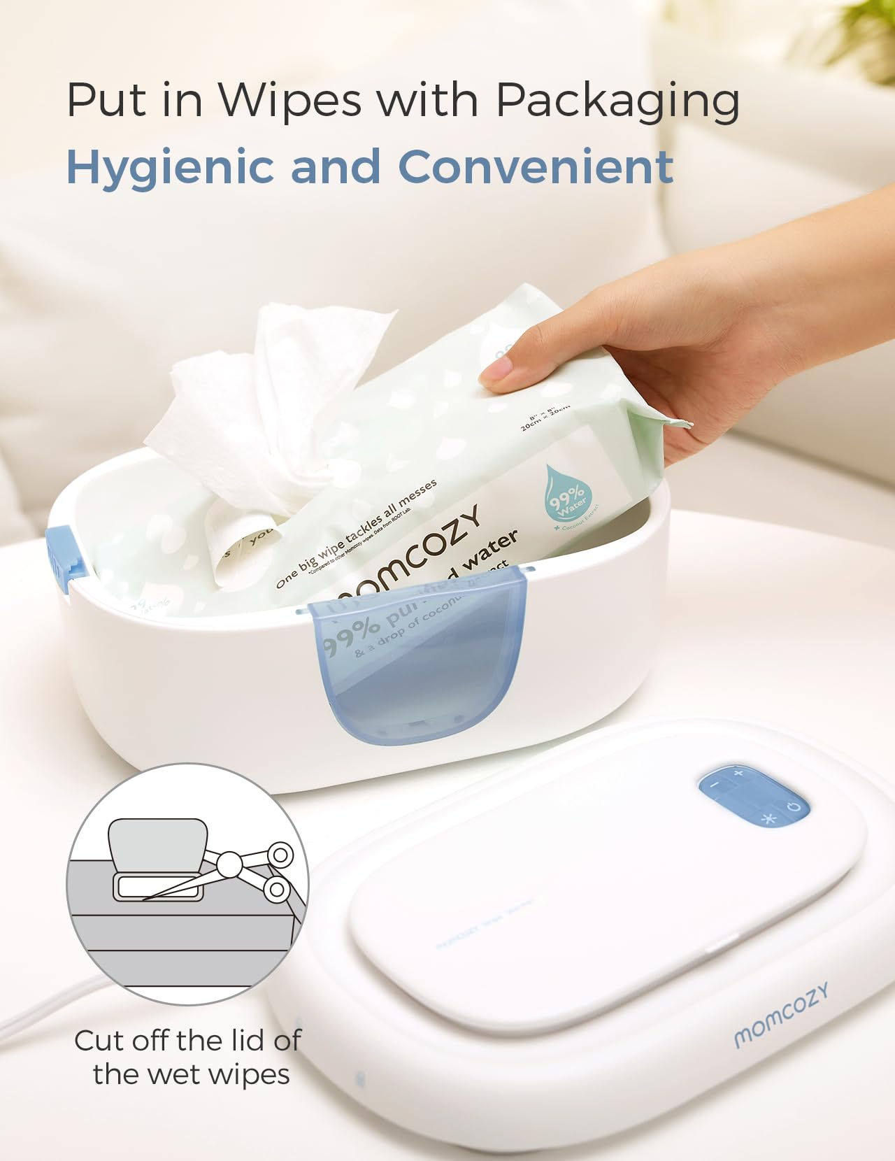 Easy to Use: Baby wipe warmer dispenser can put a whole pack of wet wipes in, no need to unpack, no need for water and sponges; the extra large size meets 90% of the wet wipes on the market, and is compatible with Momcozy extra large water wipes
