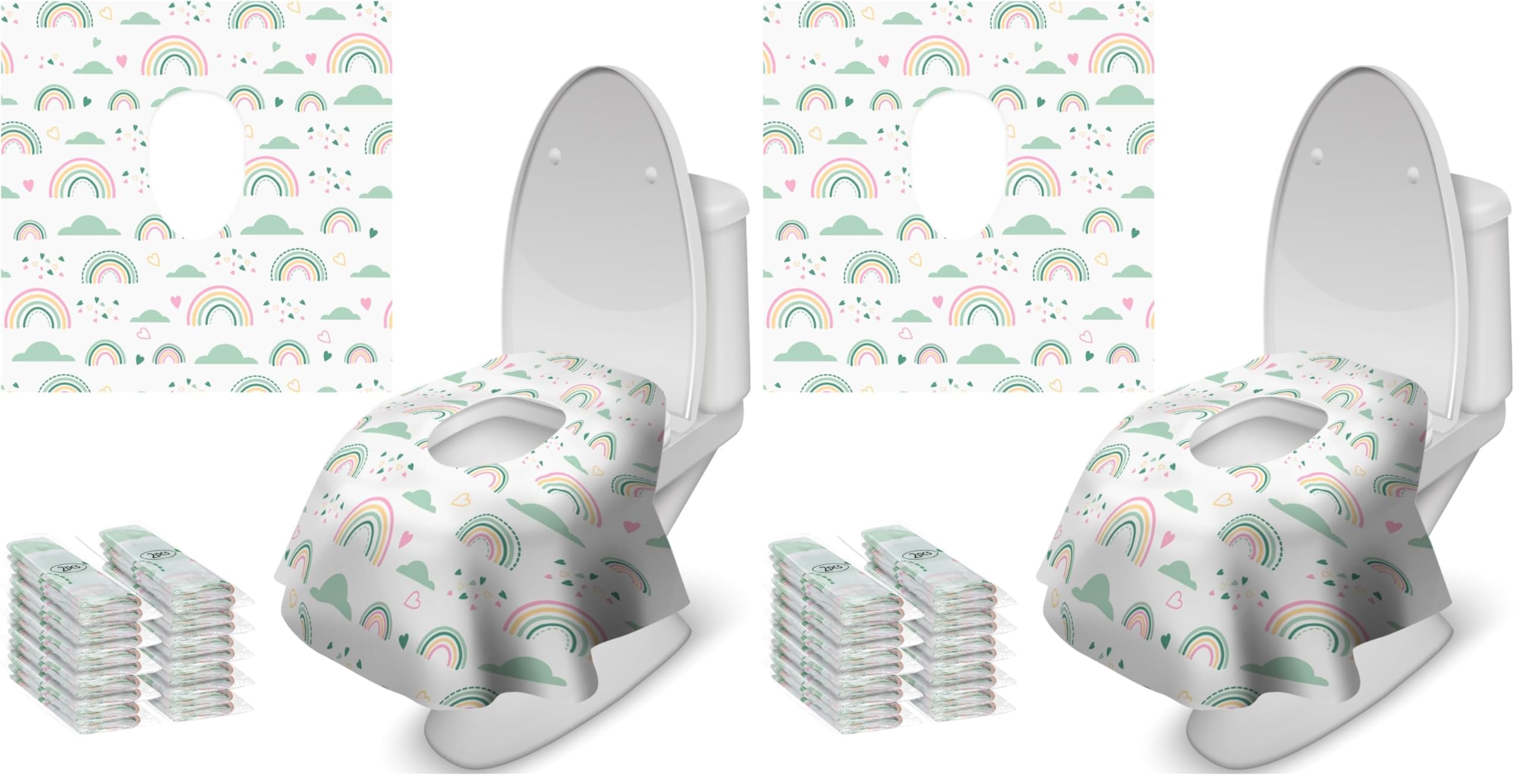 Easy To Use: Pull out one disposable toliet cover, unfold and reveal the 2 adhesive tabs, then put it on the toilet seat. So easy to use in public restrooms while potty training or just using in general to protect your child