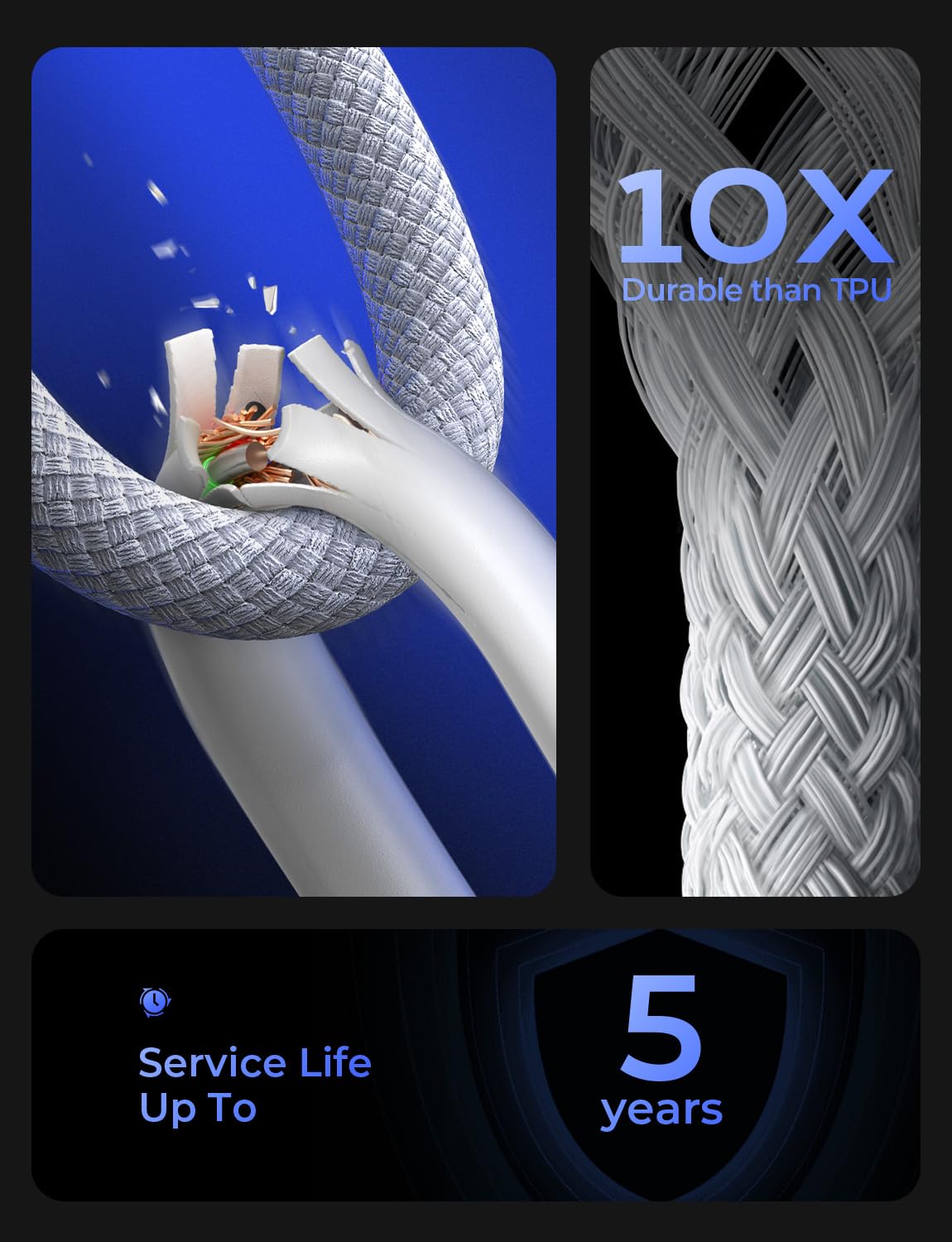 【Green Recyclable Materials】 The LISEN USB C Cable you rely on most are braided from 48 strands of recyclable cotton yarn material. This braiding design also helps to prevent tangling and damage from bending and twisting. Using recycled materials is one of the ways we can lower the carbon impact of our products, since these materials often have a lower carbon footprint than materials from primary sources.