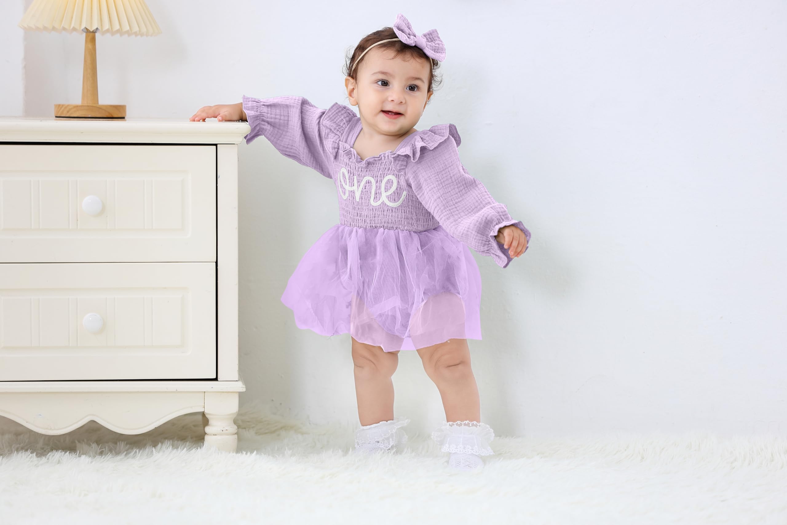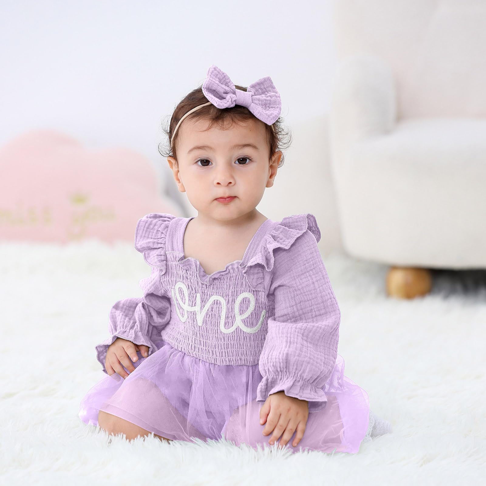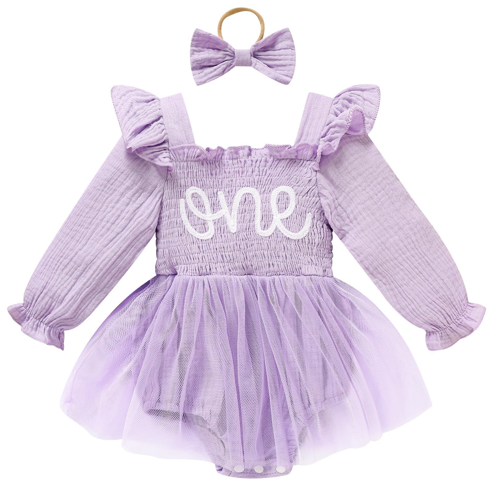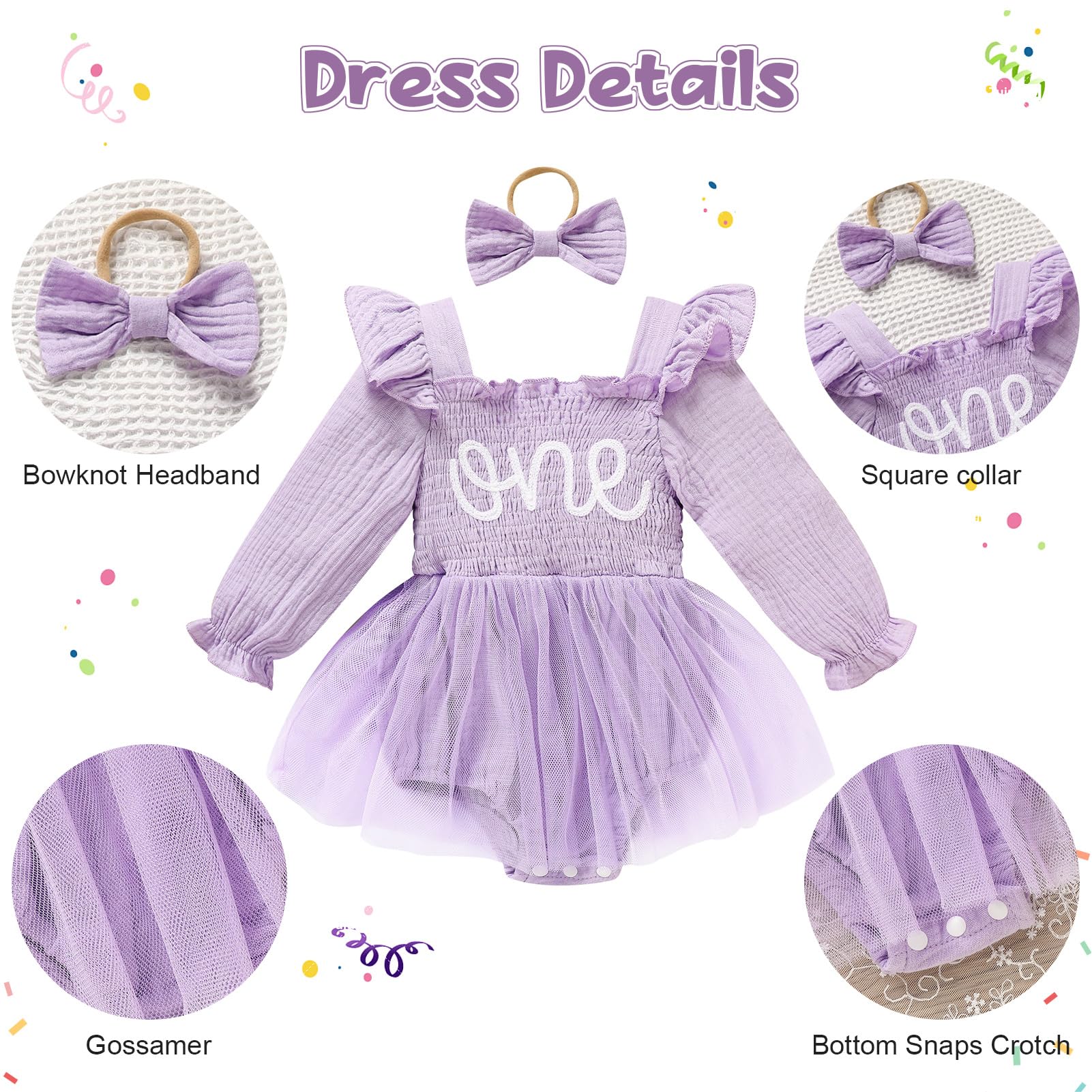Design: Newborn baby girl playwear romper dress with long sleeve, solid color, multi-layered tulle, Snap leg openings for easy diaper changes, easier morning for novice mother.Cute princess 1st birthday outfit, fashionable and adorable embroidery ONE printed themed birthday clothes perfect for creating beautiful memory of her first birthday.