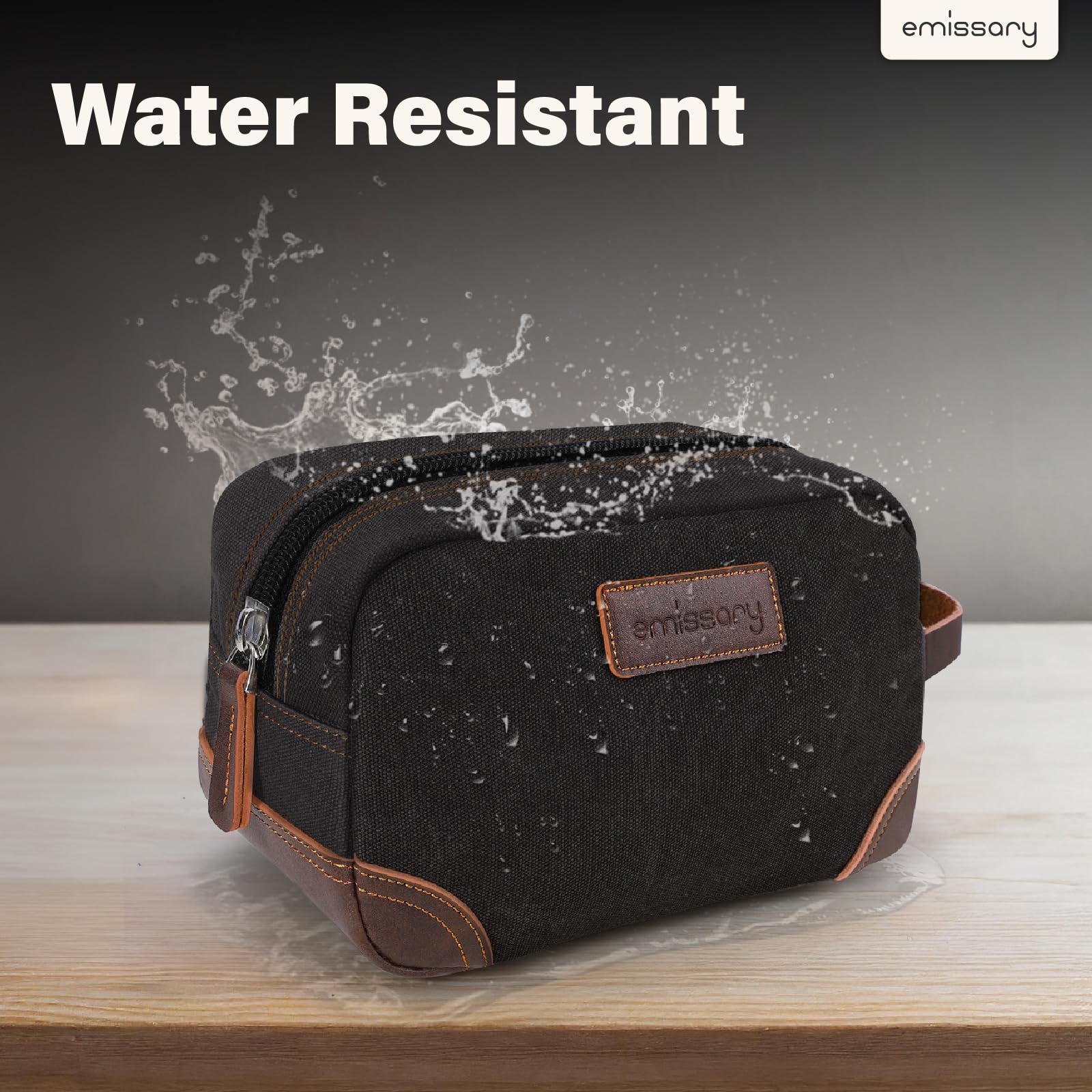 HIGH-QUALITY DURABLE MATERIAL: This exceptional toiletry travel bag by emissary is made of canvas and PU leather, which is known for its lightweight yet durable qualities, the perfect combination for traveling; This specific material is water resistant, making it safe for use in environments where it may become wet; Making this the perfect bathroom bag, shaving bag, and travel dopp kit