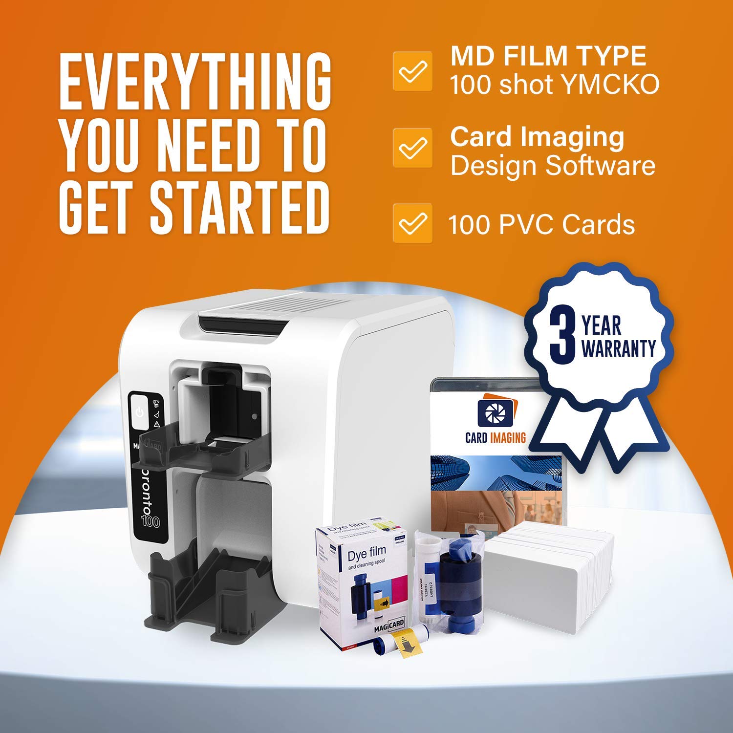 𝗪𝗛𝗔𝗧'𝗦 𝗜𝗡𝗦𝗜𝗗𝗘: Includes printer, Color ribbon, 100 PVC cards, and Card Imaging design software