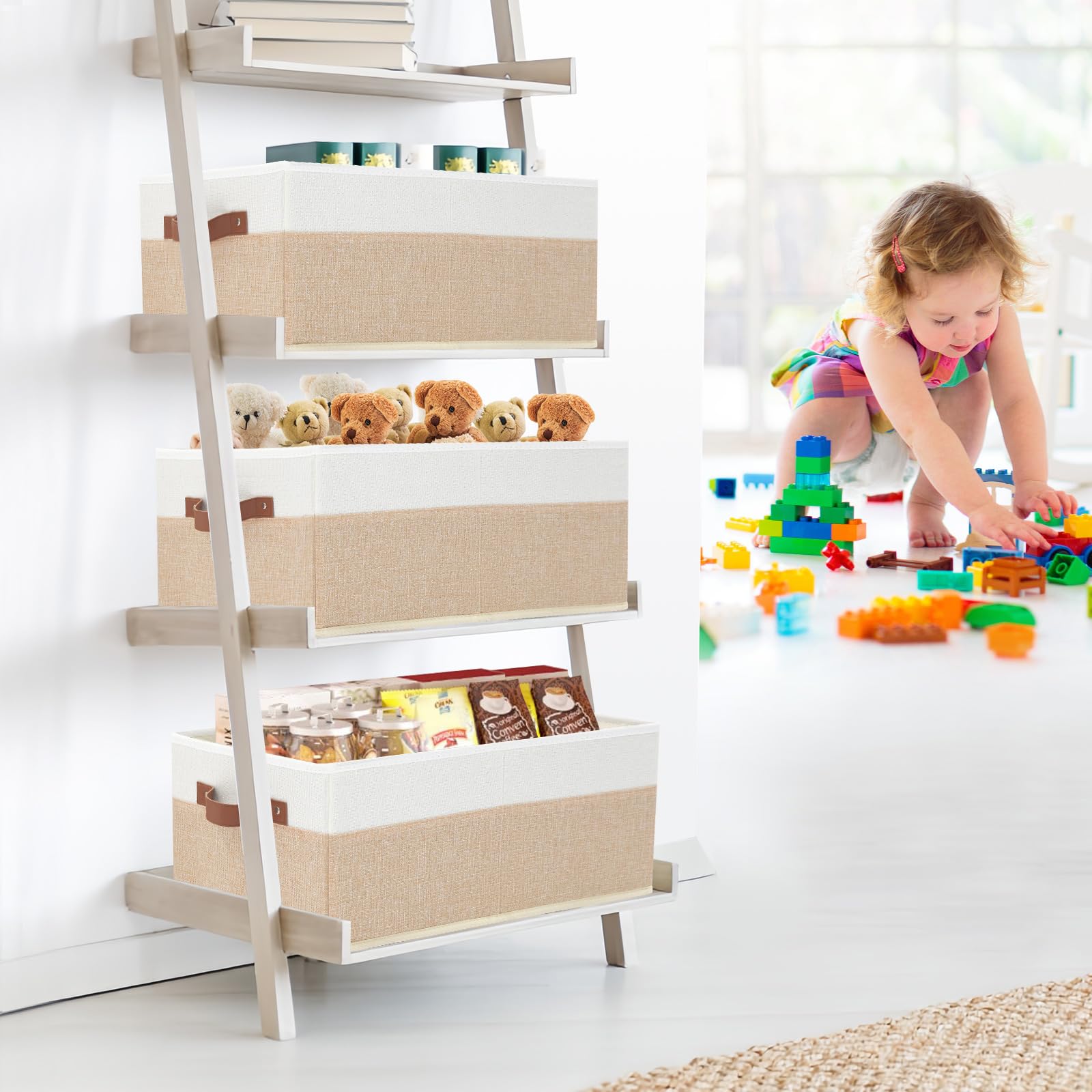 Product Specification Color: Begie Package Quantity: 3 Pack External material: Polyester linen Upholstery Material: Non-woven fabric Construction Material: Environmentally cardboard Size:18.9 x 11.02 x 7.87 inches / 48 x 28 x 20 cm. Highlights Rivets Reinforcement Soft Leather Handles : These sewn-in leather handles have a smooth, comfortable feel, It is easy to grab, making the storage bins easy to carry. High-Quality Material : Made of heavy-duty cardboard side panels and the inserted bottom plate, durable, breathable and Eco-friendly Collapsible : You only need to insert or remove the bottom boards to fold or unfold those storage bins Multi-Purposes : Bedroom : Jeans, pants, shorts, underwear, socks, scarves Kitchen : Snacks, dry foods storage Living room: magazines, books, holiday decorstorage Nursery : Diapers, baby clothes, bottles storage Kids Room : Toys, plushes, games, arts and craft supplies storage Bathroom : Hand towels, beauty and hair care essentials storage Laundry room: Cleaning supplies, detergent, cloths storage Office : Document storage General Sundries Storage 3 pack closet organizer bins can help you divide the sundries in your life into several categories so that you can easily find various types of items TIPS Please wipe away stains with a damp cloth and air dry for daily maintenance; There may be a smell of "new" when first opening the package; please air these closet bins out in a well-ventilated place for a few hours. If you have any problem or advice concerning our products, please do not hesitate to get in touch with us through Amazon.