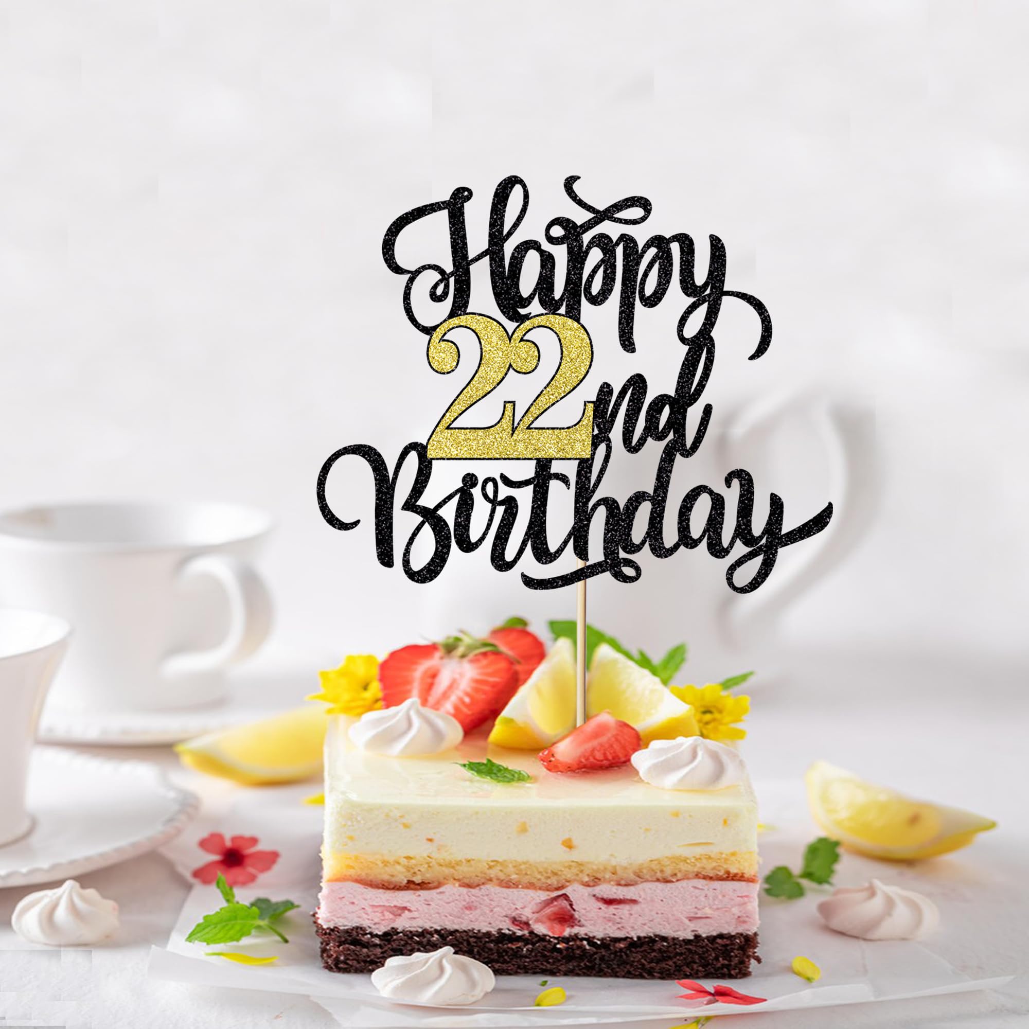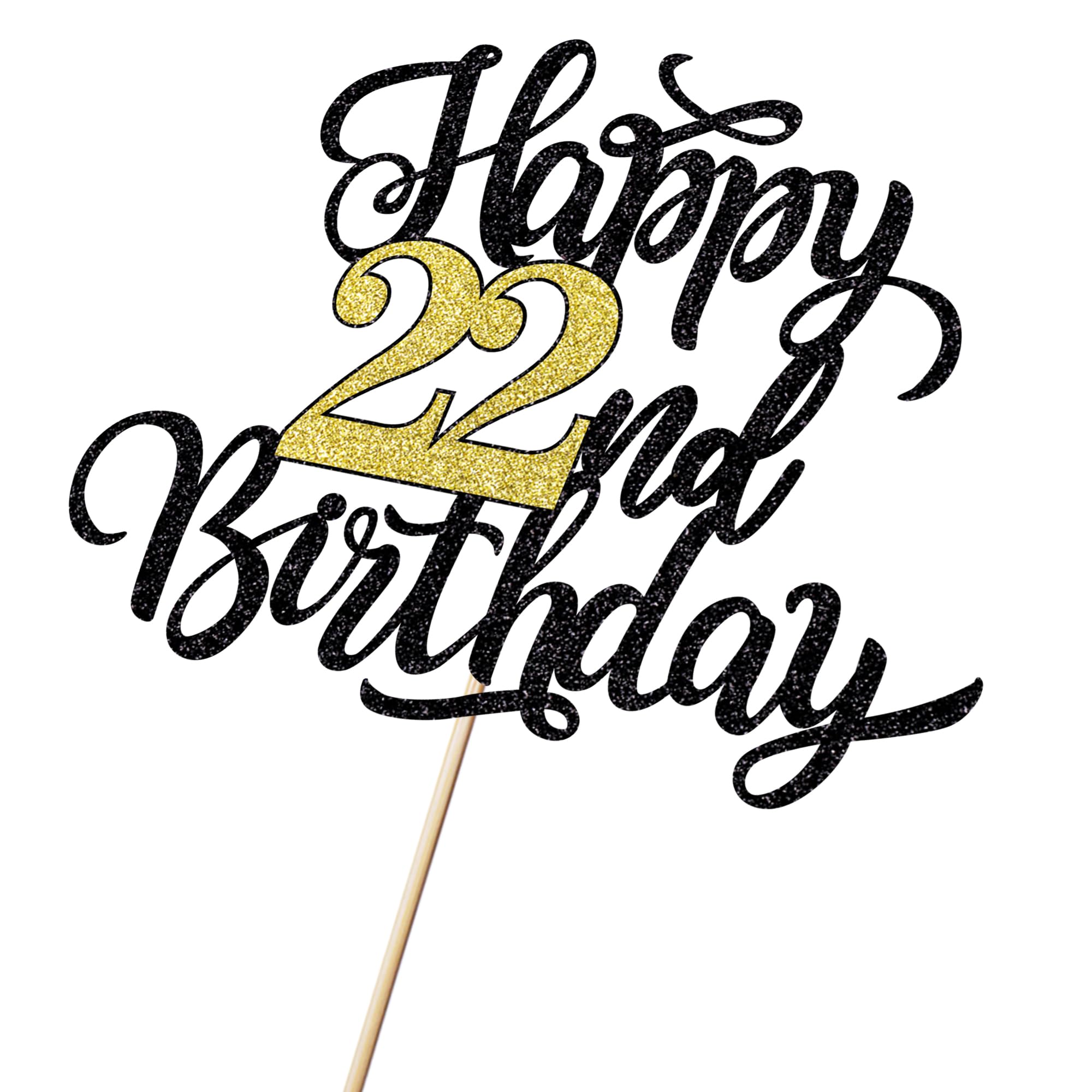 Happy 22nd Birthday Cake Topper, Black Gold Glitter Birthday Cake Topper, 22nd Anniversary/ 22nd Birthday Party Decoration Supplies
