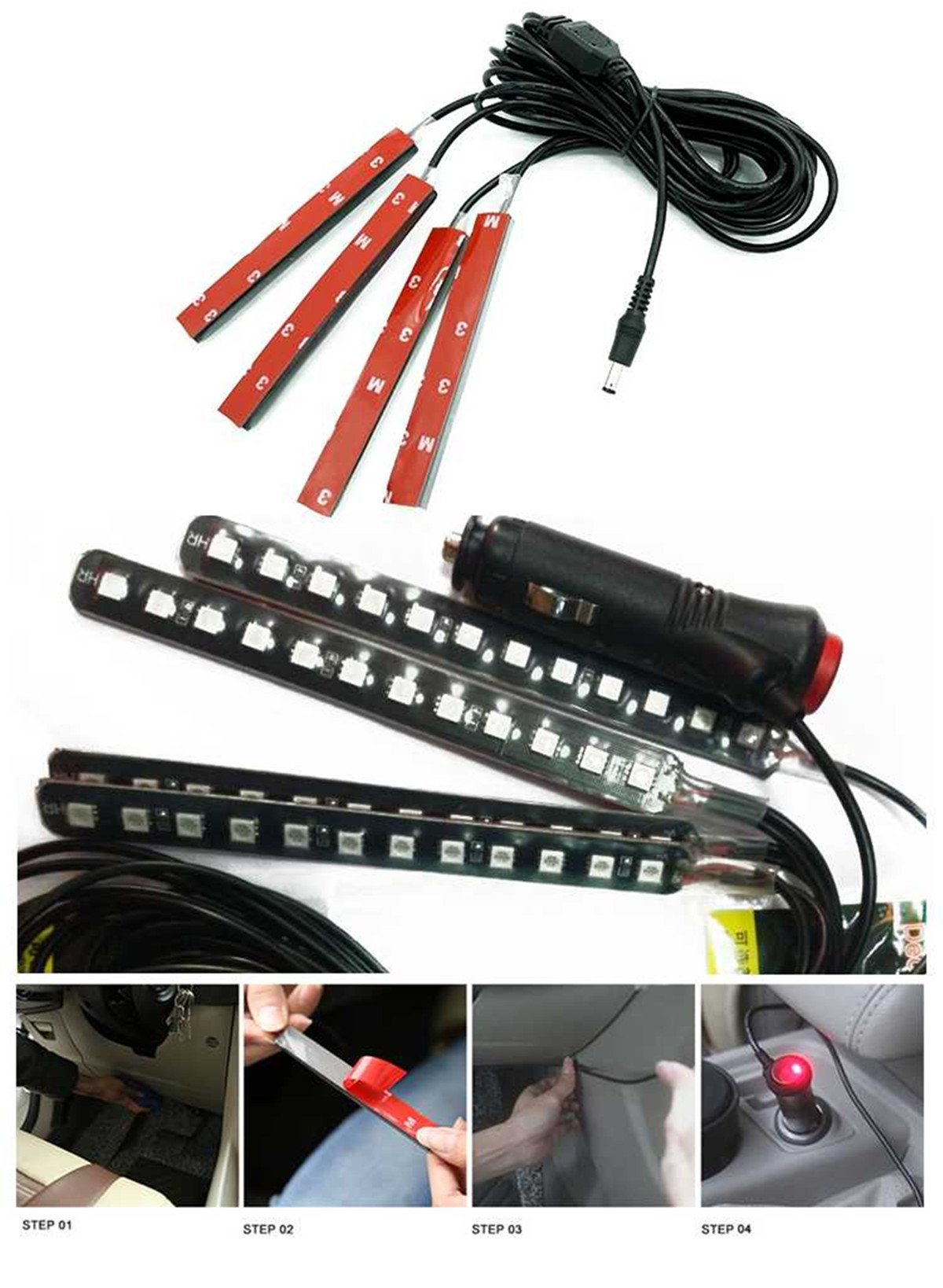 💞Installation is easy with the 3M double-sided tape the the back of each LED strip makes for a secure install. No need to modify the wiring,simply peel off the tape cover on each LED strip and apply under the seats or in the footwell area.(please clean the installation area before installation).