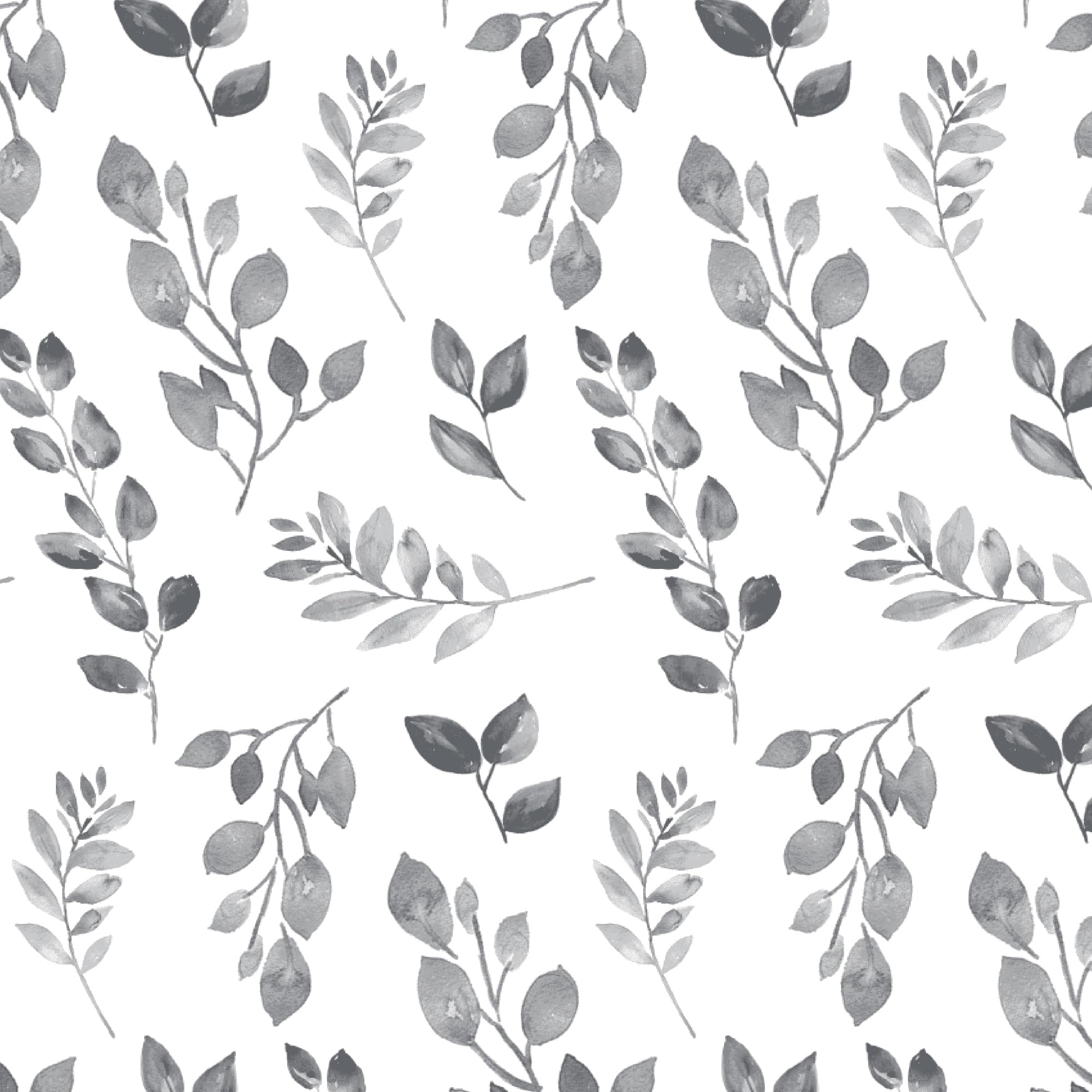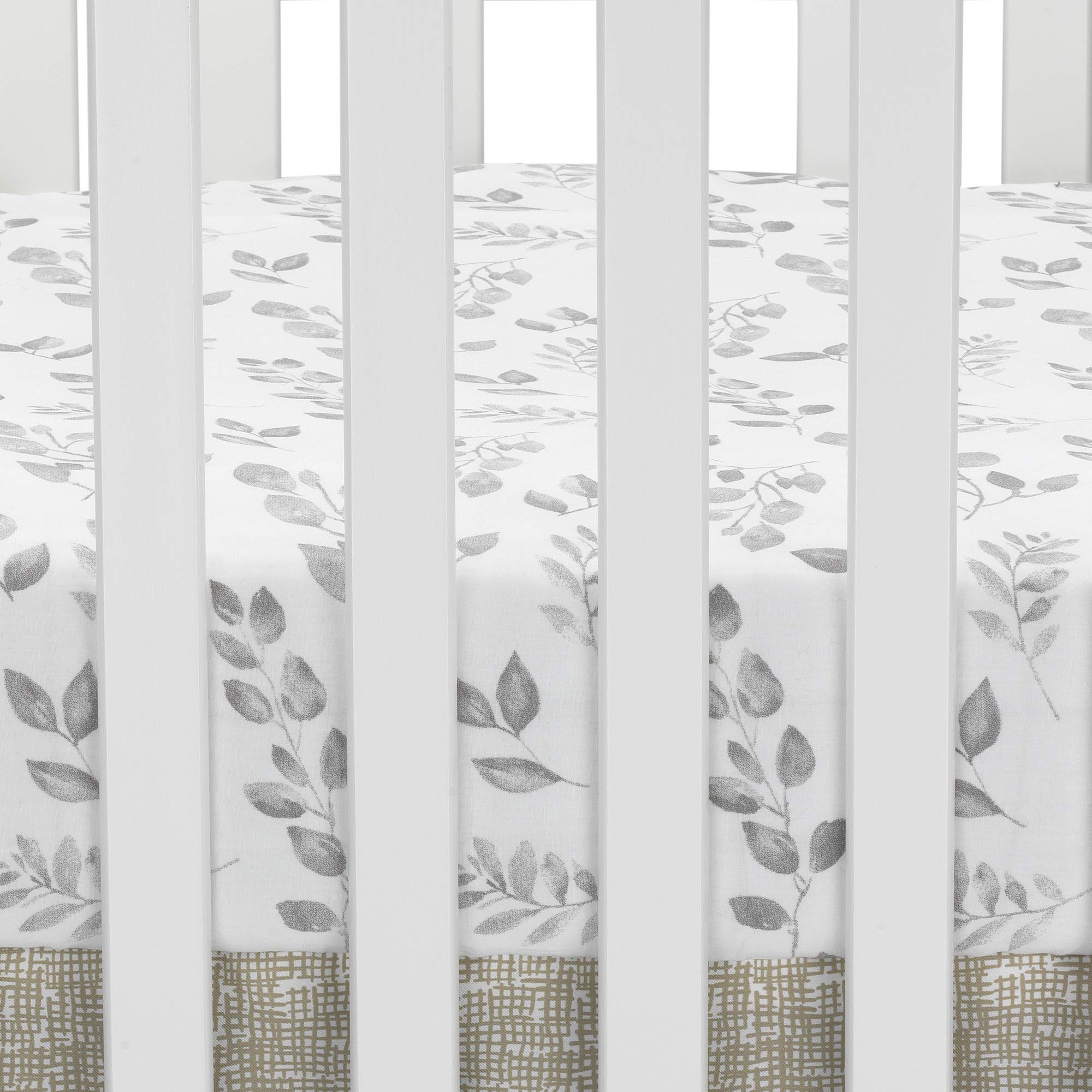 A lovely watercolor leaf design in shades of gray decorates the 100% cotton fitted crib sheet