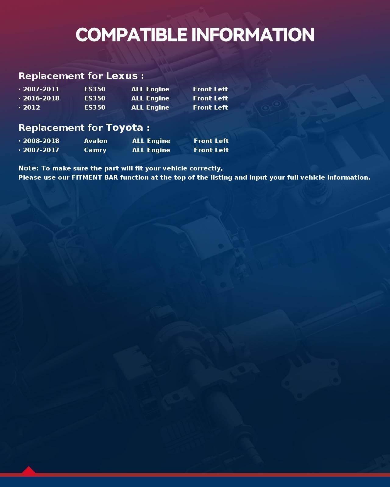 [Vehicle Fitment]: Compatible with Toyota Camry 2007-2017, Lexus ES350 2007-2011 V6 3.5L, 2012 V6 3.5L Before 09/2011, 2016-2018 V6 3.5L USA Built only, Toyota Avalon 2008-2018 --- Front Left Driver Side