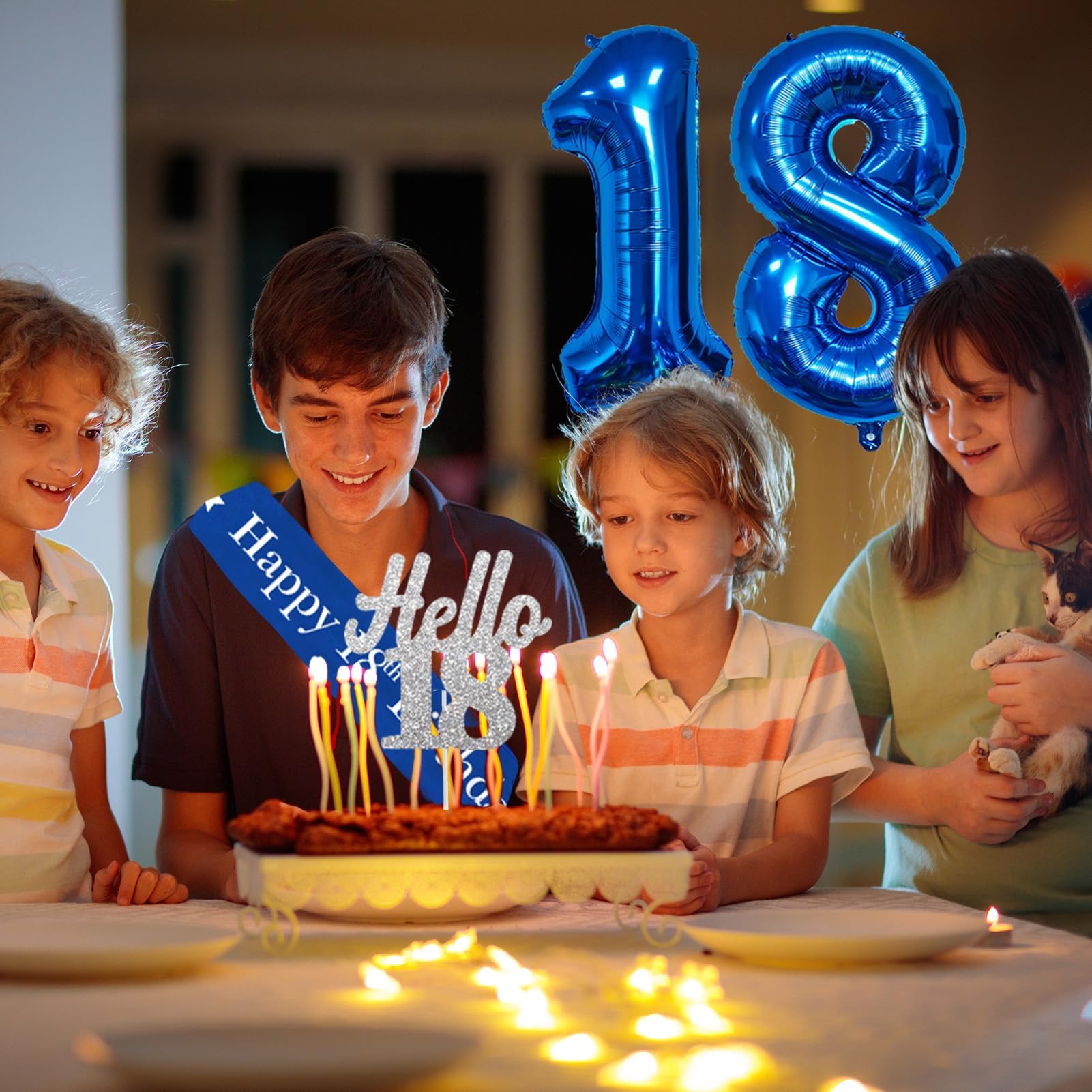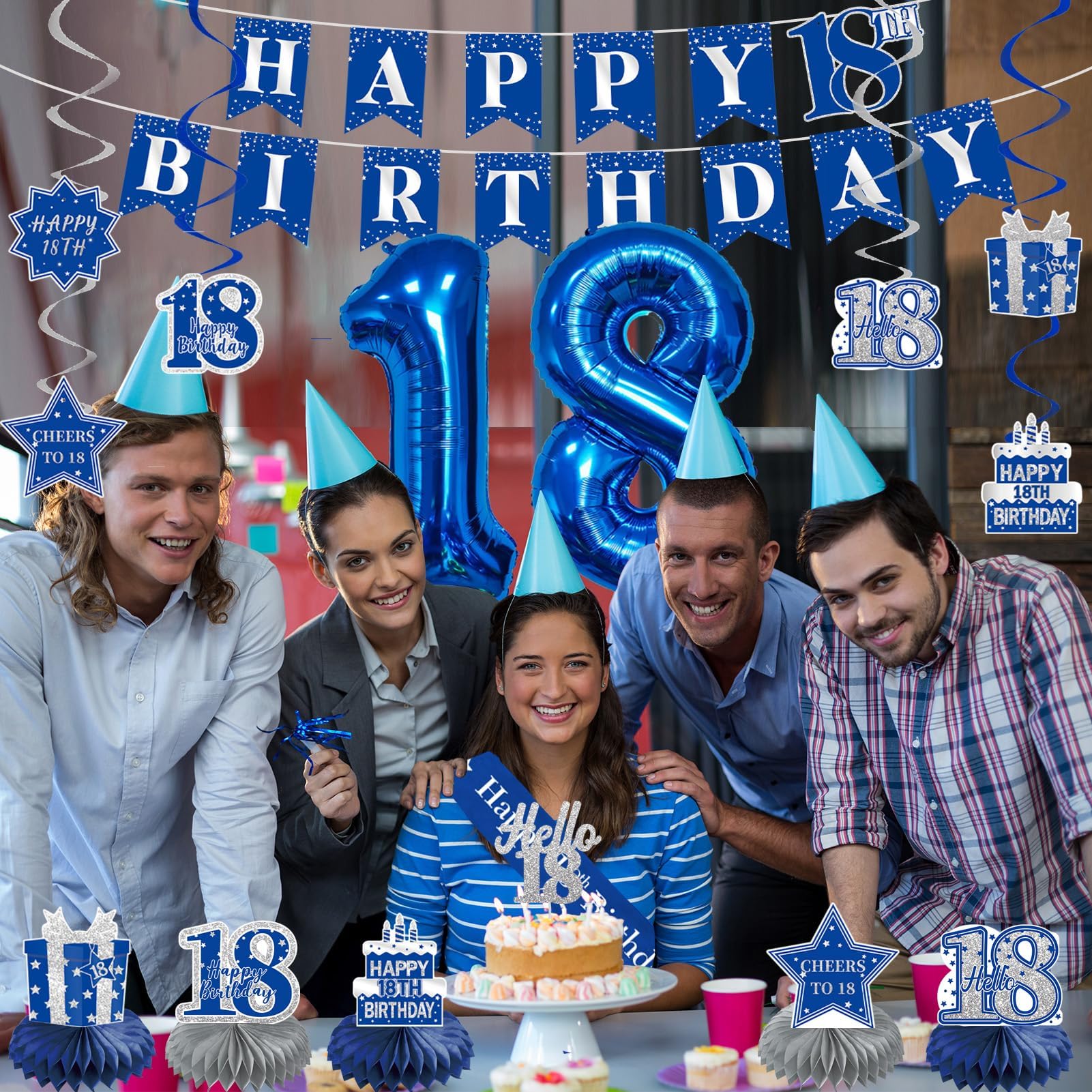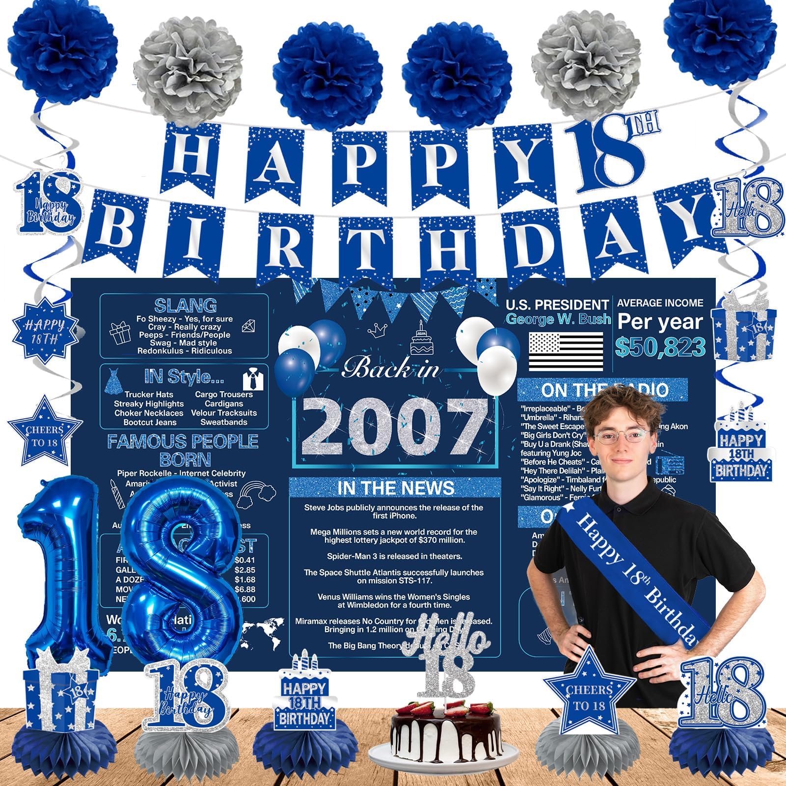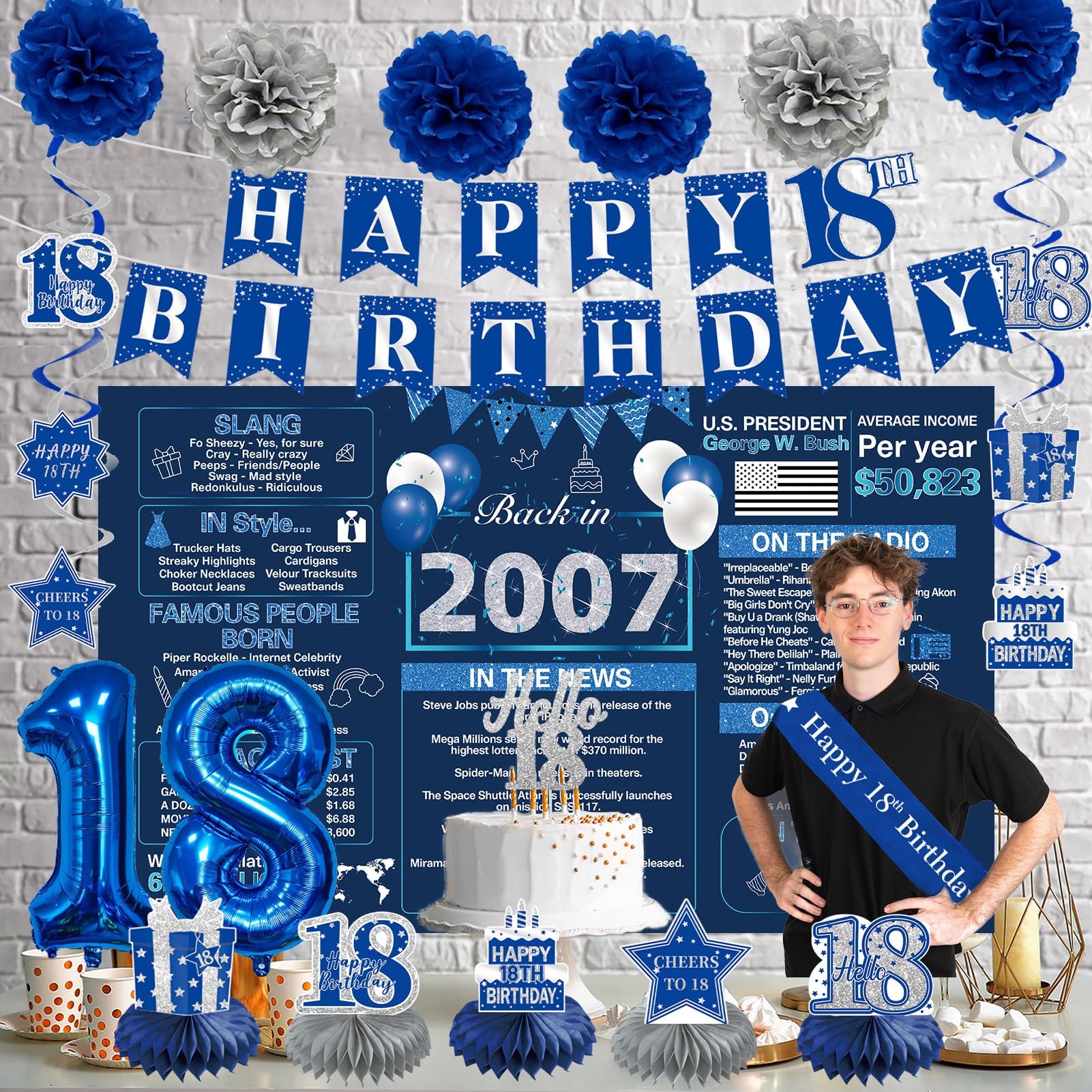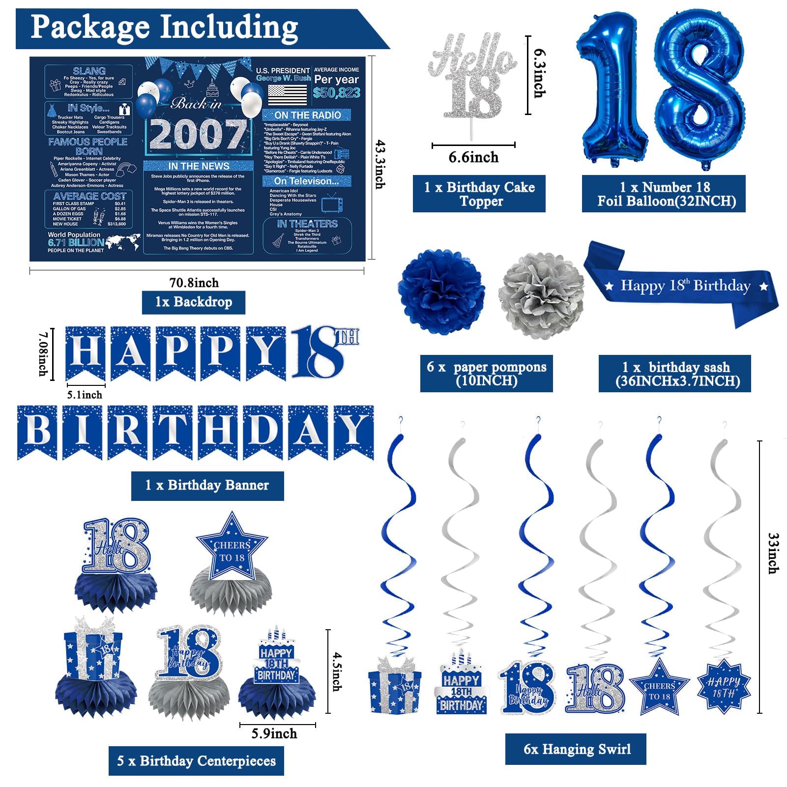 【18th Birthday Decorations】- Use the blue and silver back in 2007 birthday banner as the perfect shooting background, paired with a hanging swirls, paper pom poms, cake topper, sash, and number 18 balloon. Using them to create unforgettable time for your 18th birthday party, creating a pleasant atmosphere for your friends and family, will be the perfect way to take photos at the party.