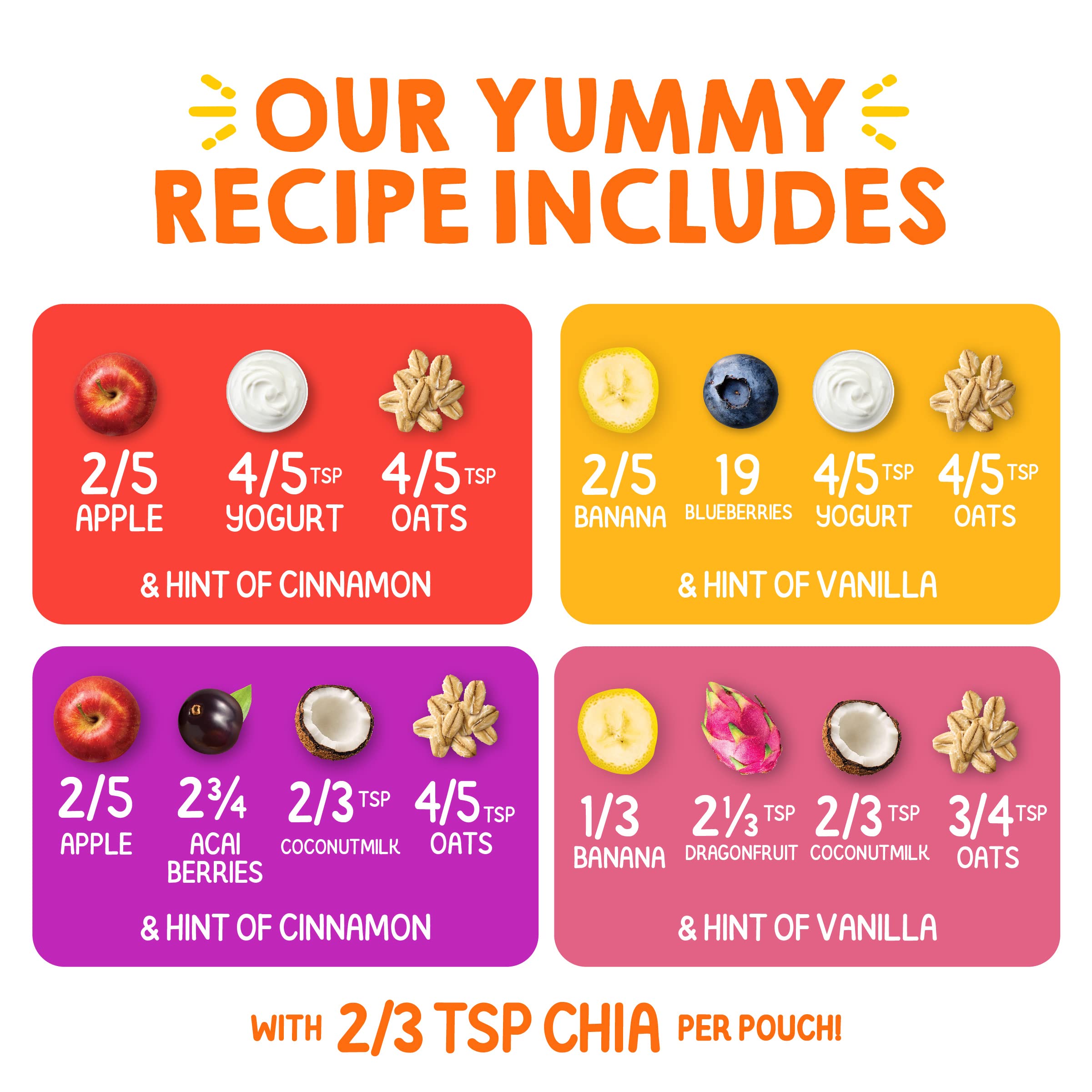 Super Morning Pouches: These breakfast blend combine fruits, oats and super chia. Each pouch has 600mg of omega 3s (ALA) from chia and 2g of fiber for a super start to your tot’s day