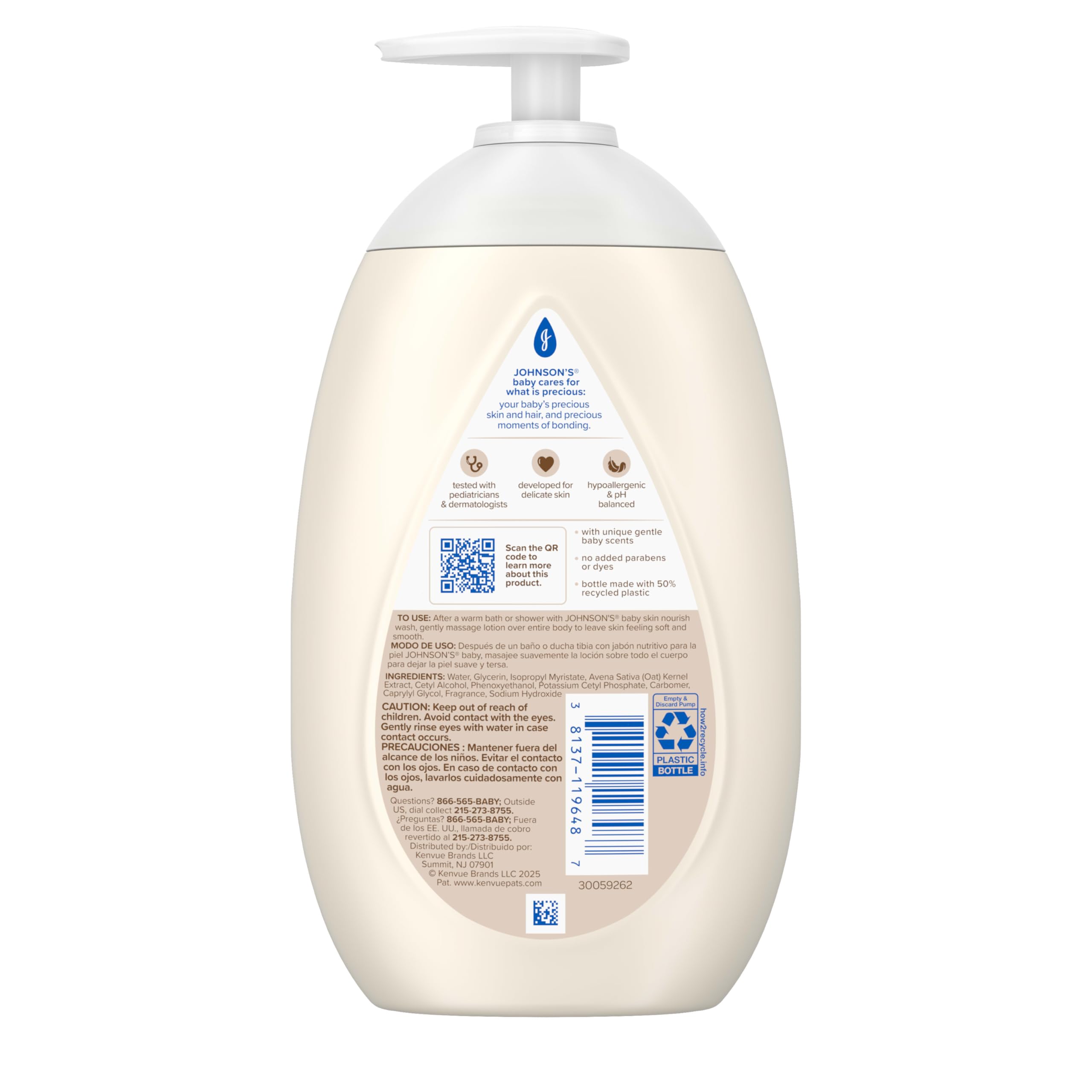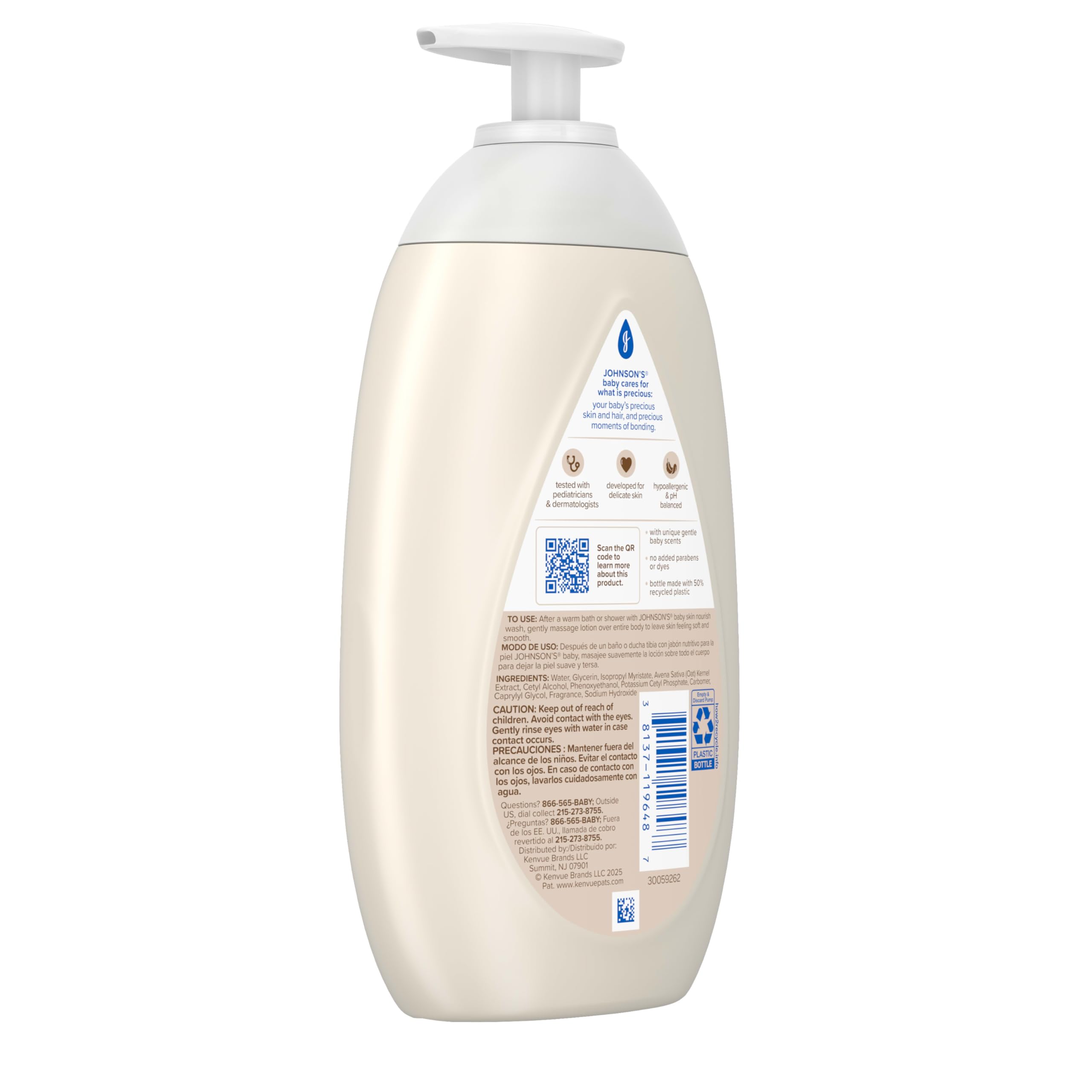 Gently hydrate baby's skin for 72 hours until baby's next bath with Johnson's Skin Nourish Baby Body Lotion with vanilla & oat scents. Suitable for babies, kids & adults, the baby lotion developed for delicate skin moisturizes, protects from dryness, & strengthens skin. This infant baby body lotion with unique baby scents is formulated to be gentle, never harsh. The hypoallergenic body lotion from the World's #1 Baby & Child Care Brand* is dermatologist & pediatrician tested & contains no parabens or dyes & is packaged in a bottle made with 50% recycled plastic. Johnson's Baby cares for what is precious: your baby's precious skin & hair, & precious moments of bonding. To use, after a warm bath, gently massage the body lotion for kids & toddlers over entire body to leave skin feeling soft & smooth. *Source: Euromonitor International Limited; Beauty & Personal Care 2025 ed. As per Baby & Child-Specific Products Category; all retail channels; value sales at RSP; 2024 data.
