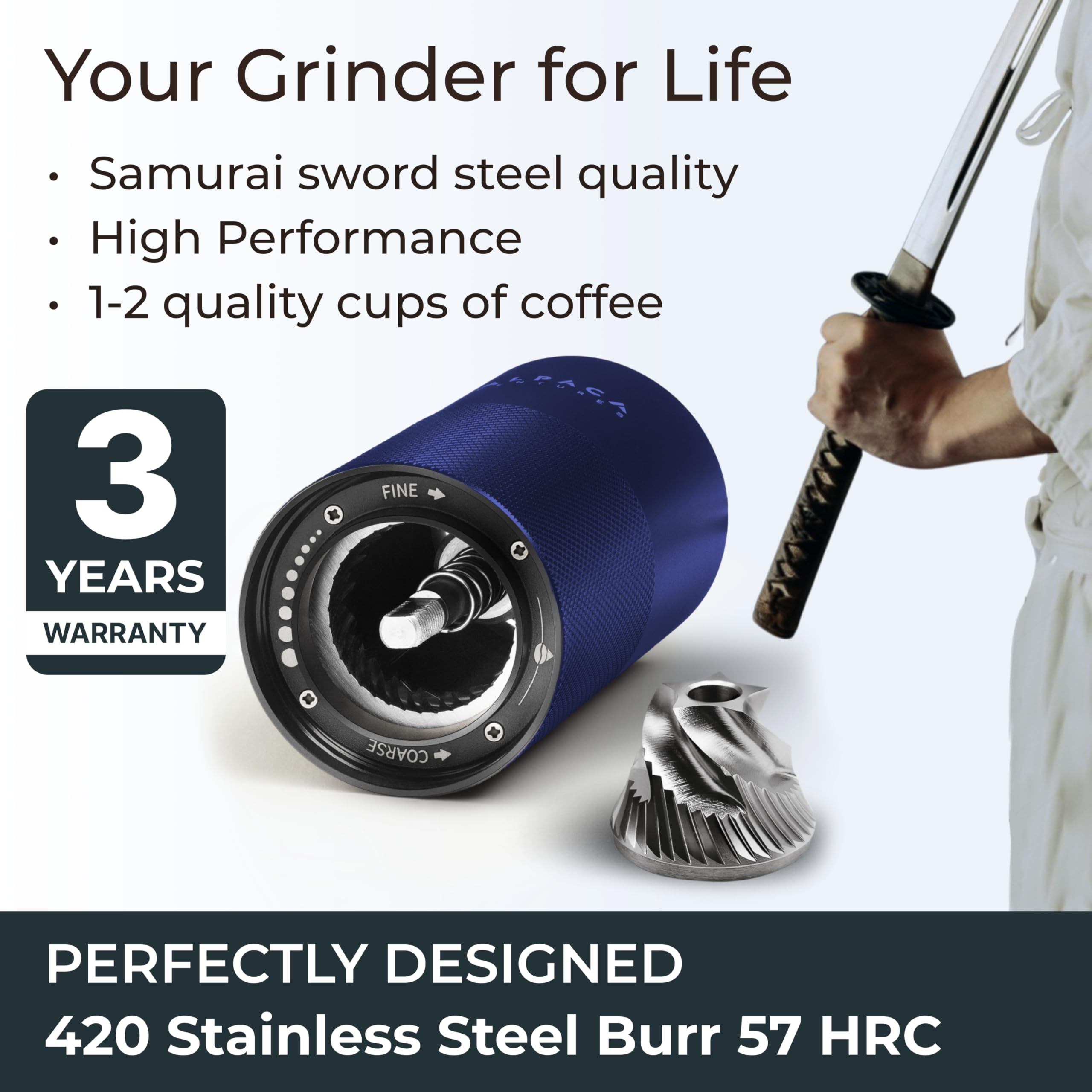 HIGH QUALITY DESIGN – Coffee burr grinder made of 420 stainless steel. No worries about rust. The crank is solid and sturdy, and it’s just the right length to give you enough leverage to make grinding easy. Coffee grinder fixed with dual bearing design for easy grinding. Coffee grinder burr made with signature air-craft grade material to handle any adventure. Get coffee powder for your coffee press.