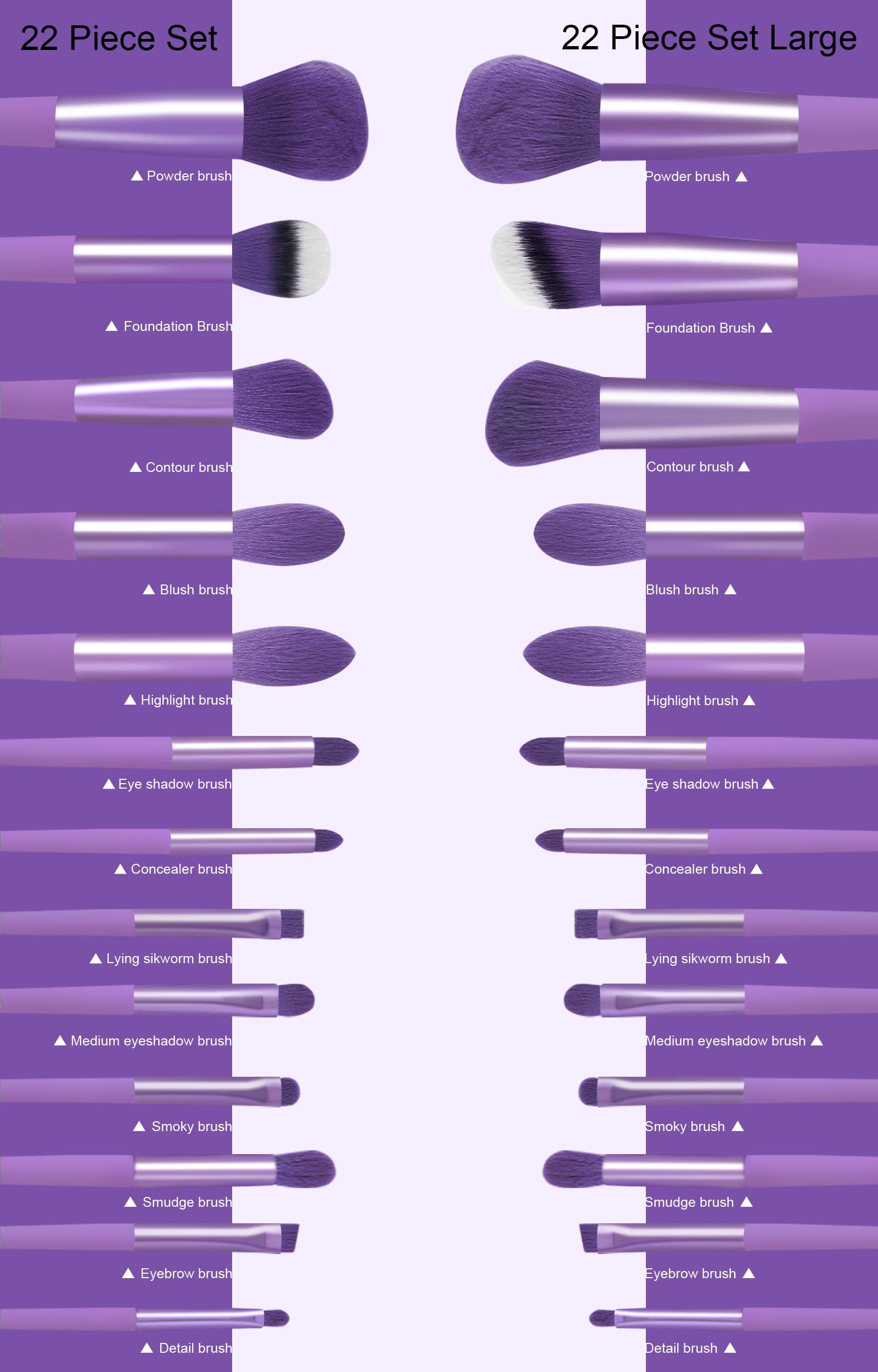 We have made combination Kit to meet various makeup needs.Make your makeup more convenient,Every beauty lovers should have a makeup kit such like this!!! Note: This set have two sizes(22 Piece Set and 22 Piece Set Large). Compare their differences see picture 4. The Regular brushes are suitable for beginners, The Large brushes are more suitable for professionals Please confirm your size before placing an order. Tips: If the logistics squeeze or packaging causes the bristles of the brush crooked, you can wash it and then use a hair dryer to straighten the bristles, so that the bristles will return to straight and even become more fluffy and good looking!
