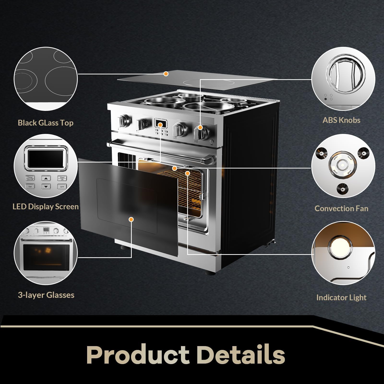 30-Inch Electric Range with 4.8 Cu.Ft Convection Oven, 4 High-Powered Burners, 6 Cooking Modes, Smooth Glass Surface, Built-In Timer, Freestanding Professional Kitchen Stove.