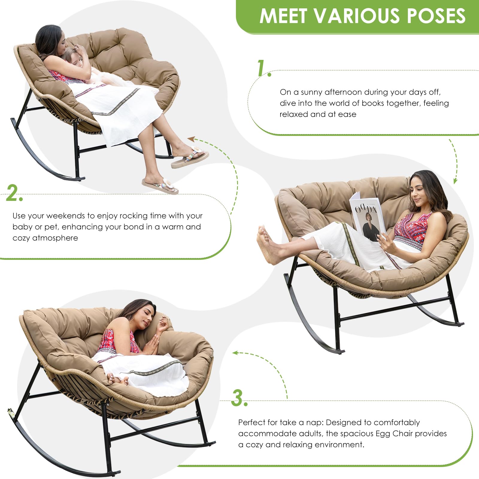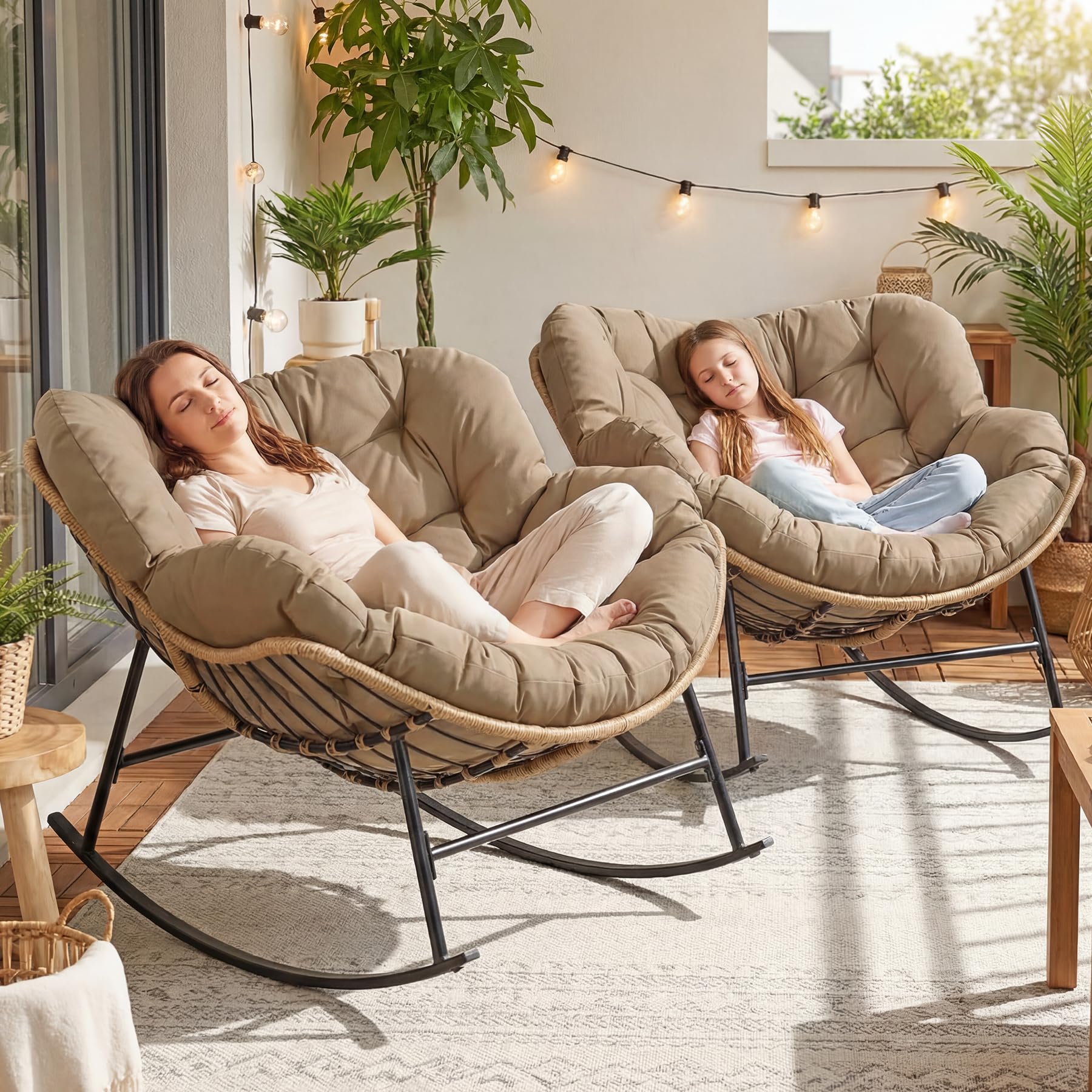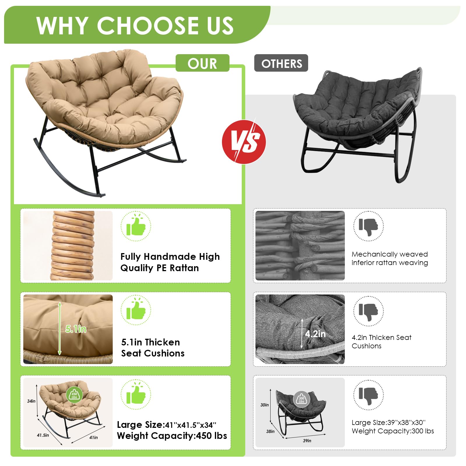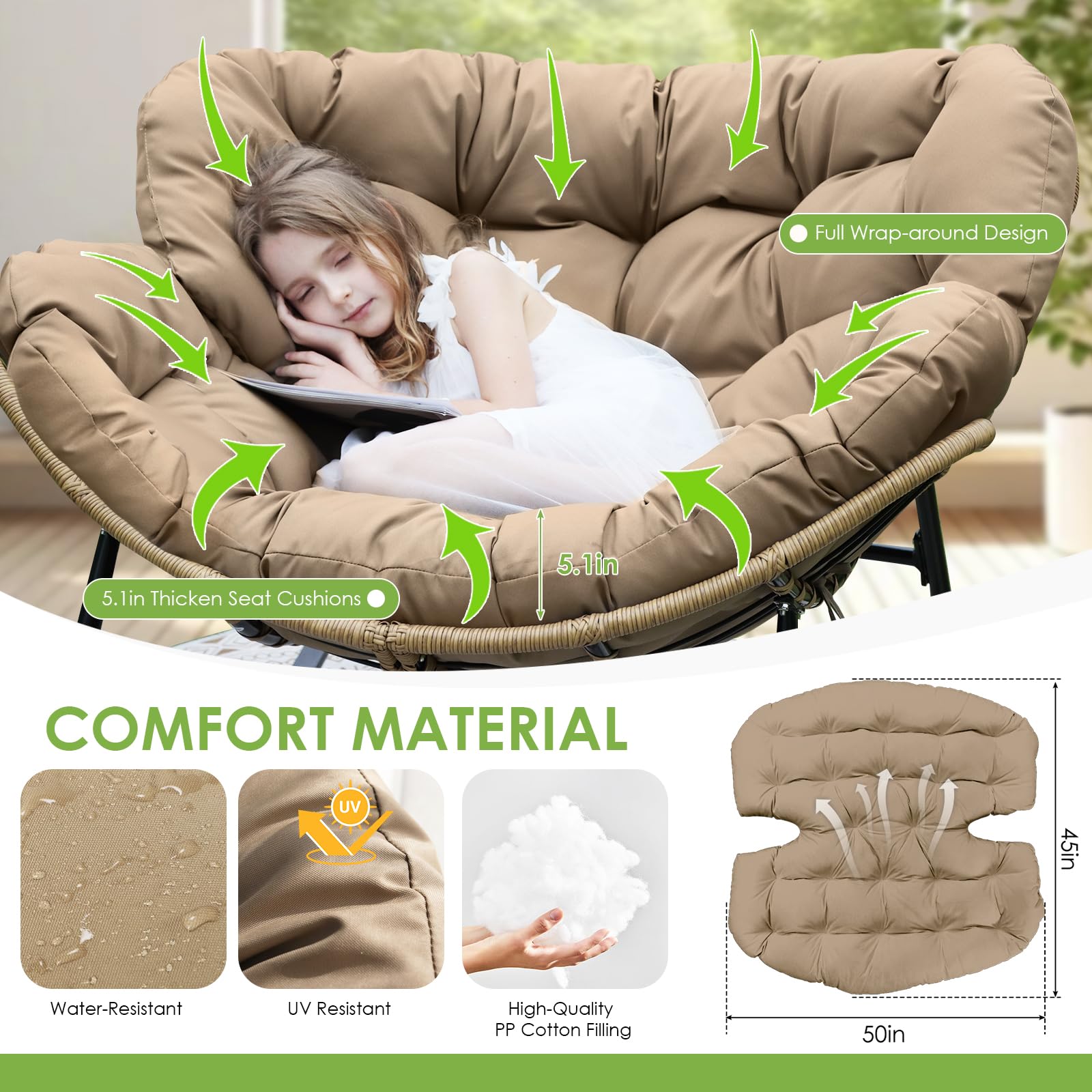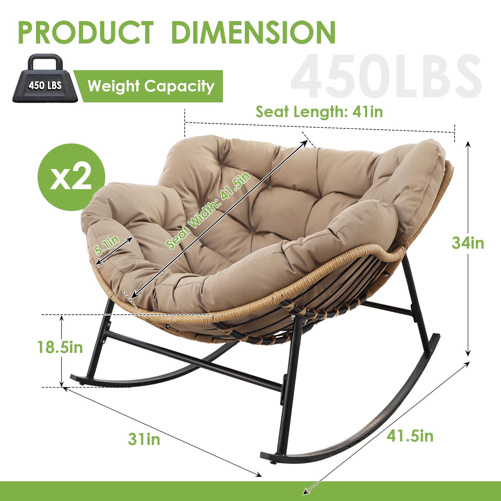 Heavy Duty Stability: Built with a reinforced alloy steel frame and treated with e-coating for superior resistance to outdoor elements, this large rocking papasan chair supports up to 450 lbs; the engineered base creates a smooth 30-degree rocking motion, combining the sturdiness of steel with the soothing glide of ergonomic design; compared with lightweight chairs, this structure feels stable and secure, ensuring years of reliable use on patios, decks, or indoor spaces without wobbling