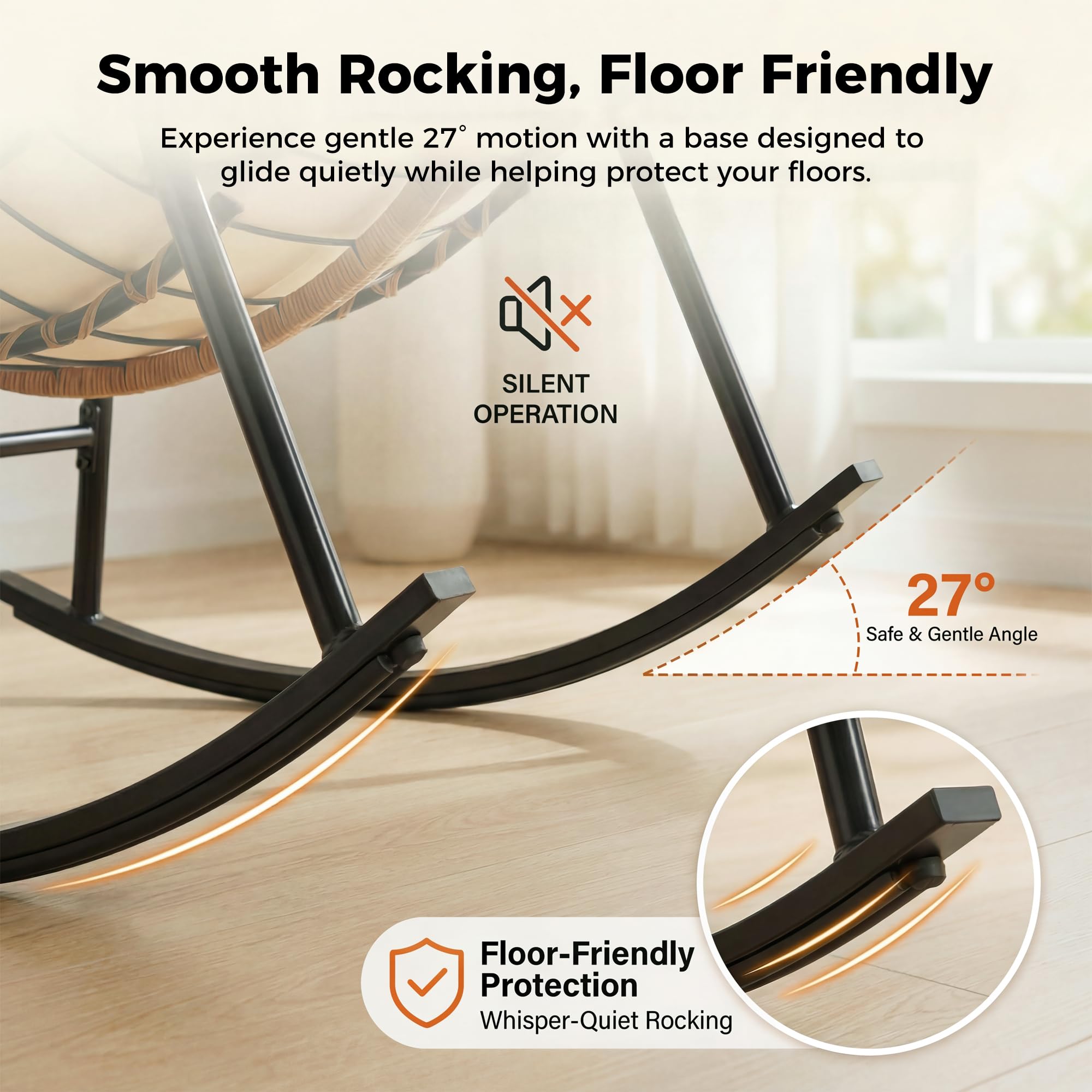 Smooth Quiet Rocking: Equipped with non-slip rubber pads beneath the rocker base, this egg rocking chair provides noise-free rocking that won’t disturb family members or neighbors; the shock-absorption strips also protect floors from scratches, making it suitable for hardwood, tile, or concrete; smooth gliding motion enhances the calming effect of the chair, allowing you to enjoy peaceful mornings, evening movie time, or relaxed conversations in a serene environment without unnecessary distractions