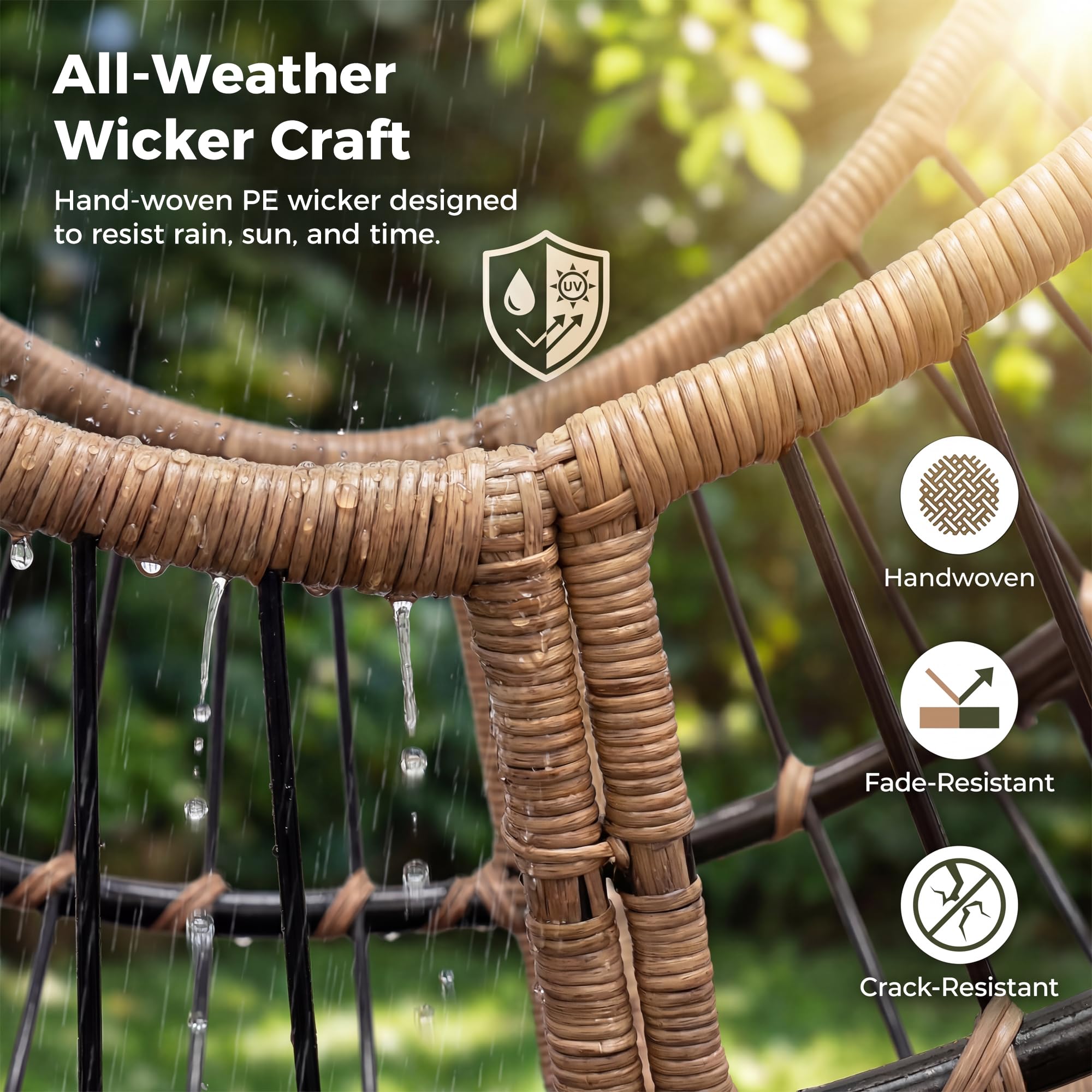Solution-Dyed Fabric: Sun, rain, or shifting humidity—this outdoor papasan rocking chair is built to handle it all; the powder-coated steel frame and handwoven PE rattan stand strong against outdoor conditions without rusting or fading; cushions are wrapped in solution-dyed polyester that resists color loss after extended sun exposure and repels light splashes from morning dew or unexpected drizzle; from the patio to the balcony, porch, or sunroom, it keeps its look and comfort season after season with minimal upkeep