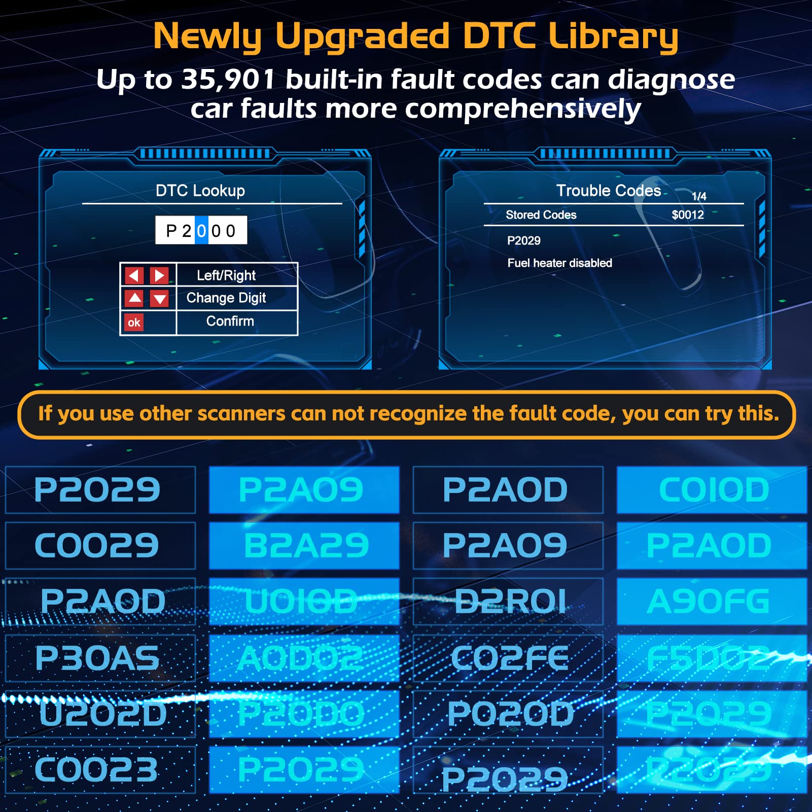 35,901 DTC Lookup: ZM201 car code reader built-in 35,901 DTCs, the old model obd2 usually only have 3,000-10,000. So the ZM201 car scanner has a huge advantage, which means that this obd2 scanner can better help diagnose and solve your vehicle faults. This is a great option if you want to replace or upgrade an existing car scanner.