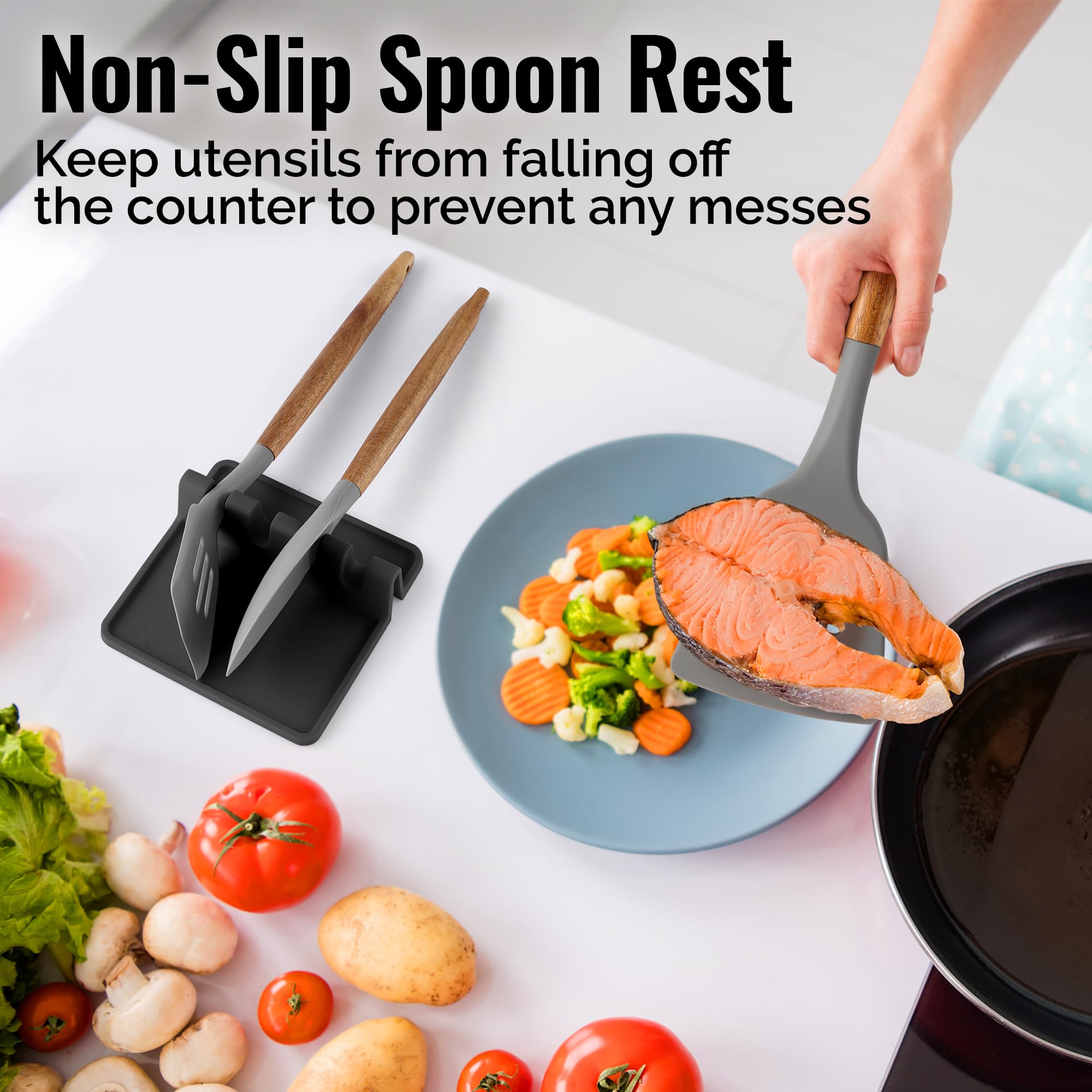 HEAT RESISTANT AND EASY TO CLEAN: Made from food-grade material, this silicone spoon rest can be placed near the stove or countertop without it being affected by heat. It is designed with a non-slip base to prevent it from sliding and causing chaos while cooking. Once you are done with cooking, toss the kitchen tool holder in the dishwasher for a quick cleanup.