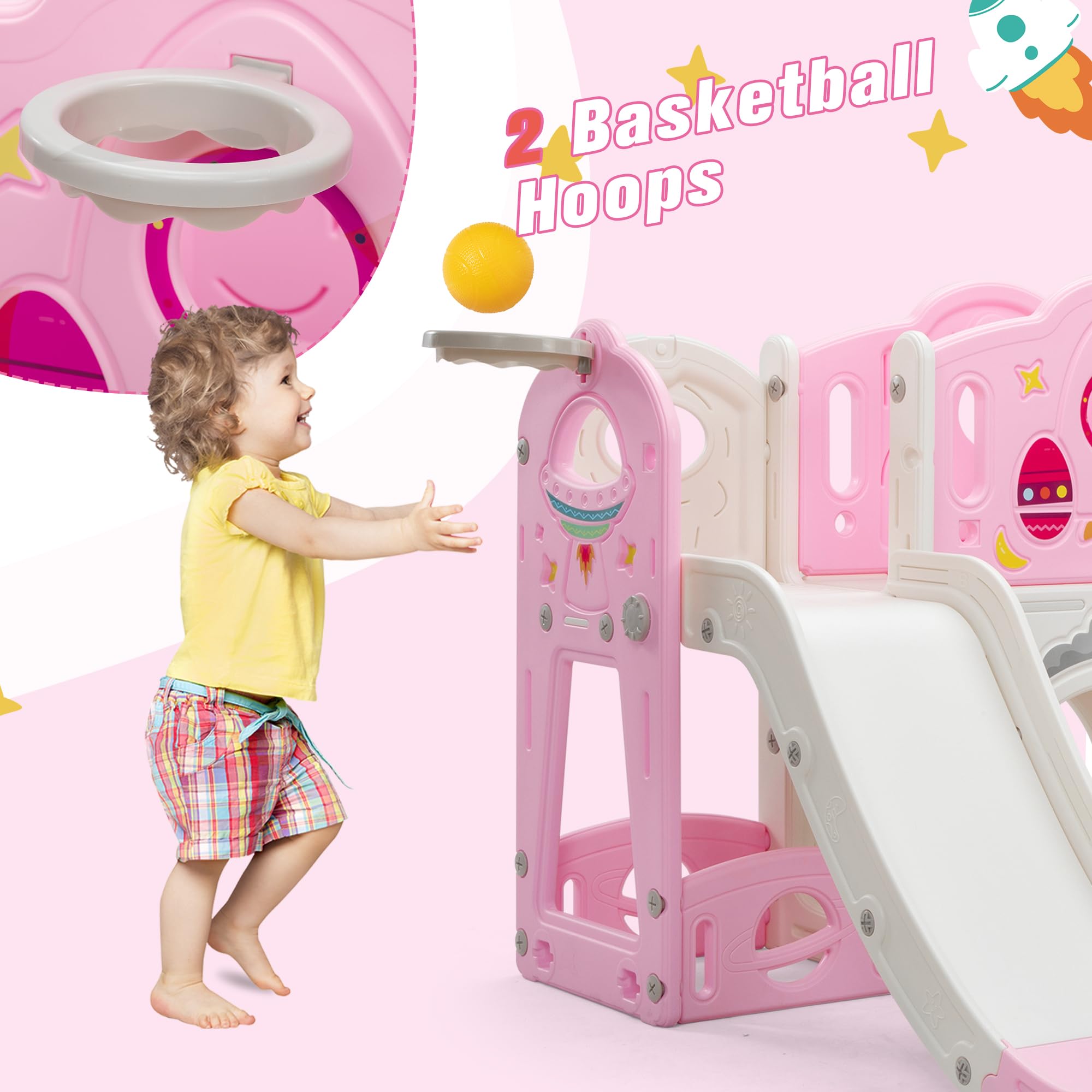 【Infinite Fun Center】: This climber slide transcends the ordinary, transforming into a vibrant playground that contains slide, basketball hoop, telescope, engaging ring-toss and climbing elements. This innovative design invites kids to discover a personalized avenue of enjoyment