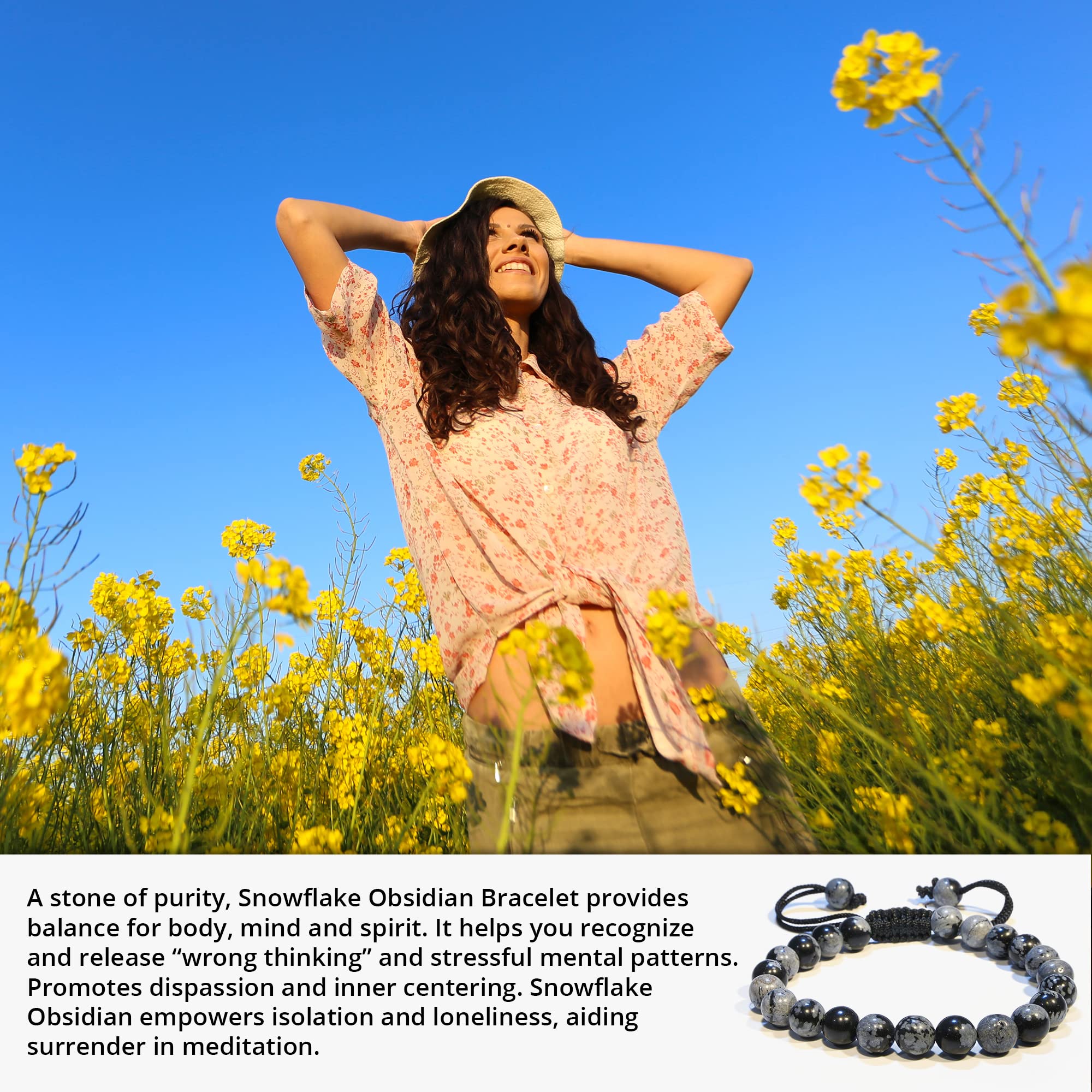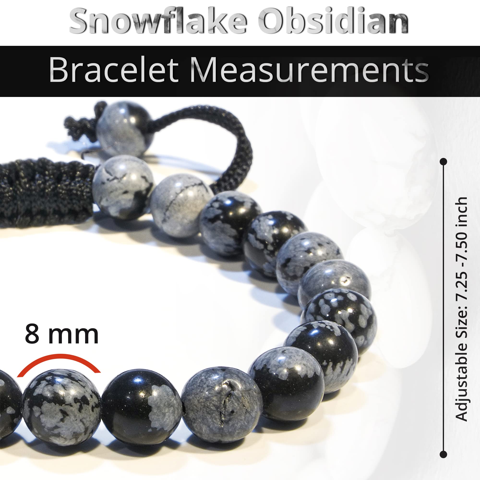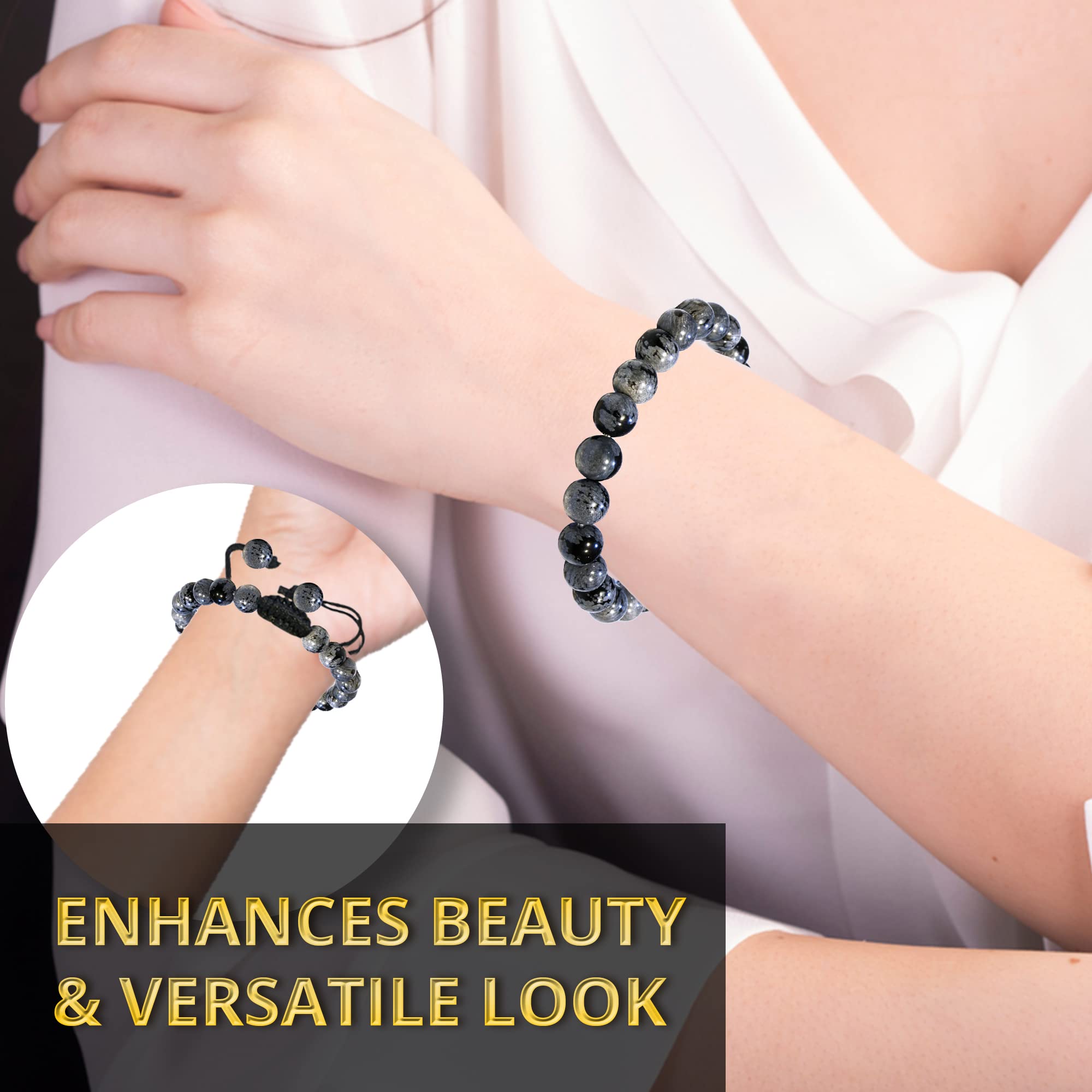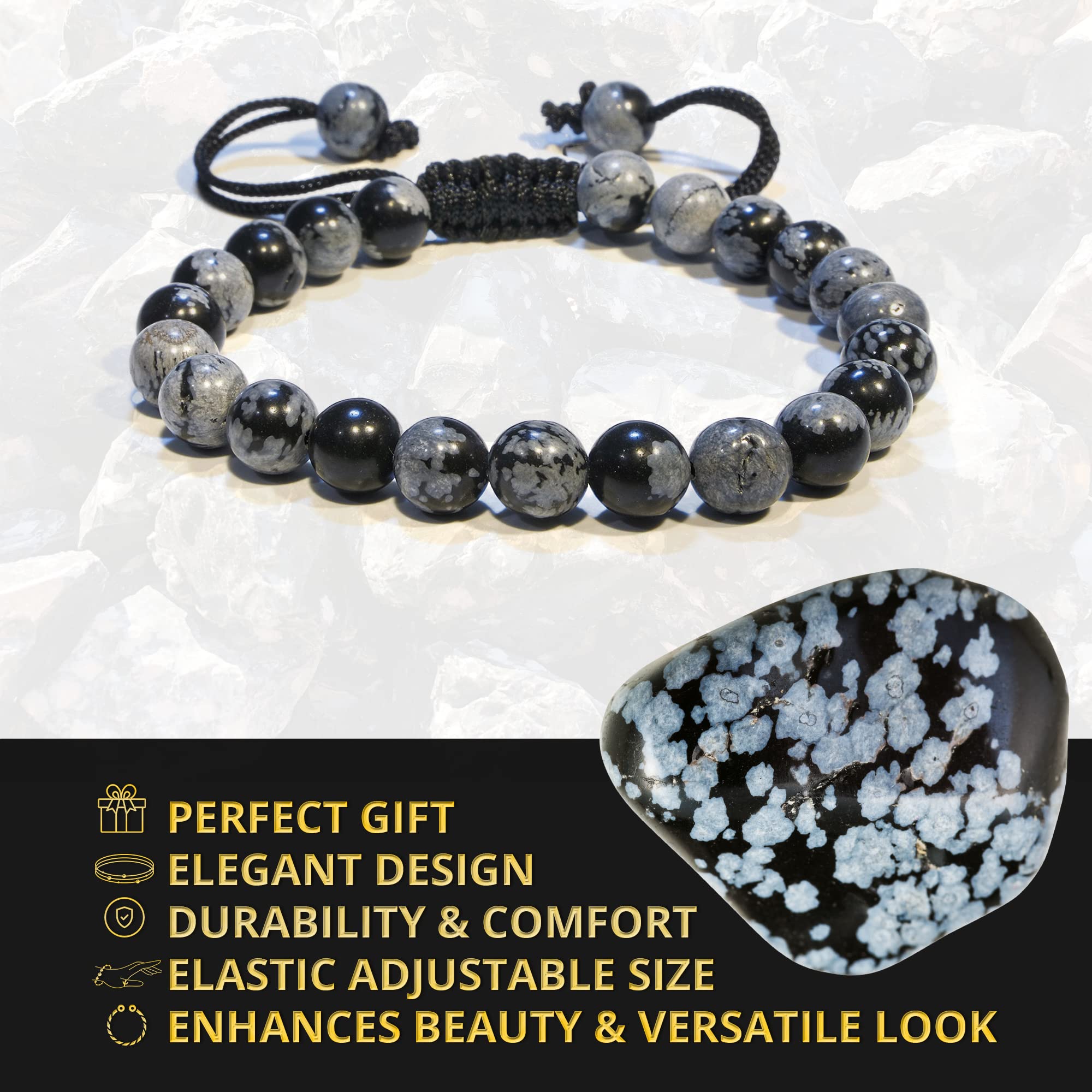 Made with Love: Our Snowflake Obsidian healing bracelets for women and men are made with high-quality, carefully selected real gemstones, smoothly rounded to perfect 8mm beads and an elastic string with macrame closure for comfortable and long-lasting wear.